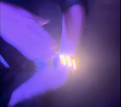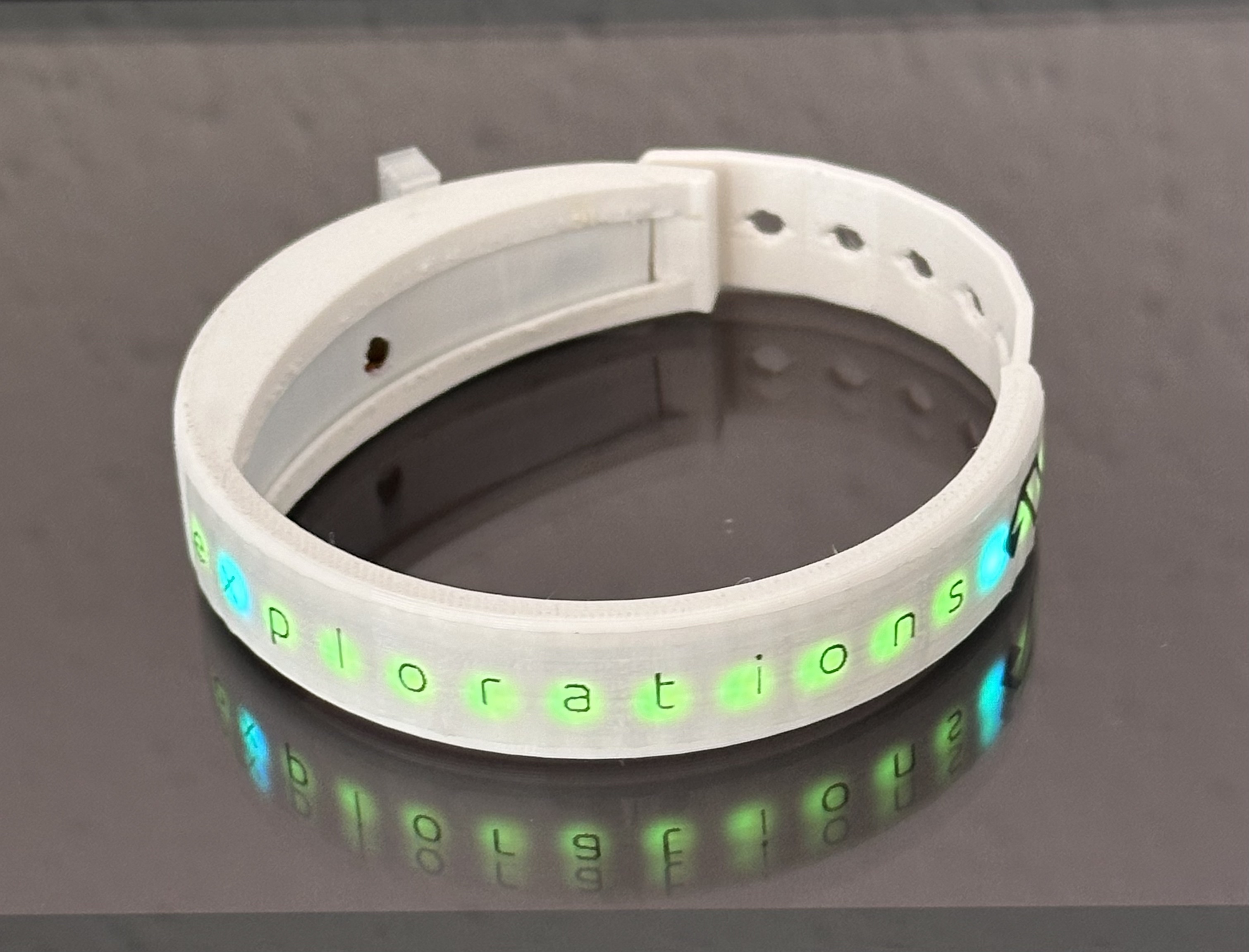 A rechargeable glowing wristband that reacts to music, powered by a thin LiPo battery. The TPU band has 15 LEDs inside. The animations are driven by audio analysis and controlled with a tiny processor.