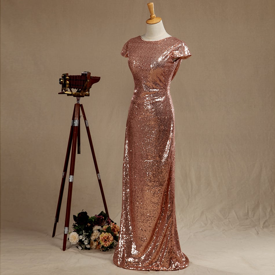 Rose gold Sequined Bridesmaid dress,Cap Sleeves Luxury Sequined Evening dress,Scoop neck Metallic Sparkle prom dress,Cow Back floor length