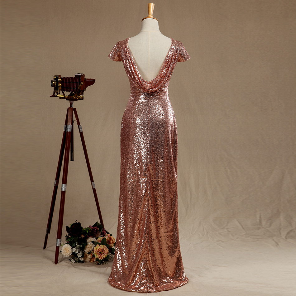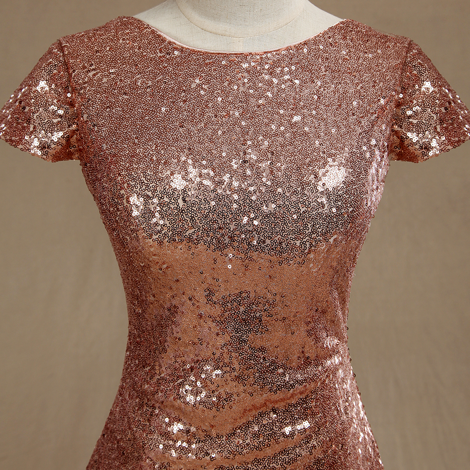 Rose gold Sequined Bridesmaid dress,Cap Sleeves Luxury Sequined Evening dress,Scoop neck Metallic Sparkle prom dress,Cow Back floor length-3