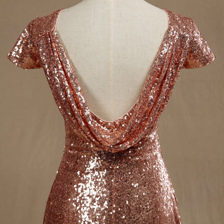 Rose gold Sequined Bridesmaid dress,Cap Sleeves Luxury Sequined Evening dress,Scoop neck Metallic Sparkle prom dress,Cow Back floor length-4