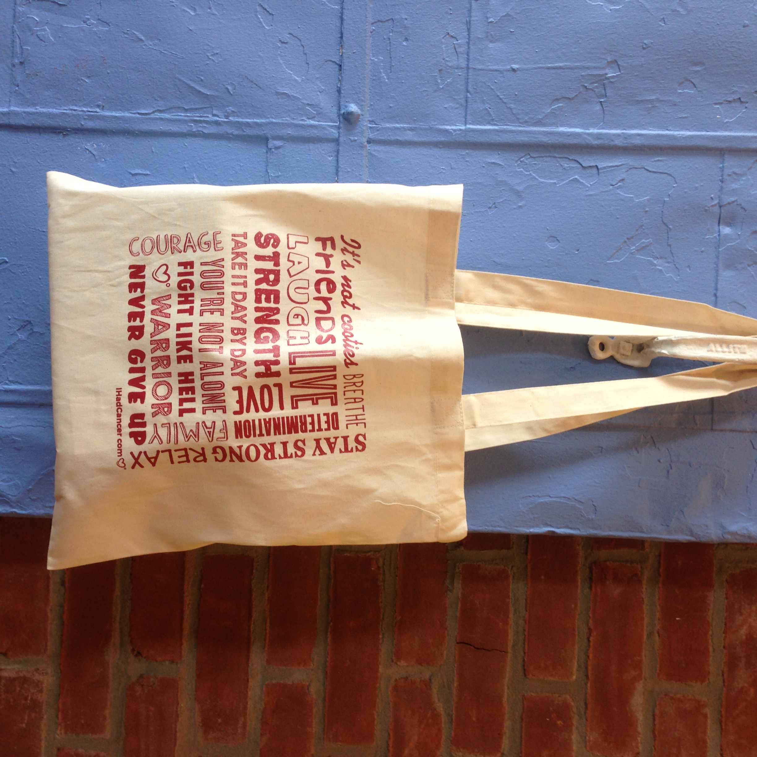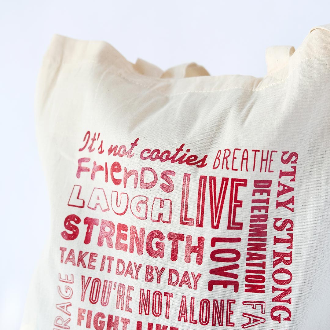 We asked our community what words and phrases helped them get through their journey with cancer. Now you can carry these messages with you to remind yourself, and all other fighters, to never give up. Inspirational Phrases: It's Not Cooties, Breathe, Stay Strong, Relax, Never Give Up, Courage, Friends, Laugh, Strength, Take It Day by Day, You're Not Alone, Fight Like Hell, IHC Warrior, Never Give Up About the tote: 100% Cotton / 15-1/2"w x 15"h