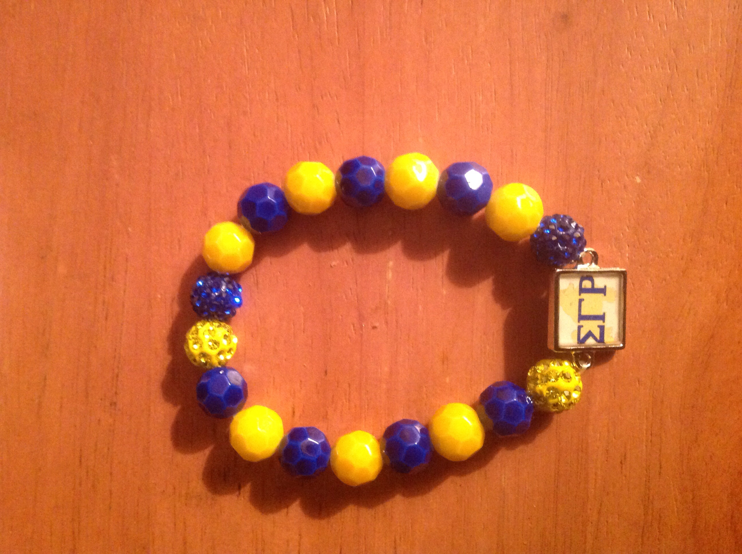 Blue & Yellow faceted beads, blue & yellow crystal beads, and a handmade Sigma Gamma Rho connector.