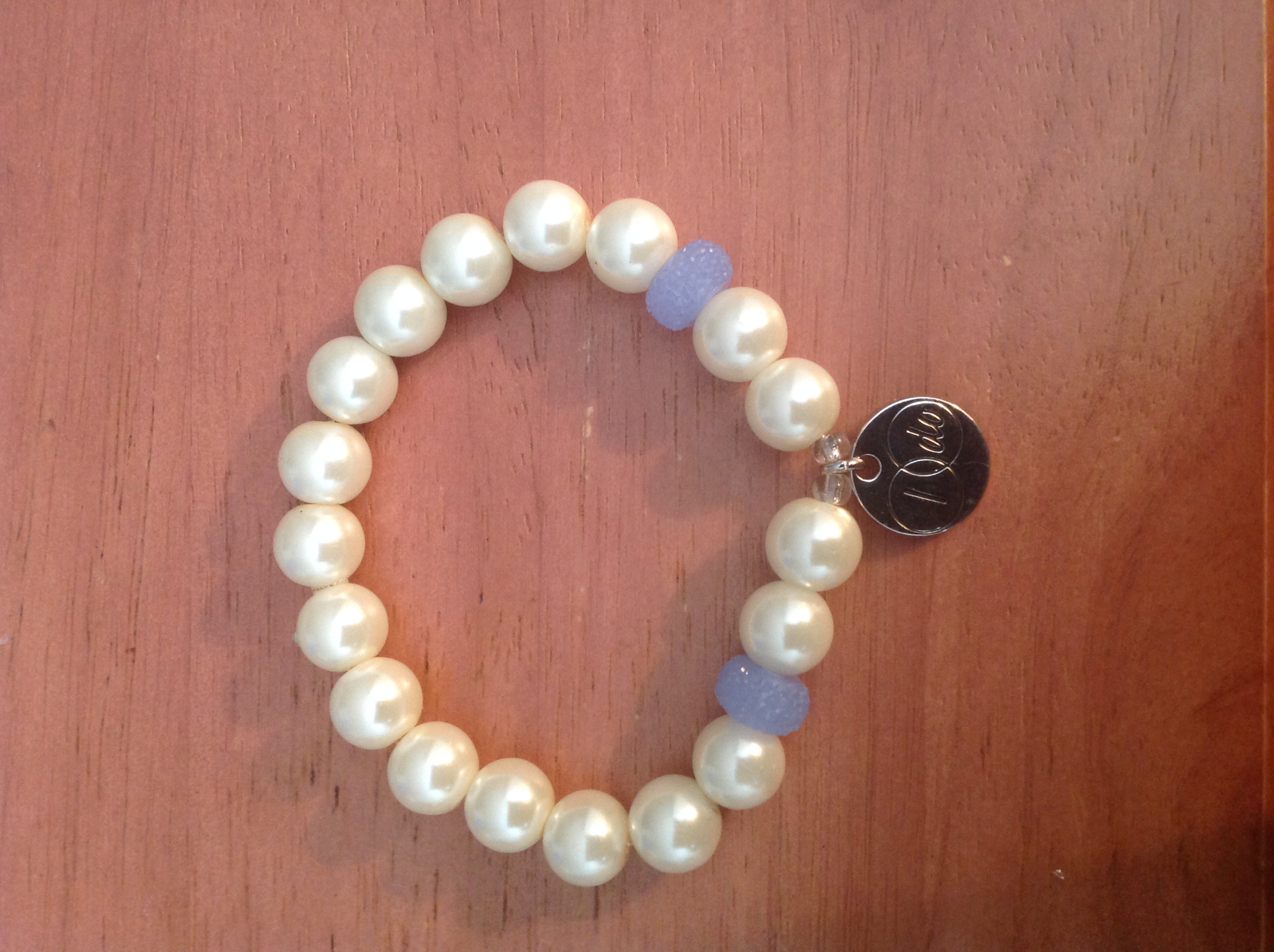 Pearl beads, 2 blue beads, and a "I DO" charm. This bracelet is between 7.5 to 8 inches.