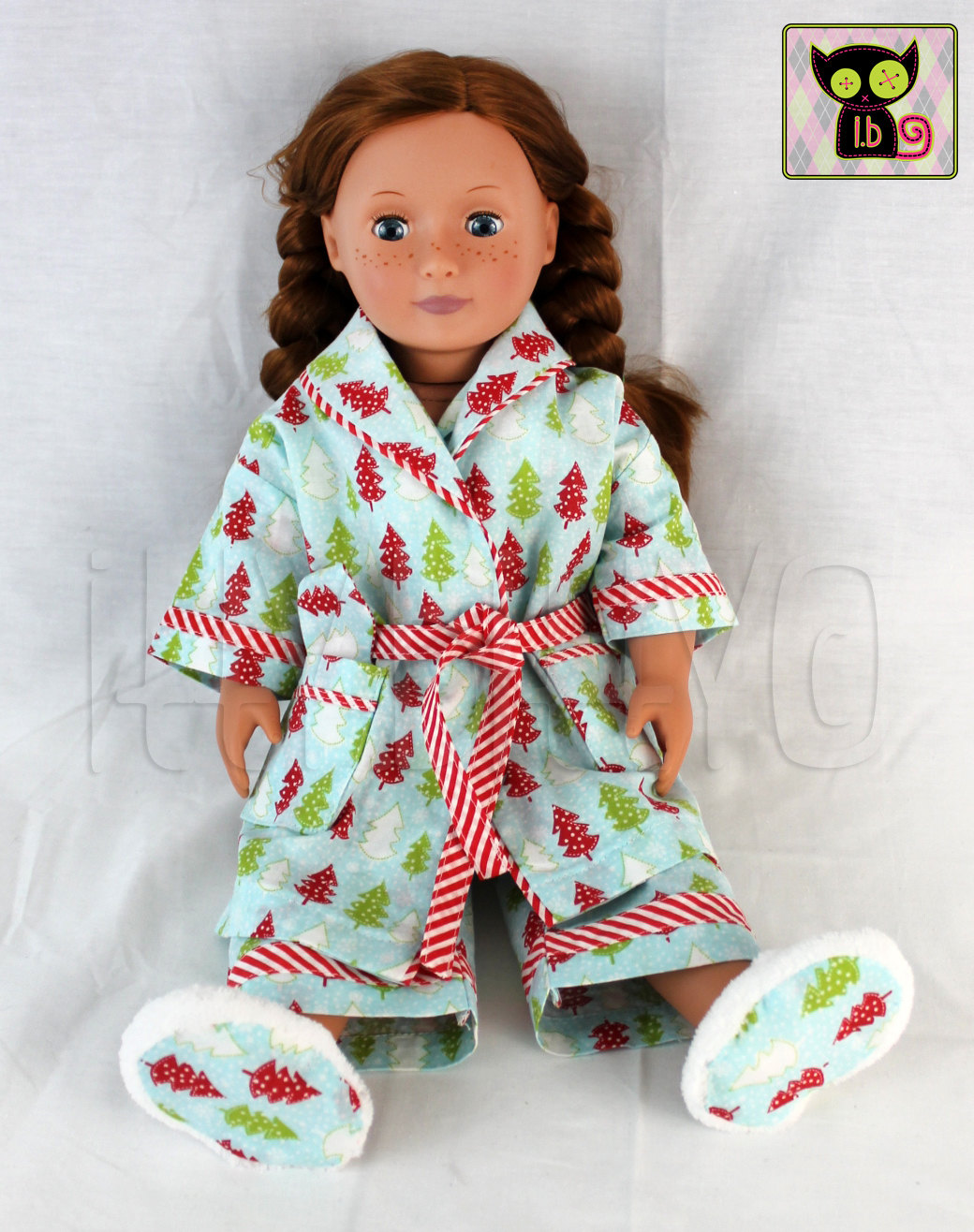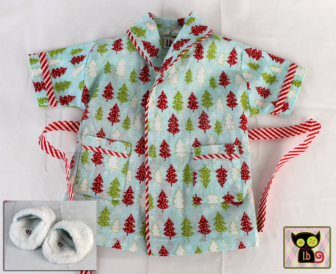 Have fun opening presents in this 5-piece pajama set by itty.bitty dolls! Hand crafted from Christmas print cotton fabric, this 5-piece set includes pajama top & bottoms, robe, sleep mask, and white fuzzy slippers. So many tiny details went into this set, all the way down to functioning pockets and matching fabric on the bottom of the slippers! Pajama top fastens with snaps. The pants & slippers are elasticized, and the robe includes a removable tie. This item is pre-made and ready to ship within one business day! Doll(s) & accessories shown are for display purposes only, and are not included; listing is for item(s) specified in listing/title only. ♥ Please read shop policies before purchasing: http://ittybittydolls.storenvy.com/faqs ♥ All itty.bitty clothes & accessories are made with brand new materials unless otherwise specified (i.e. upcycled or vintage). ♥ I use a lot of starch & stabilizer when sewing doll clothes in order to make working on a small scale easier. In many circumstances, I will wash the item(s) prior to shipping. I use perfume & dye free detergent and fabric softener, and wash the items in their own load. I will note ANY item that has been washed in the listing description. ♥ All items come from a smoke-free studio. I do have two dogs that come to work with me, but they are kept away from all fabrics and sewing materials. Finished items are stored in plastic tubs and/or packaging as soon as they're completed to reduce risk of coming in contact with any dog hairs. Please keep this in mind when purchasing if you're especially sensitive or allergic to dogs. ♥ My doll clothes will fit all standard 18" dolls (American Girl, Dollie & Me, My Life, Madame Alexander, Our Generation, etc. They do not fit Journey Girls.) ♥ I am a Liberty Jane partner; the slippers were based on a Liberty Jane pattern.