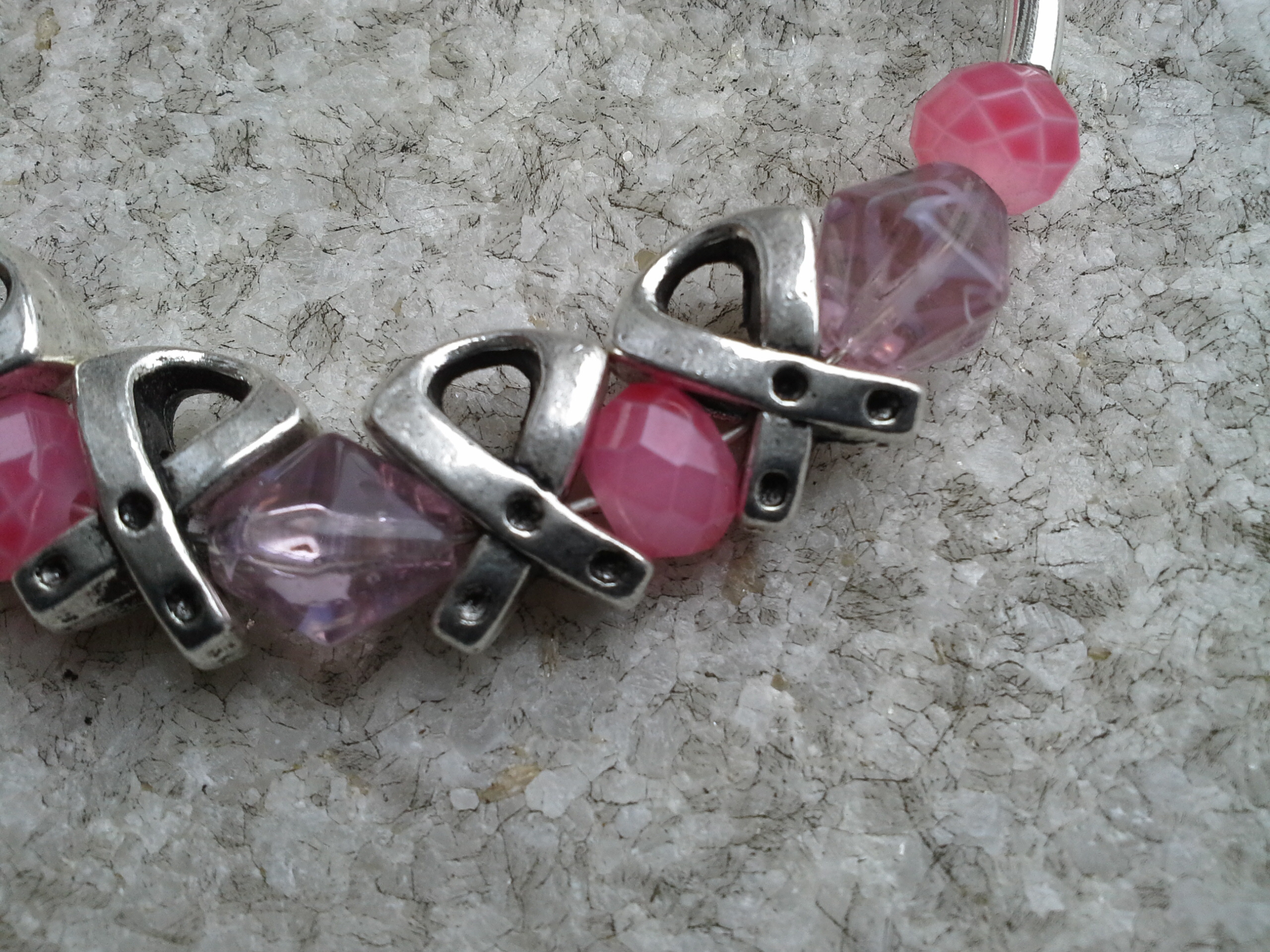 Awareness pewter ribbons with pink crystals and biocone lampwork pink beads for center of bracelet. Silver plated tubes finish the bracelet to a lobster claw clasp.