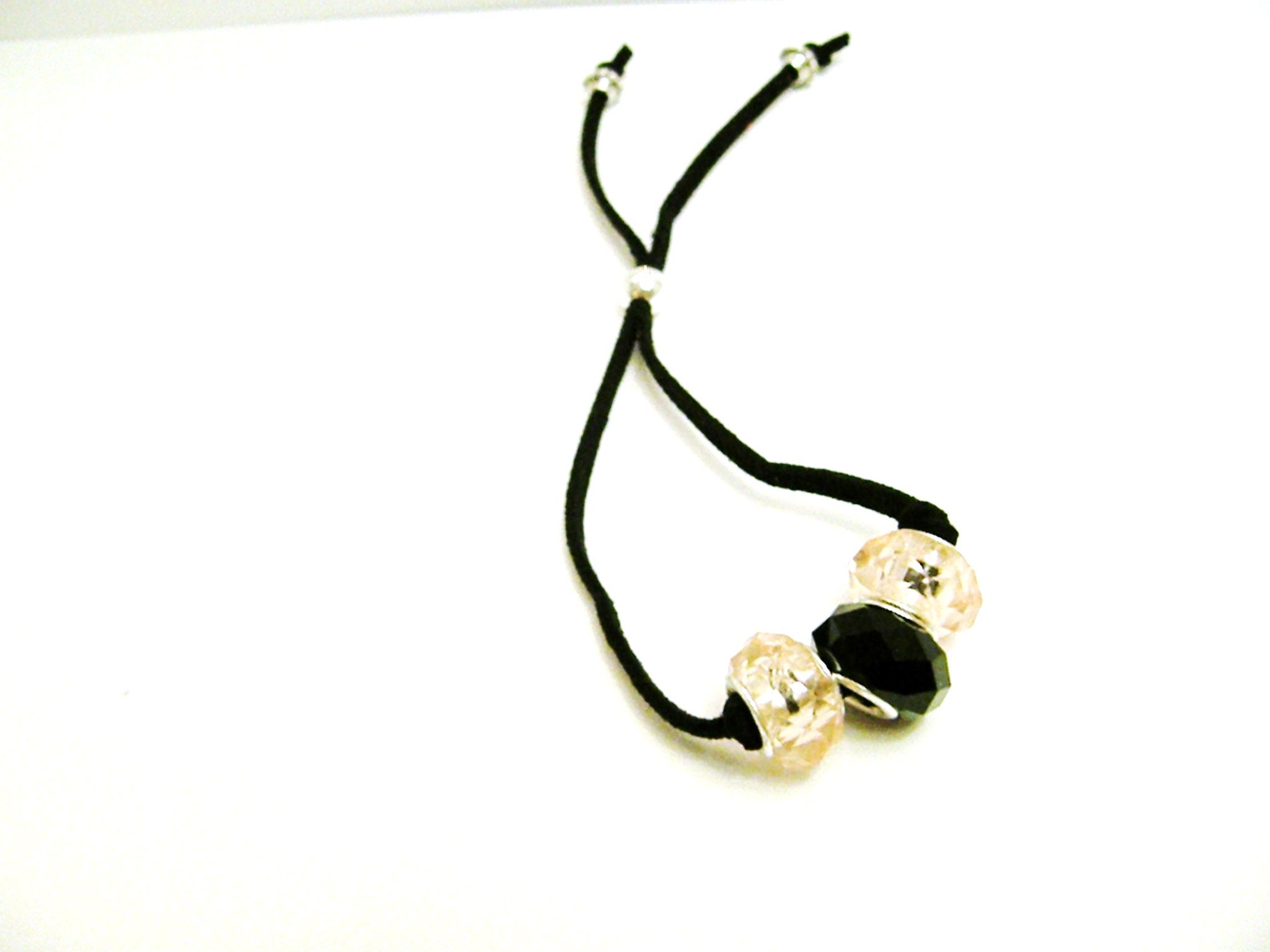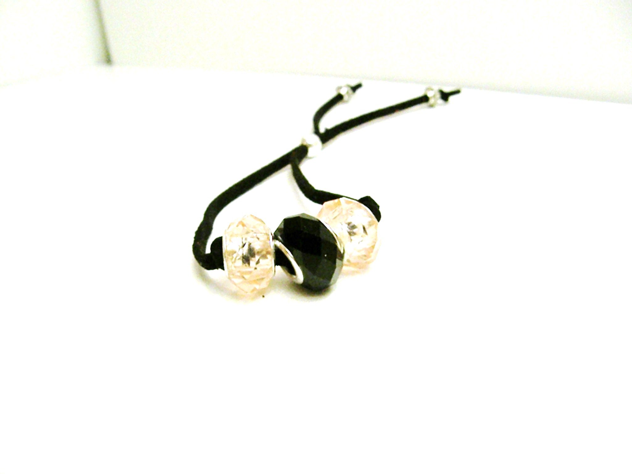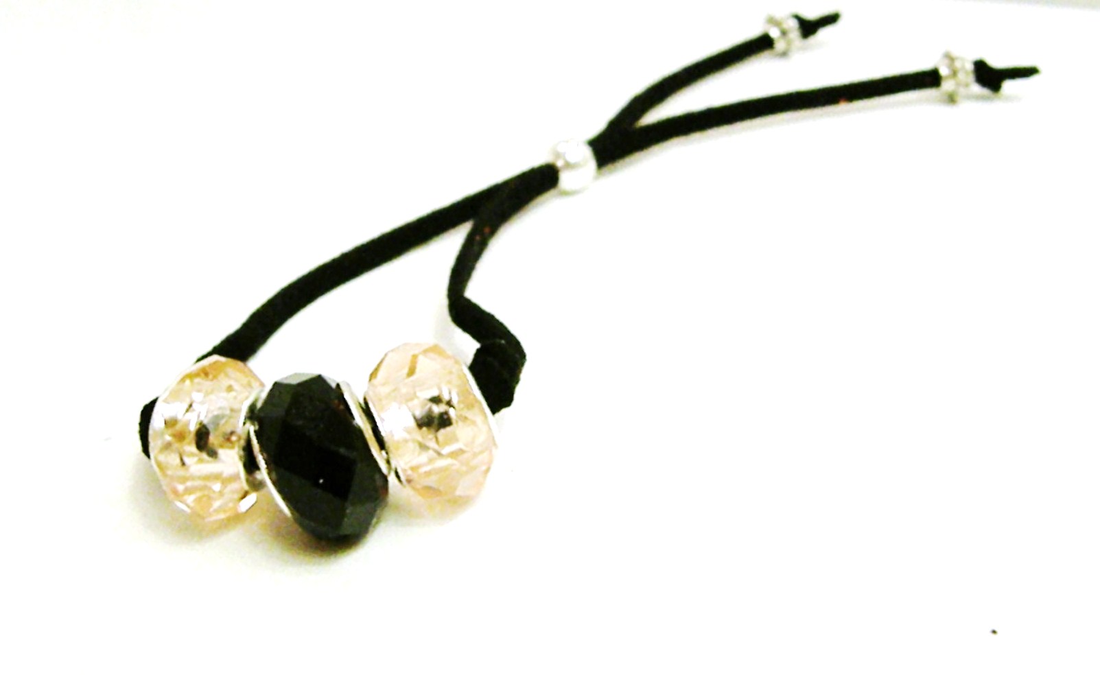 This is a black suede bracelet made with 2 pink and 1 black large hole glass beads. The bracelet is adjustable using a sterling silver large hole bead. Simply beautiful and comfortable.