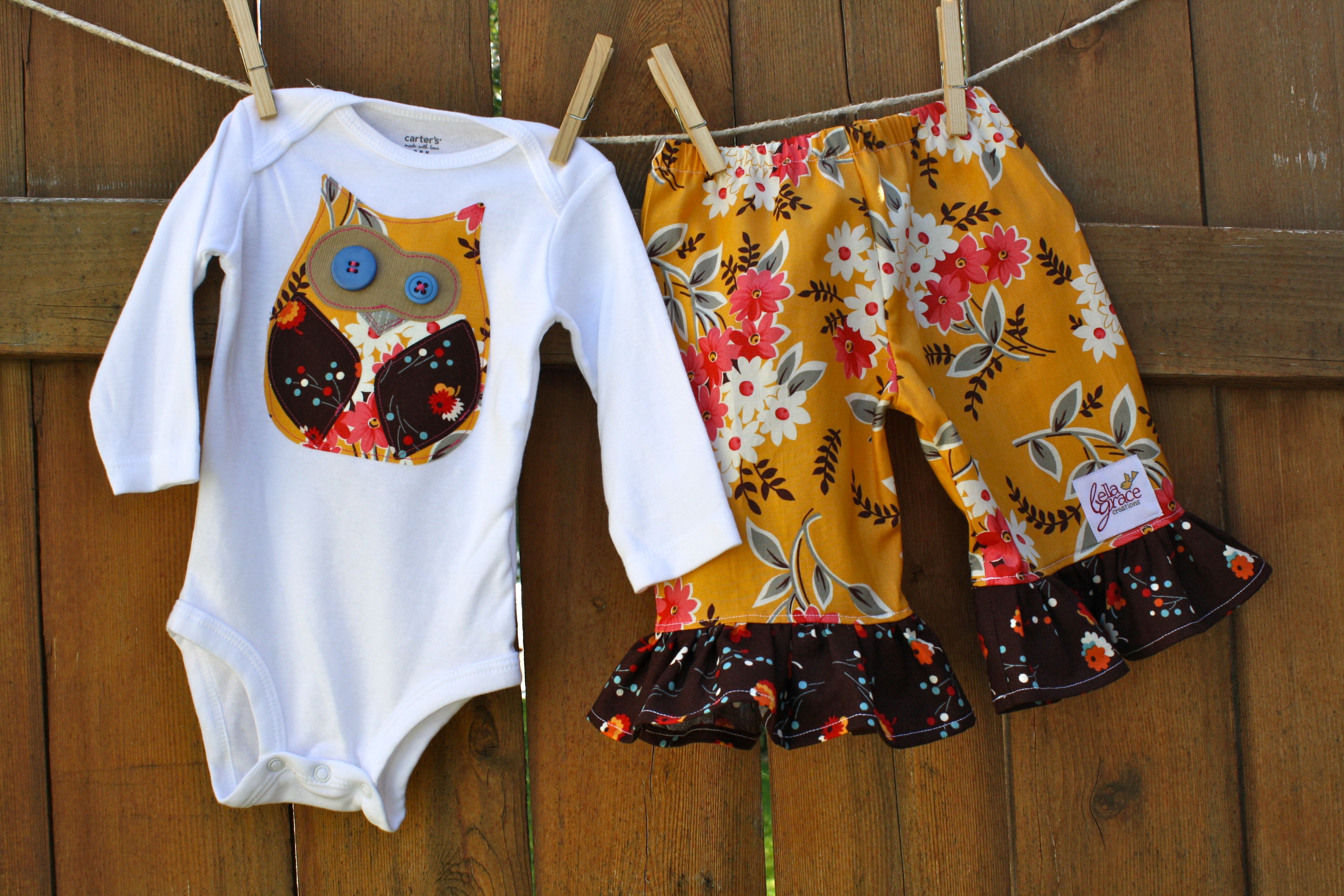 This set is so fun and funky. The cute owl is made out of designer modern fabric. Tan corduroy is used around the two cute button eyes for some added texture. It is paired with some boutique style ruffle pants. We use Carter brand or Old Navy long or short sleeve bodysuits. Feel free to contact me with any questions or special requests. *Please leave in you comments which size and sleeve length you would like. Sizes available: Long sleeve or short sleeve 0-3 month 3-6 month 6-9 month 9-12 month 12-18 month ***If you are interested in a larger size or a matching twirl skirt please contact us for pricing and availability.