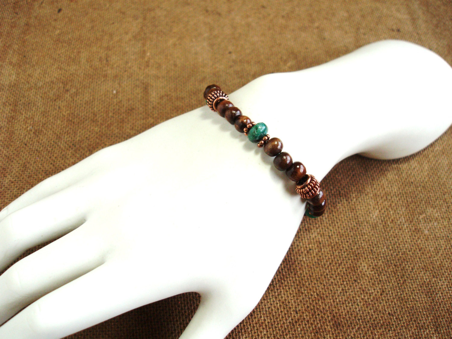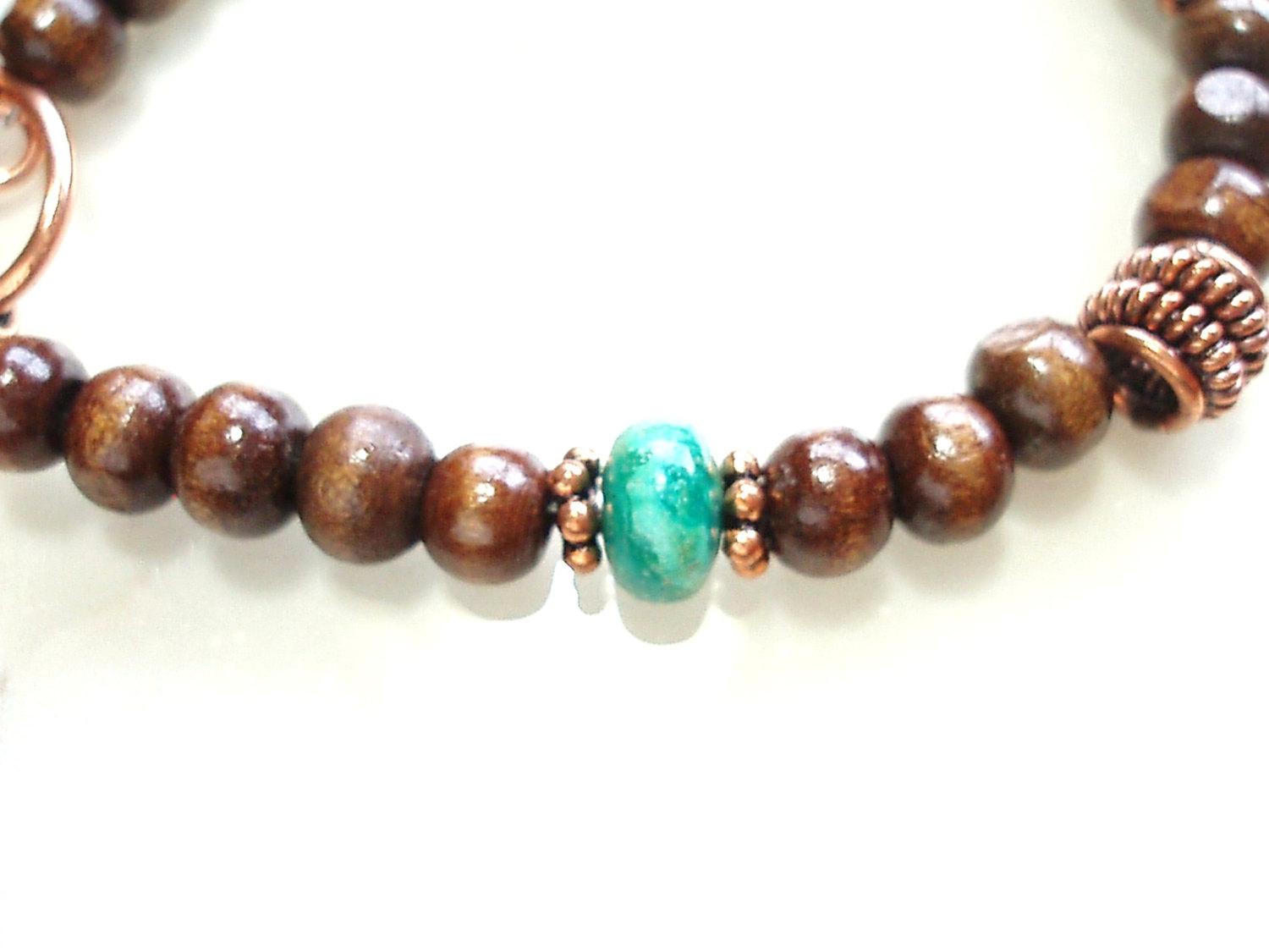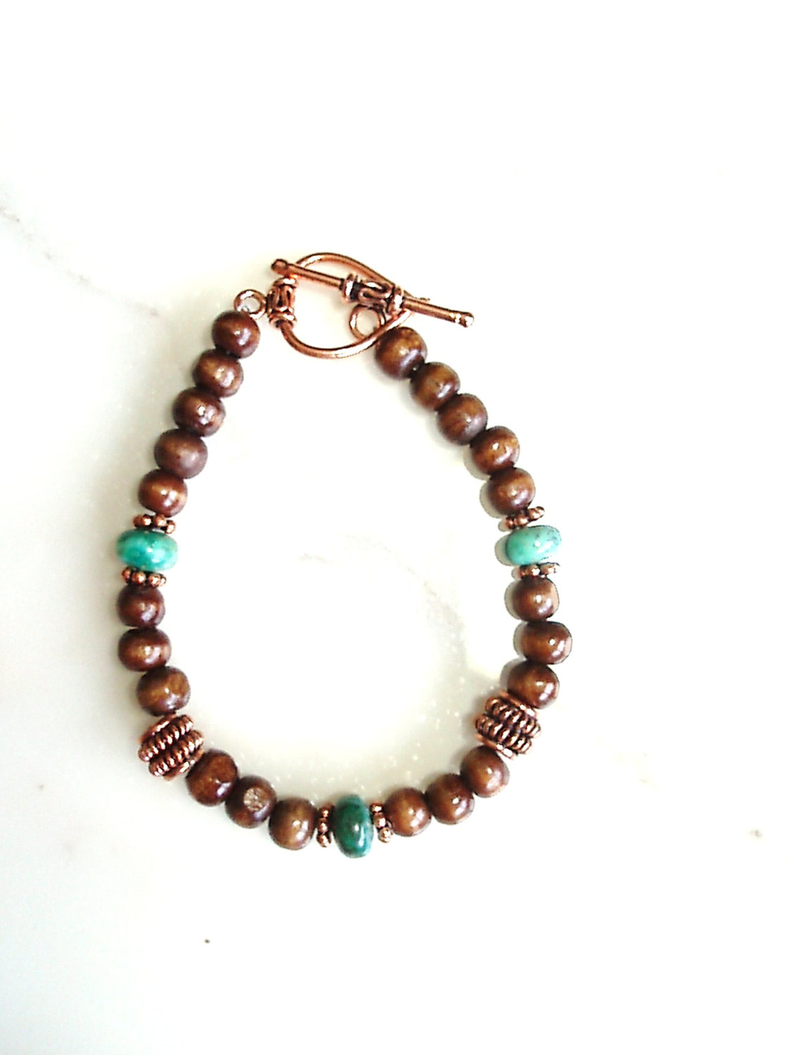 Like a burbling stream running through a lush forest, the rich brown wood and deep blue turquoise beads in this bracelet celebrates nature. * Made with wood, turquoise, and copper beads; heart toggle clasp; 7-1/2" length.