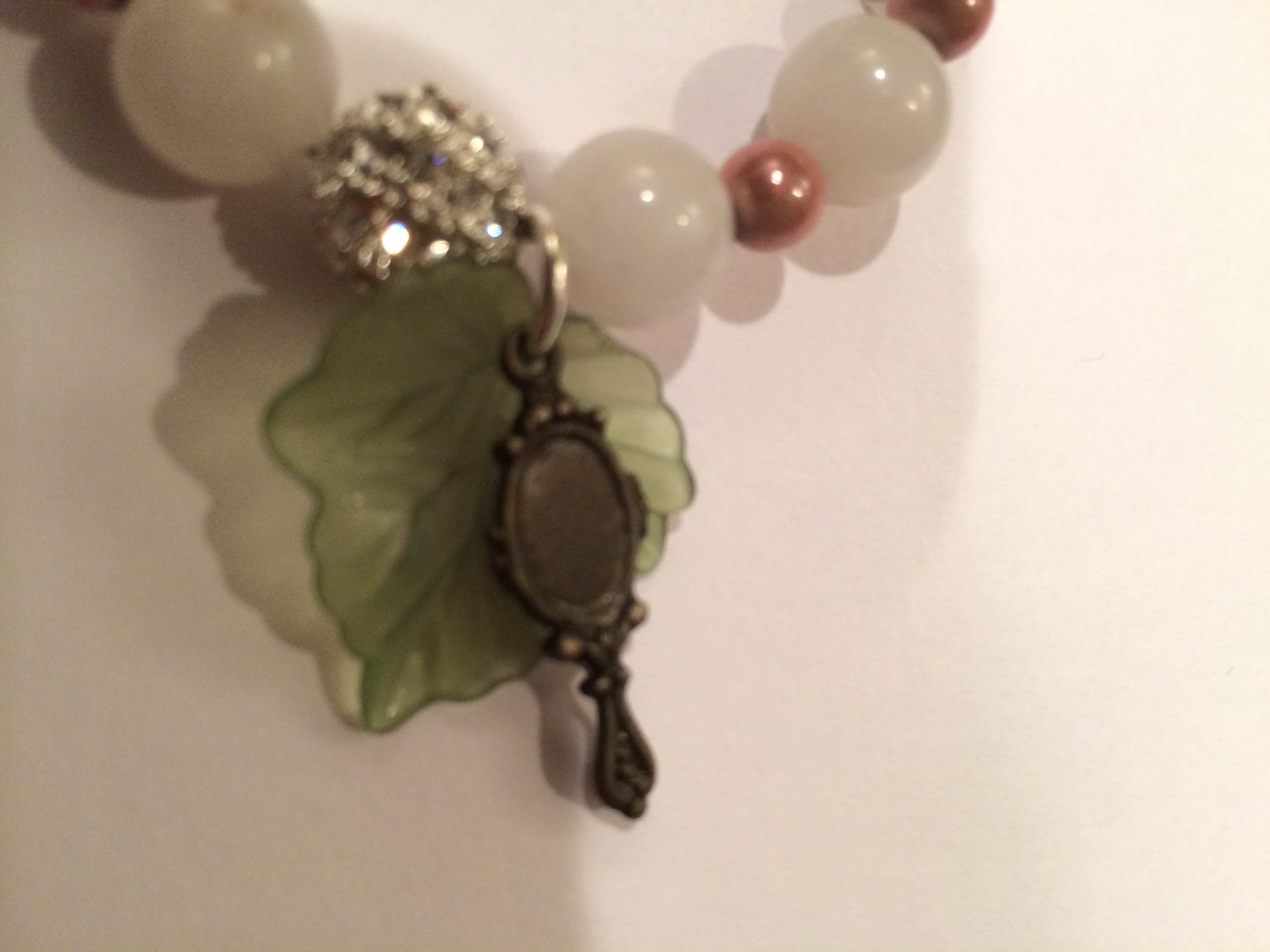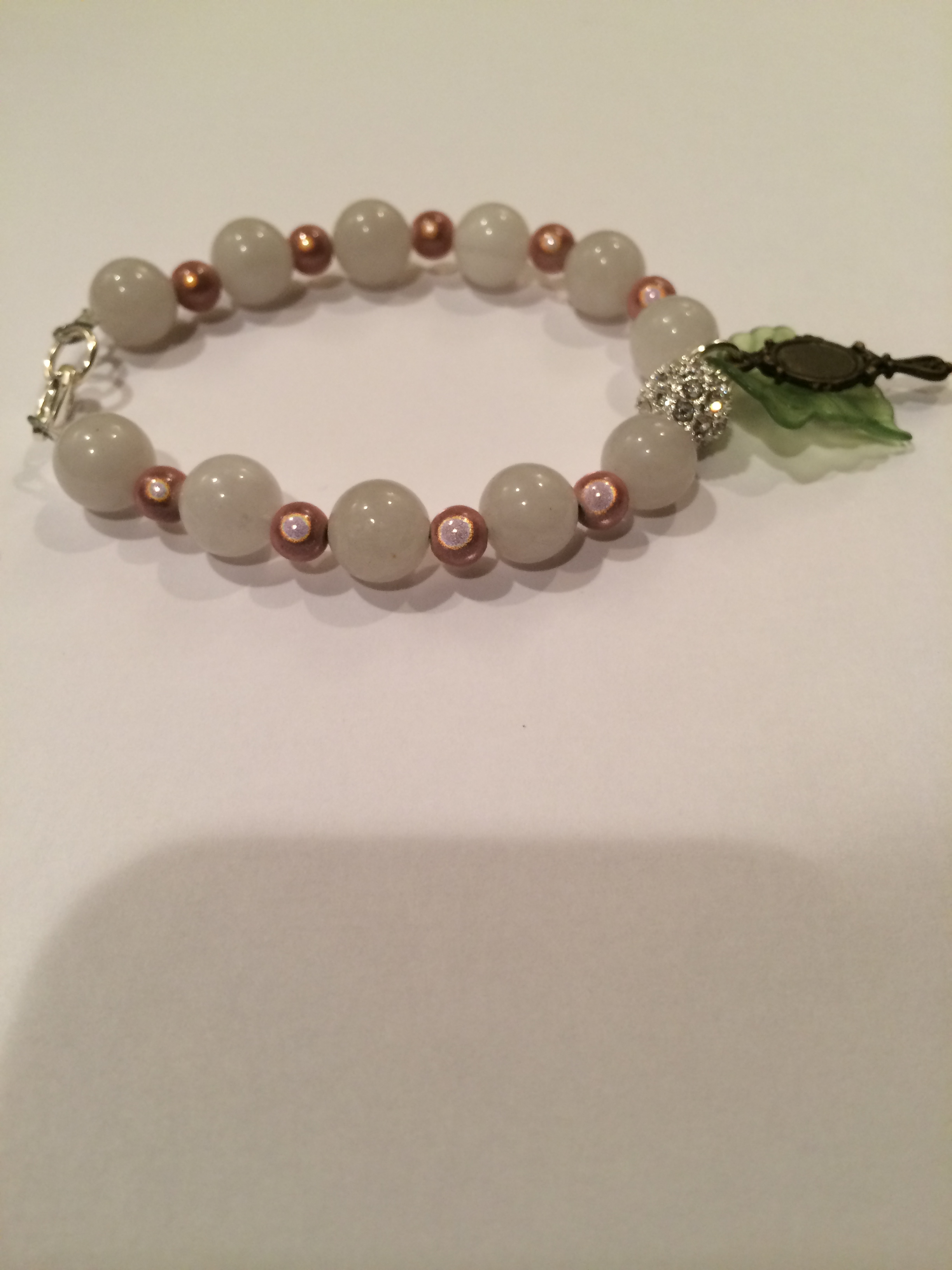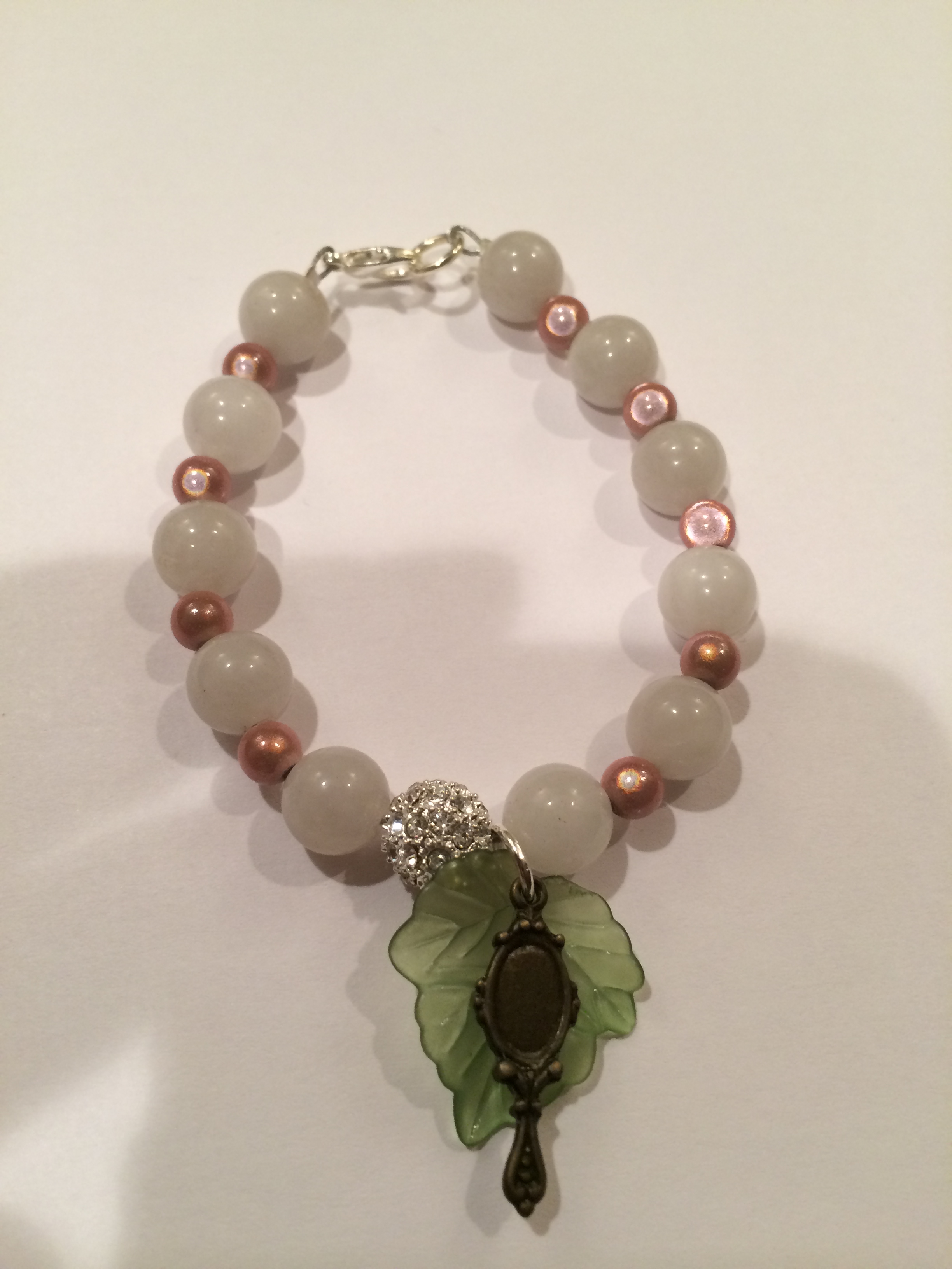 The Ivy Leaf Bracelet: 10mm White Gemstone Beads, Pink 3mm Spacer Beads, Mirror Charms, Ivy Leave Charm, and Lobster Clasp Connector.
