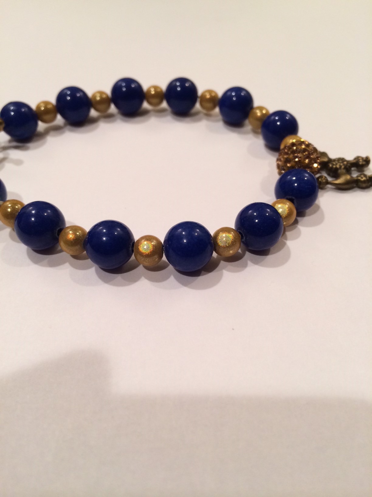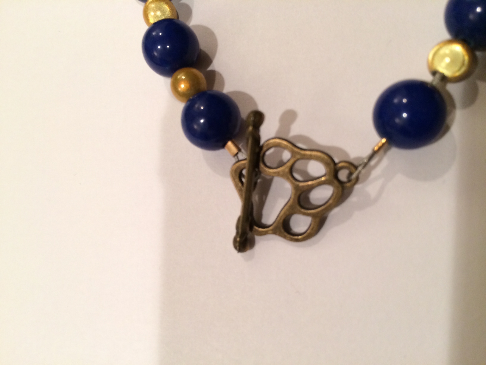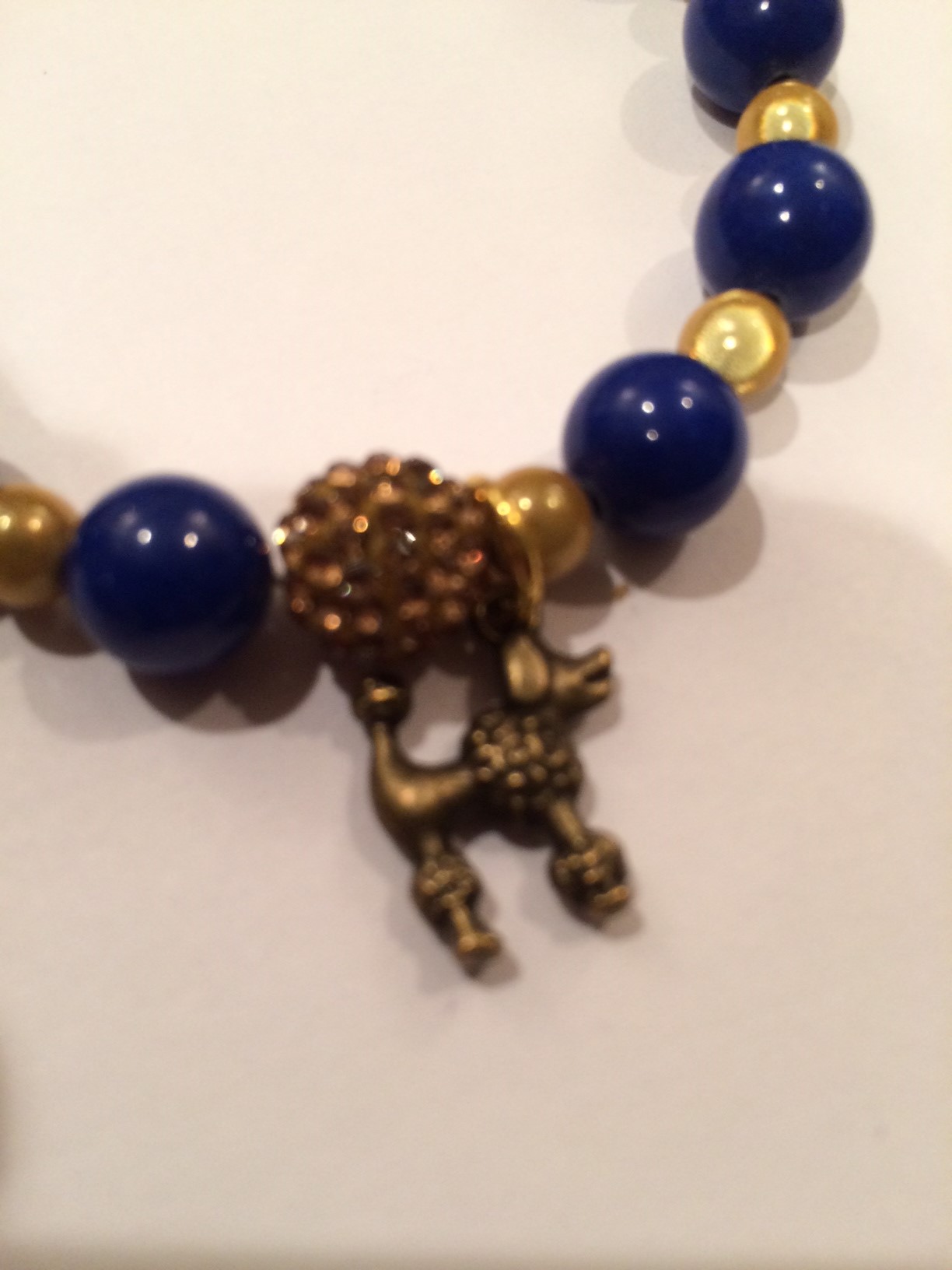 10mm Blue Gemstone Beading, gold macrame beading, gold poodle charm, gold lobster clasp.