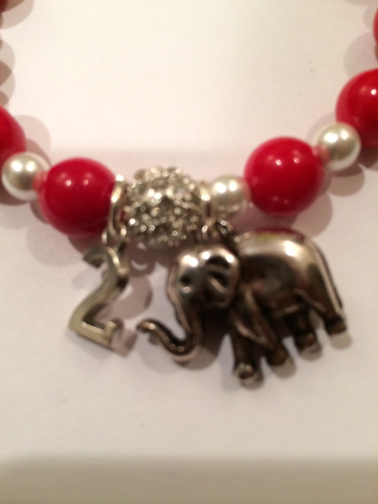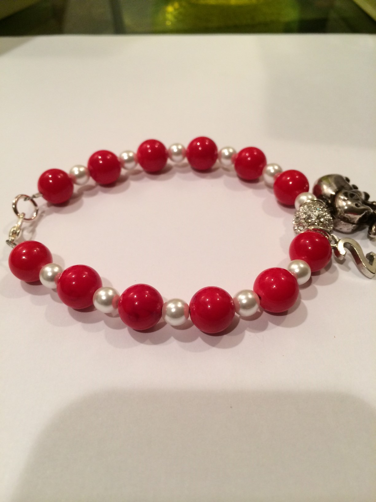 Red Elephant Bracelet: Red Fossil 10mm Gemstone beading, silver spacers, 10mm silver macrame beading, silver elephant charm.