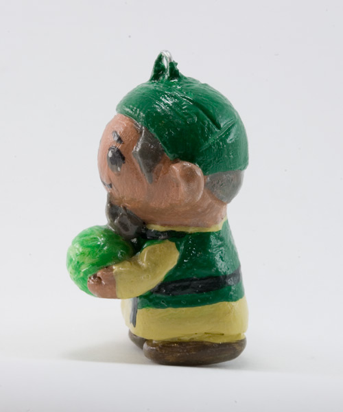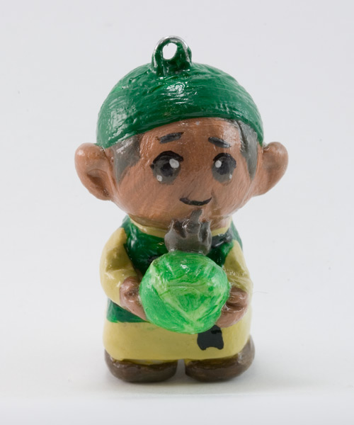 Cabbages. Truly, they are a wonderful vegetable. Slice 'em, dice 'em, or just clutch them to your bosom—cabbages are the miracle food. And nobody knows more about this Earth Kingdom staple than the Cabbage Merchant! Great as a decorative zipper pull or standing proud on your computer monitor, the Cabbage Merchant measures about 1 1/4" (3.5cm) tall, and comes with a keyring and short chain. Each charm is made from wire and Sculpey and has been painted and triple-glazed with a protective glossy coating in order to prevent chipping and breakage, but care is still recommended as polymer clay is not indestructable!