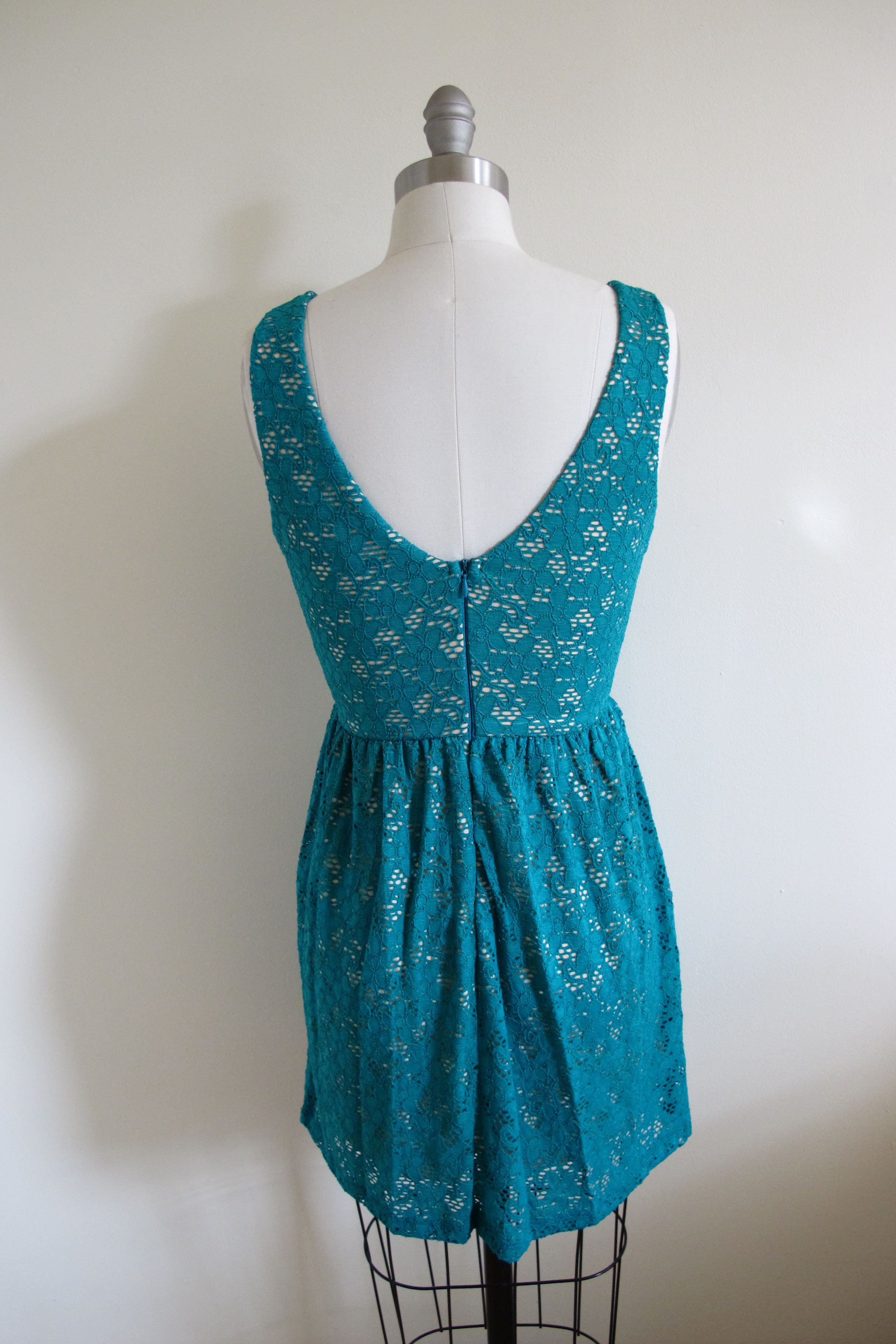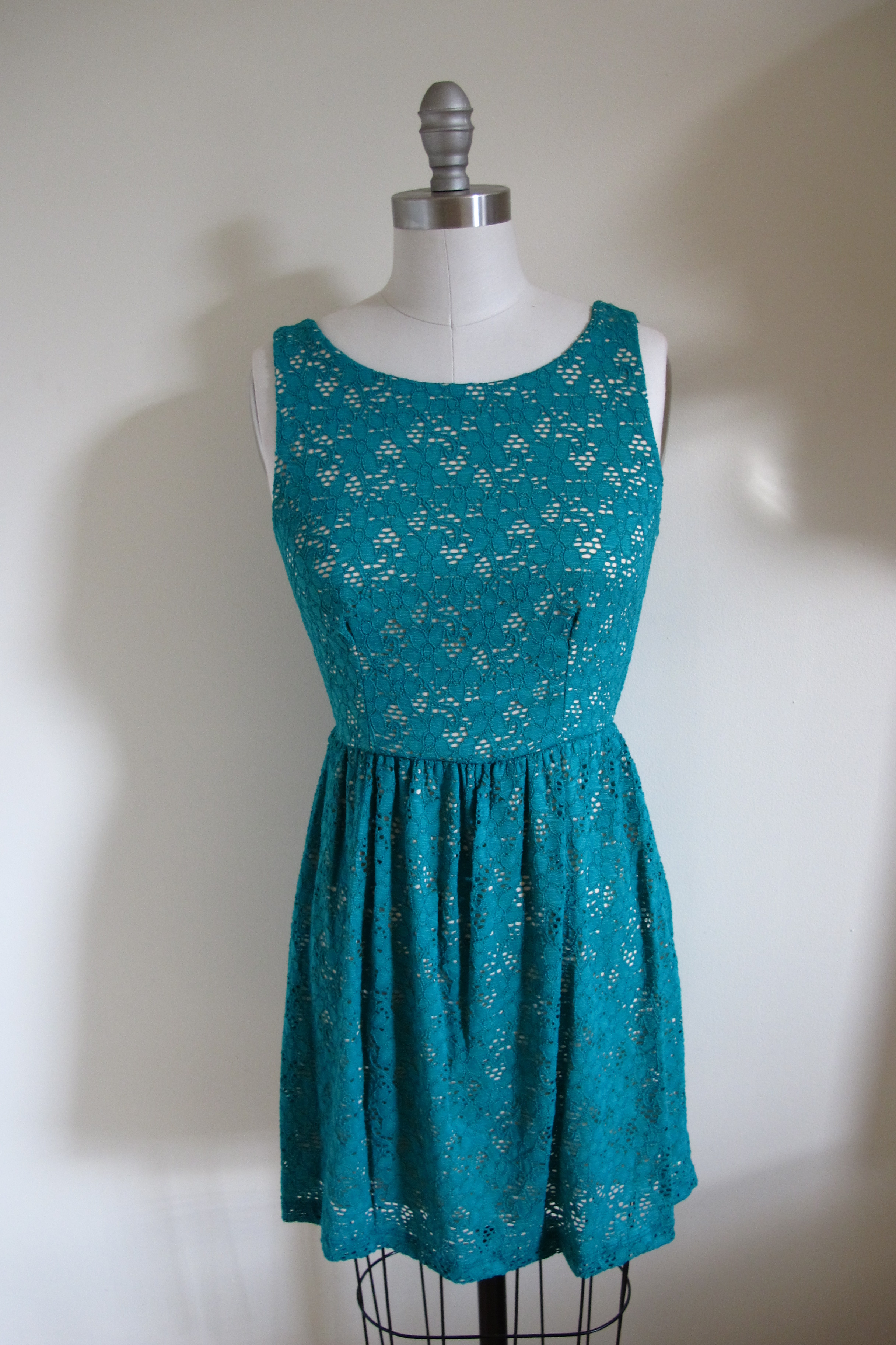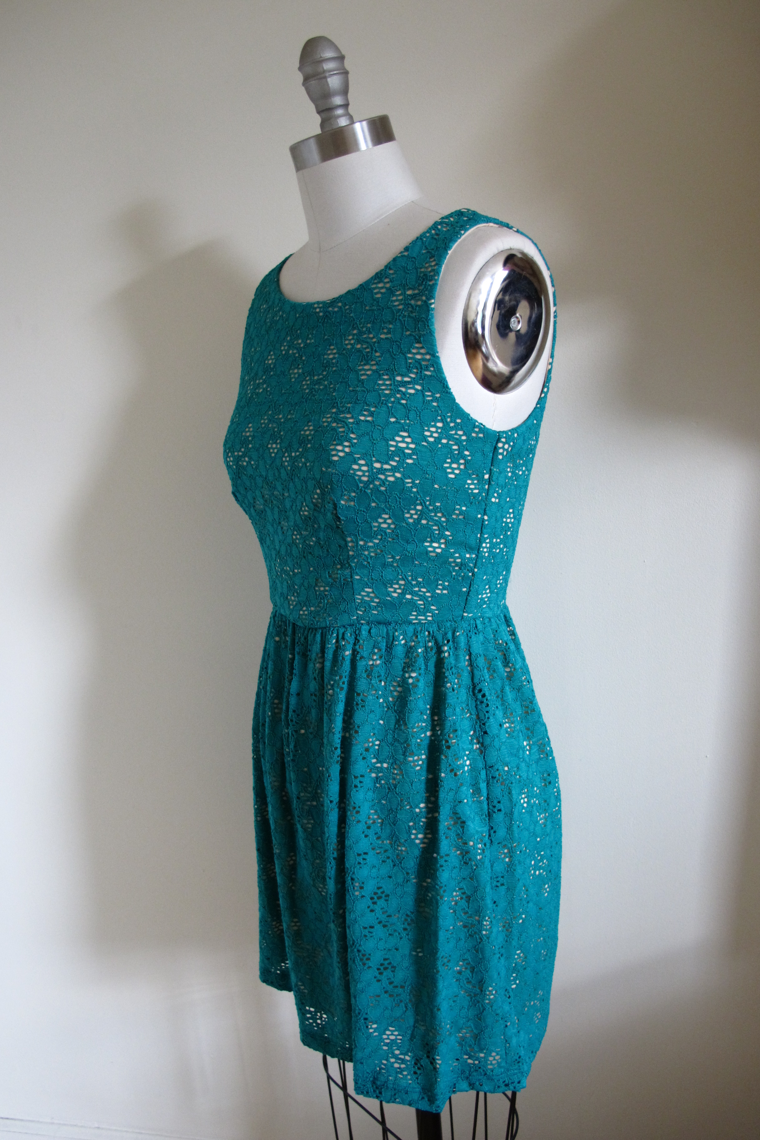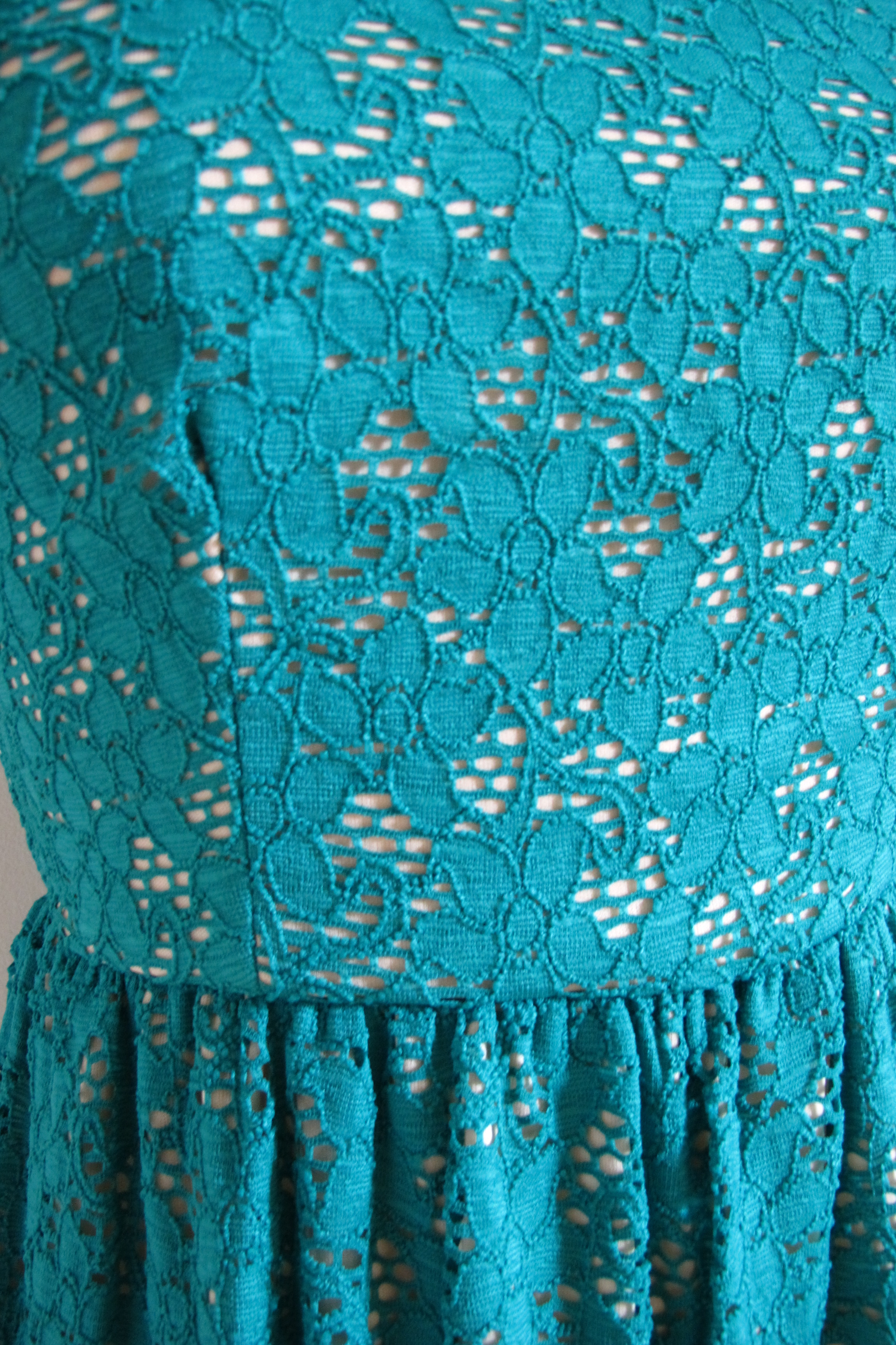 Jade stretch lace dress with nude lining. Enjoy with a Jade Martini. Shell: 95% Polyester 5% Spandex Lining: 100% Polyester Dry Clean Only Made in USA 18" long from waist