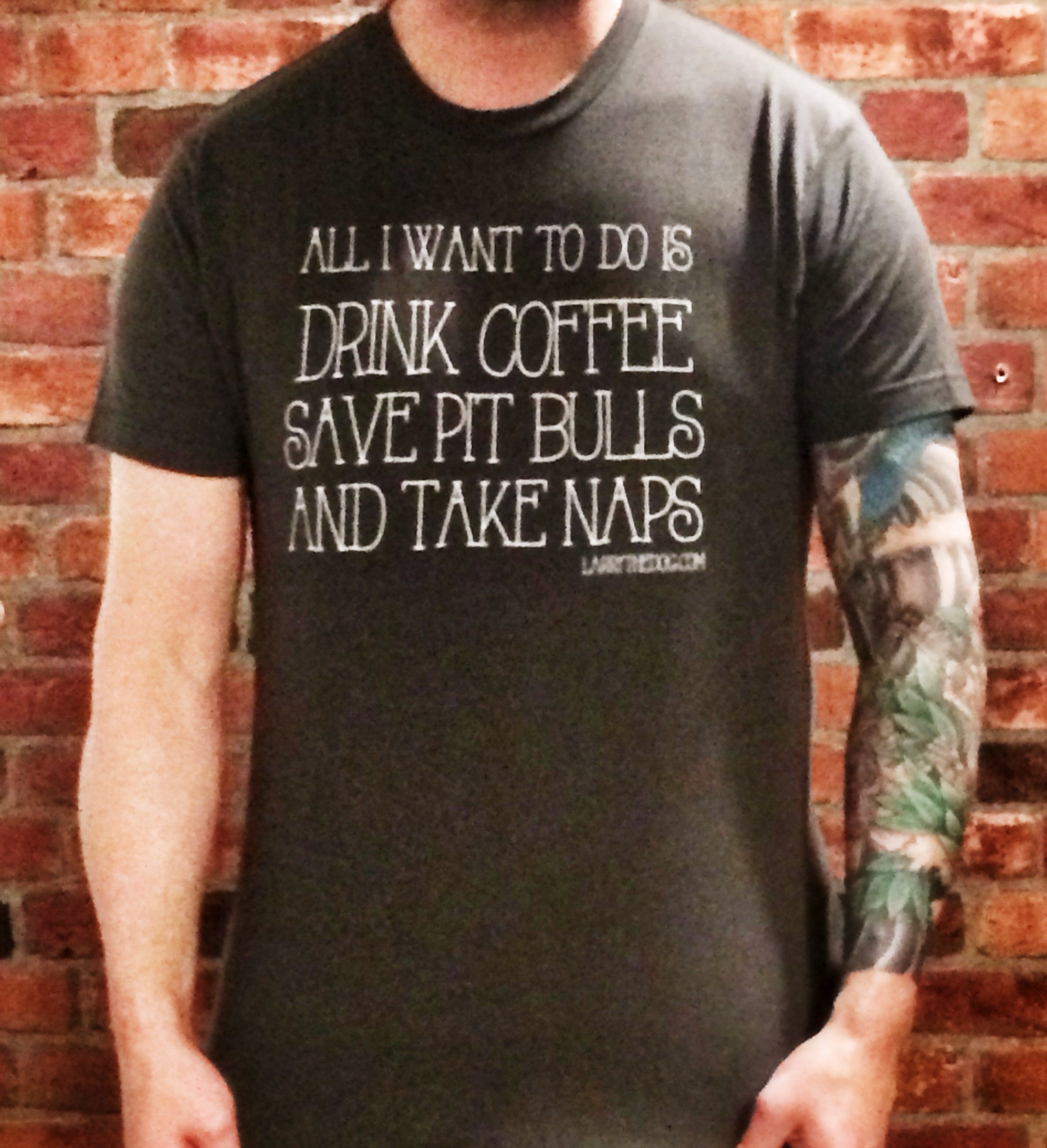 On sale! Originally $24.99. "All I want to do is... drink coffee, save pit bulls and take naps" screen printed on premium fashion fit Tultex brand tees. Unisex fit. *for women, order one size down. Dark charcoal color tee.