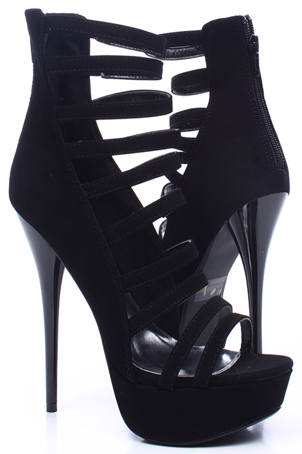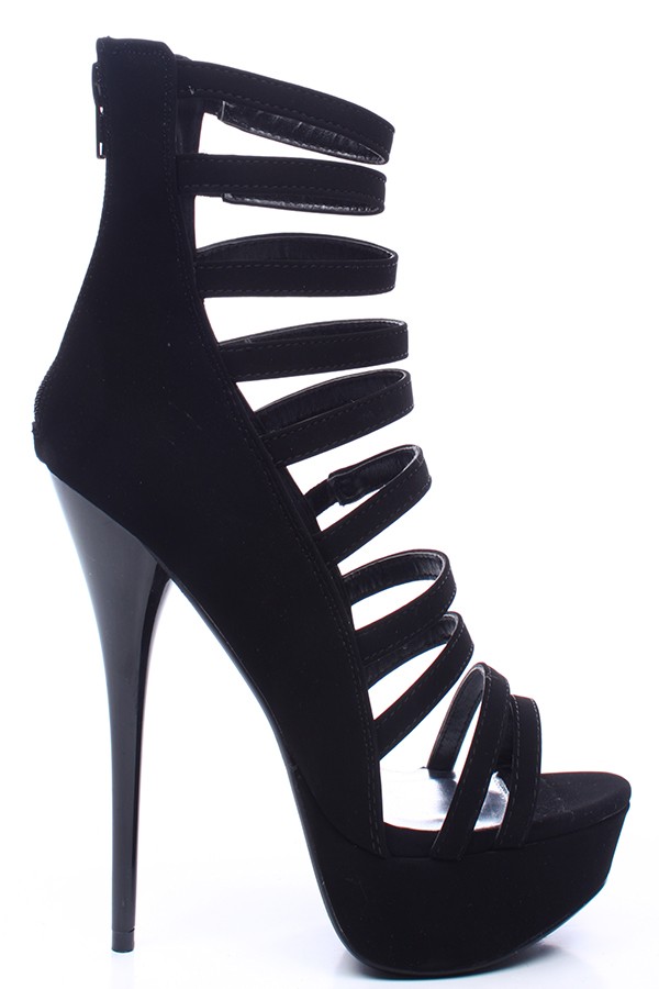 ID: BLACKNUBUCKPU These strappy heels feature a nubuck exterior, padded insole, 4 inch zipper on the back of heel for easy slip on and off. Heel measures 5 inches and platform measures 1.5