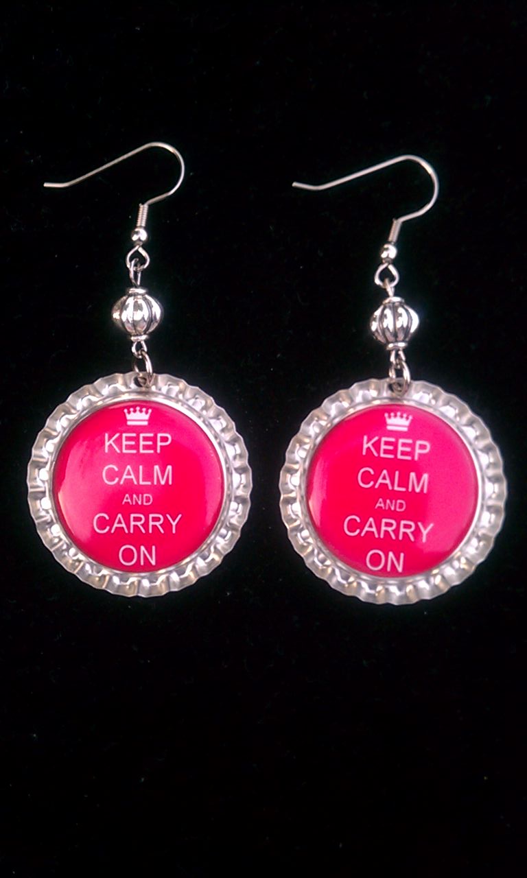 Red background with white lettering. Image covered by epoxy dome which creates shine and dimension. Fish hook earring wire, metal bead. Earrings are lightweight.