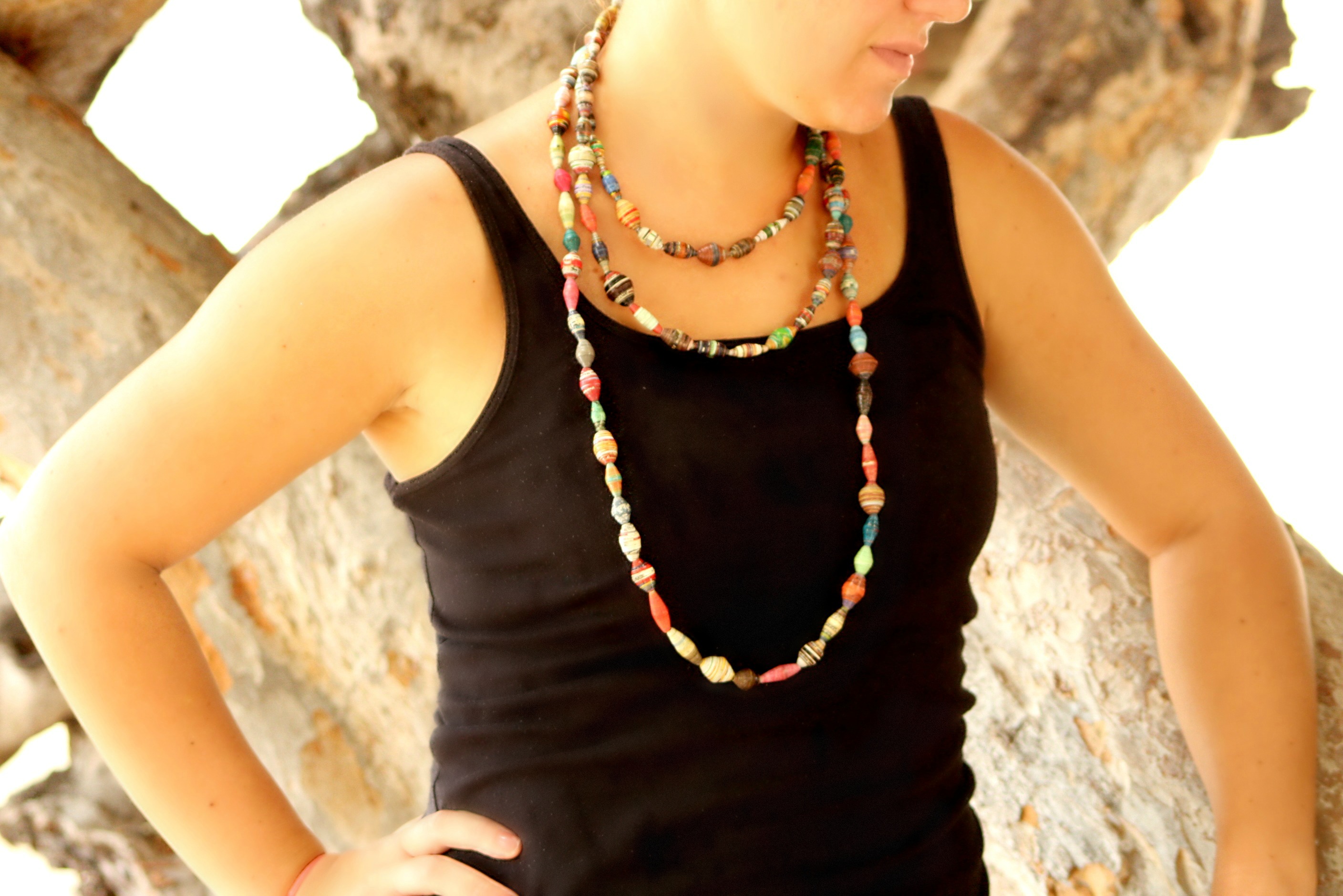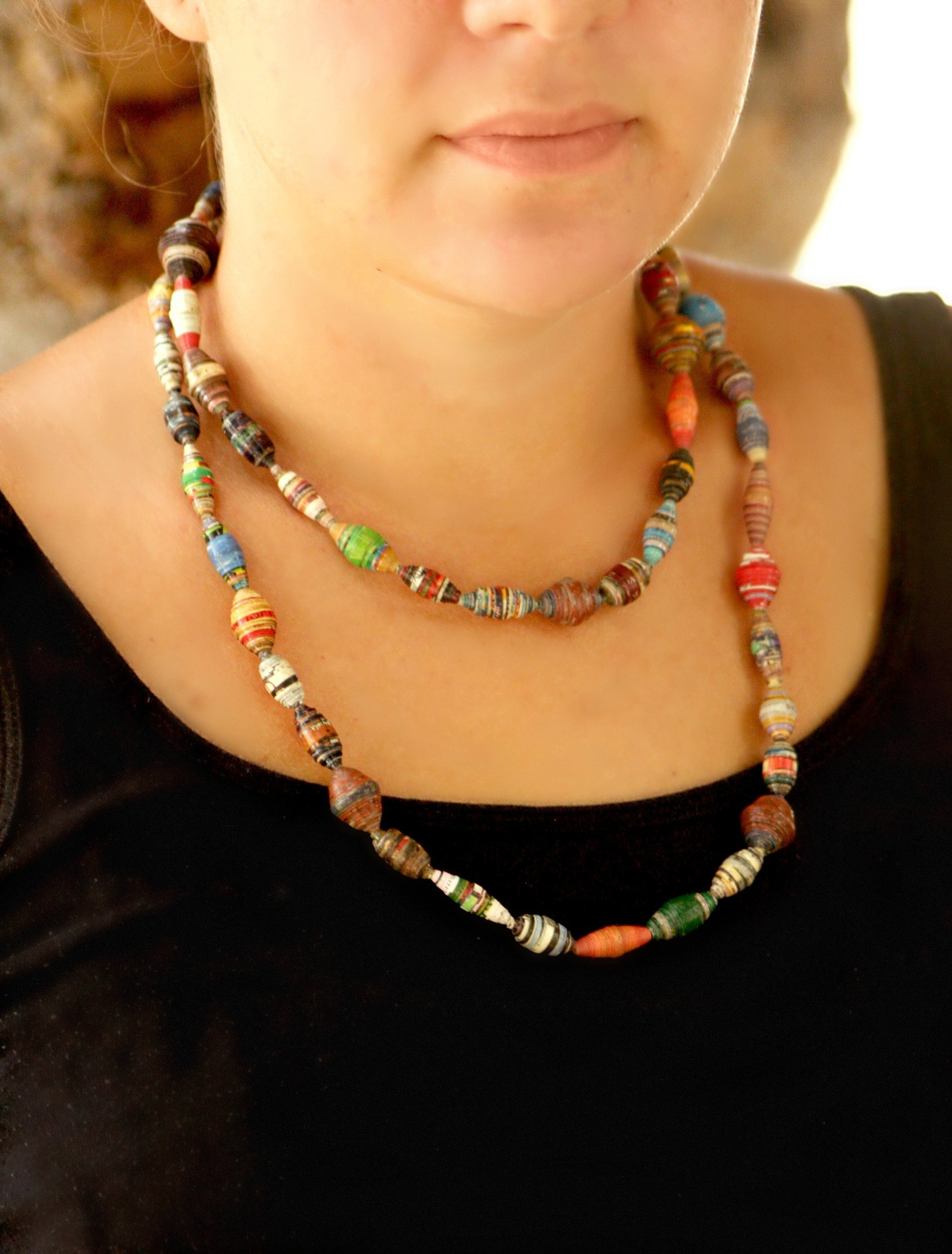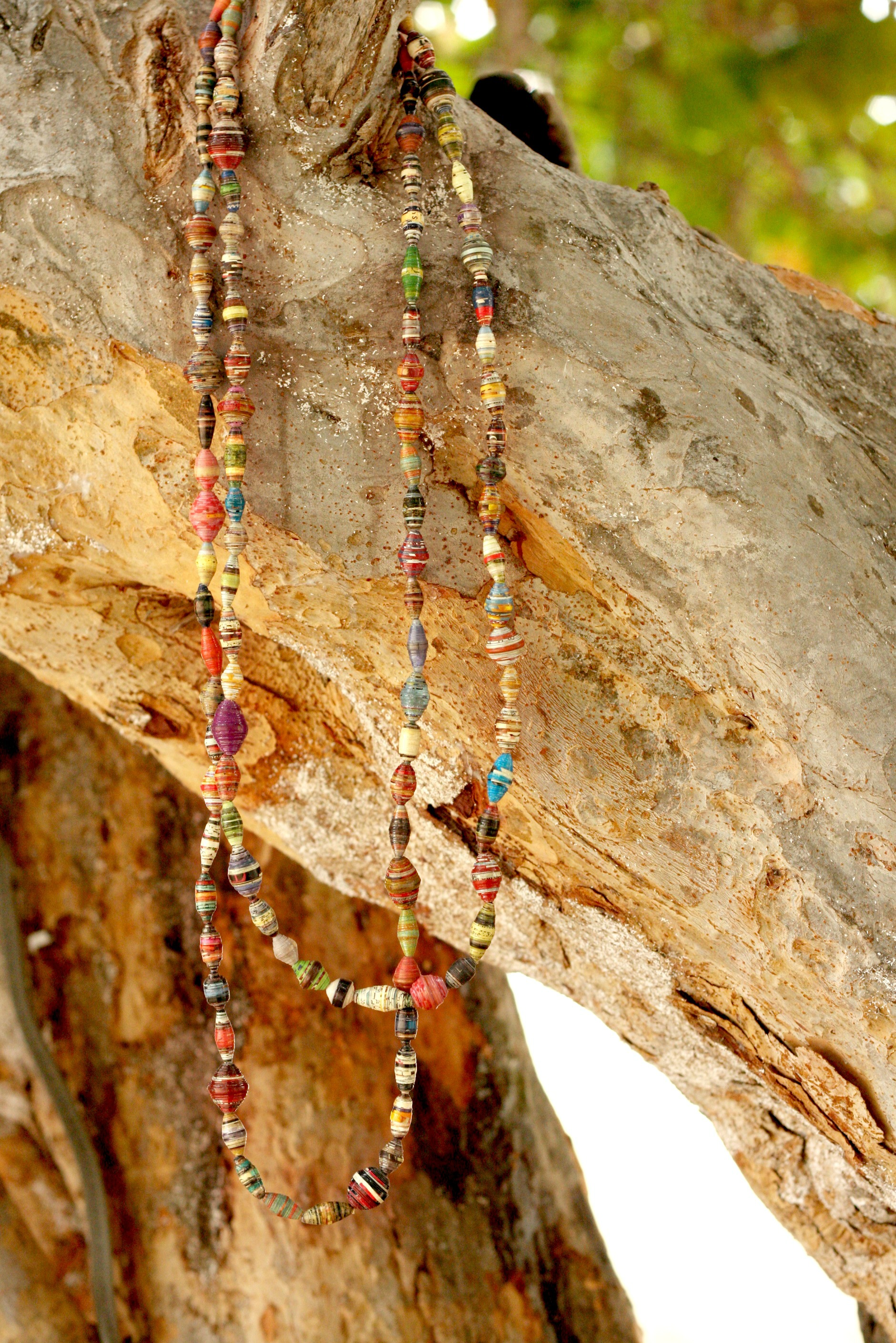 The beads are made from recycled paper, glue and finished with clear varnish. Some paper is provided and everyone buys their glue and varnish at a subsidized rate. Bead makers are now supplementing the provided paper with their own recycled paper and thin cardboard. Beads are made by cutting long, thin triangles from the paper, rolling it over a toothpick and finishing with three layers of varnish to seal it.