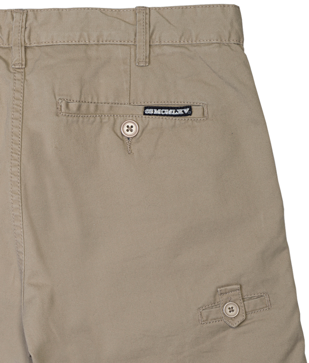 Get comfortable in our signature men's chino short. Classic straight fit with sharp detailing. Logo embroidery on inside waistband and below front welt pocket. Logo labels on back waistband & right back pocket. Khaki color. Extra-soft 100% cotton washed twill. Available in sizes 30/32/33//38. Imported.