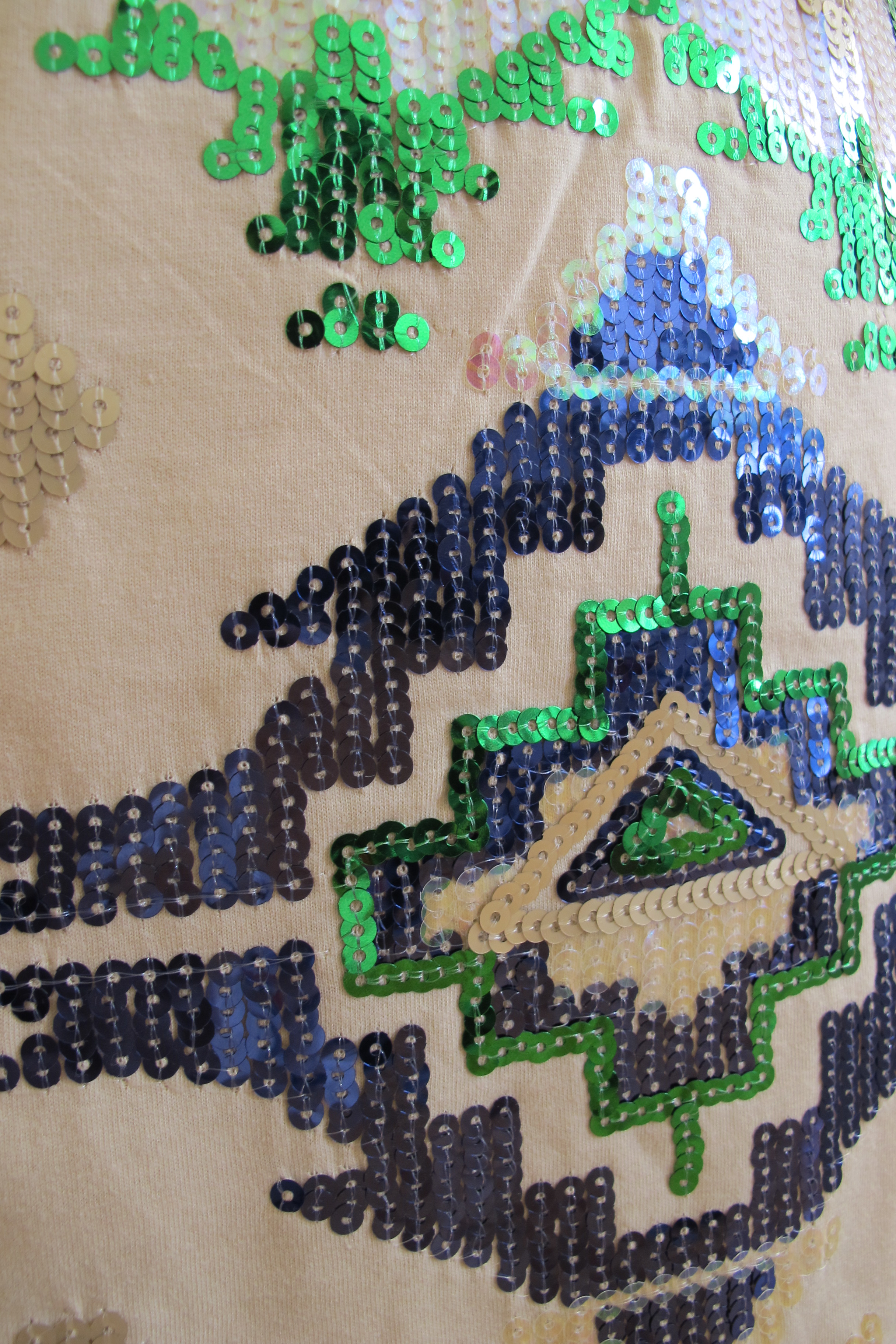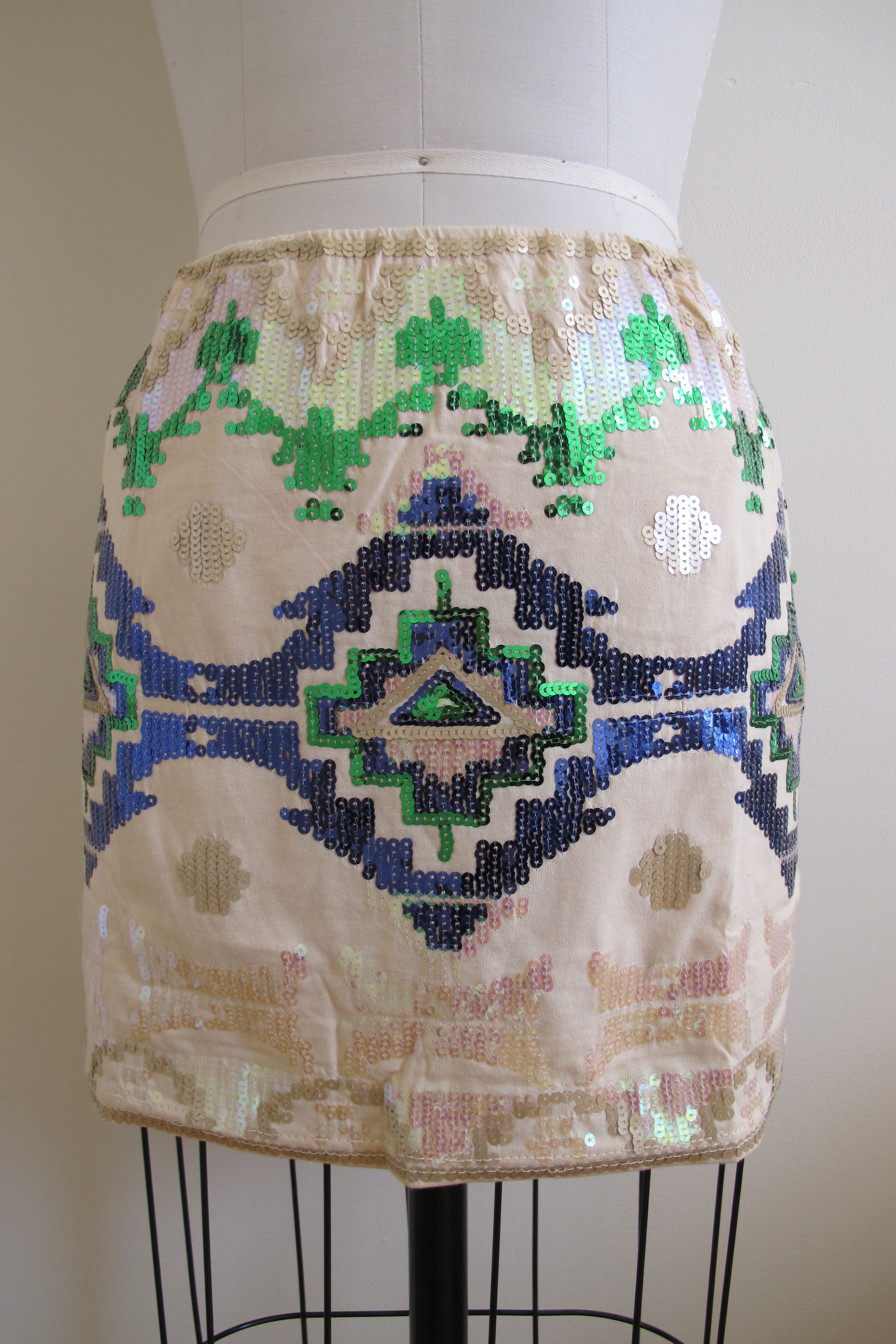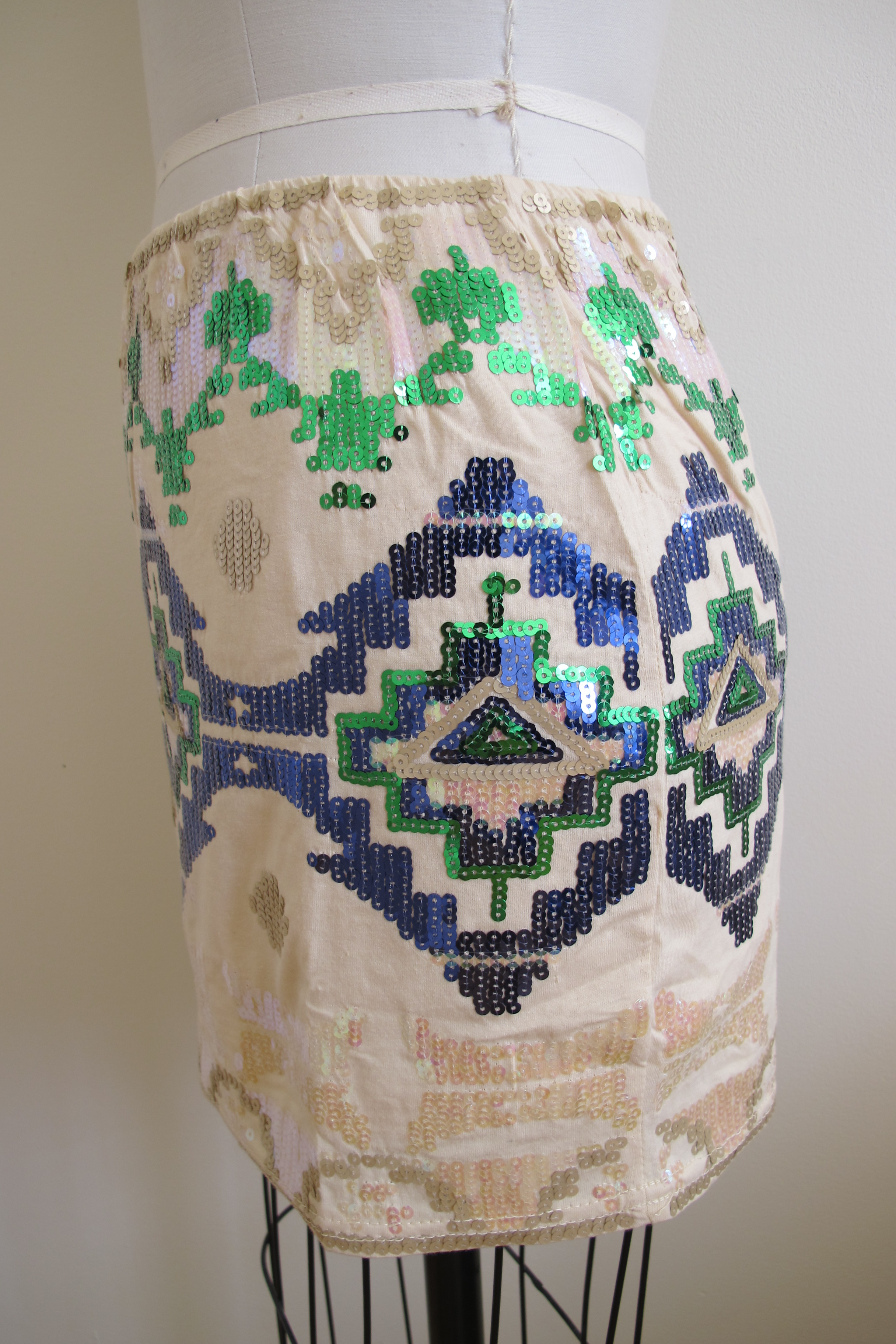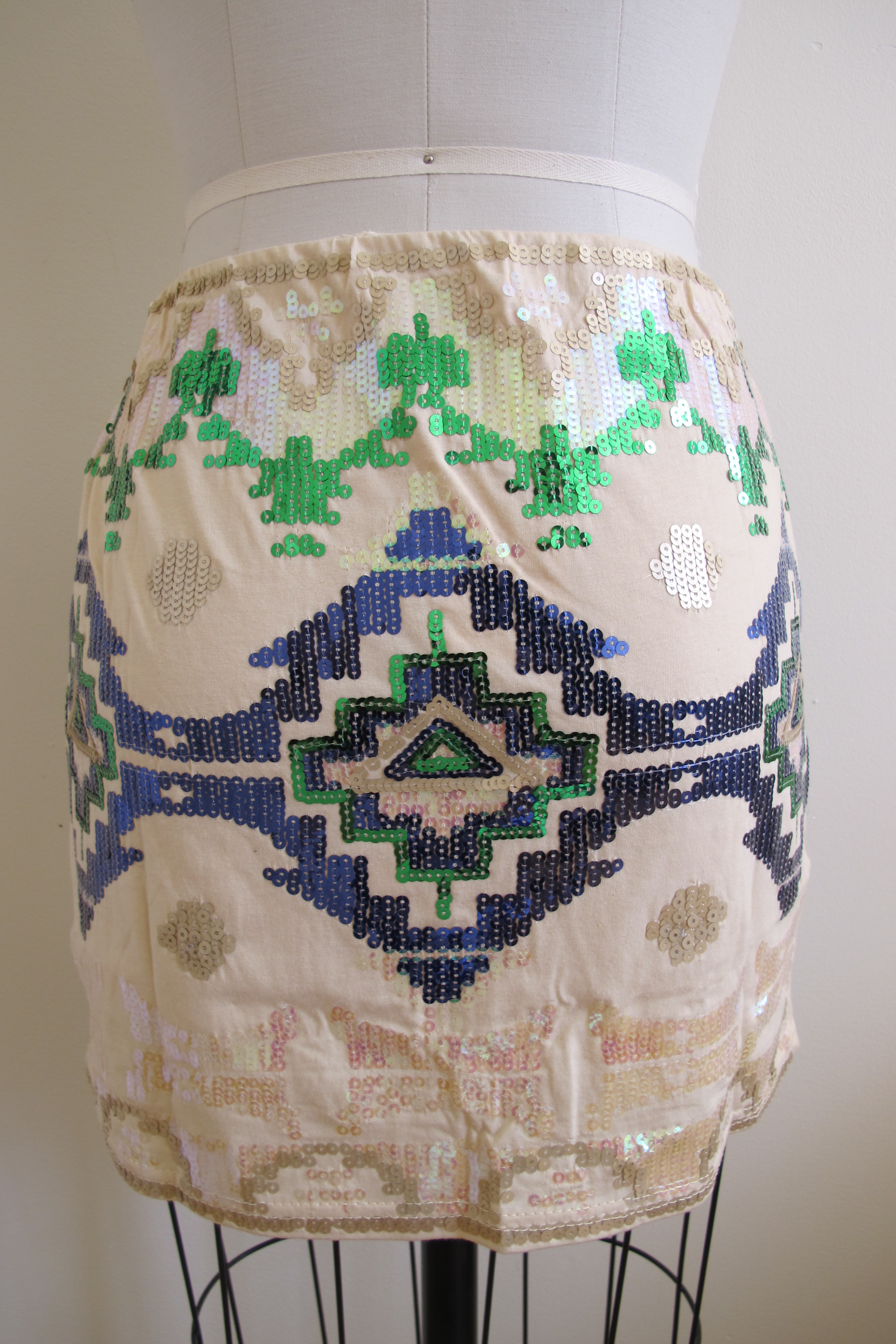 Short skirt with aztec print in sequins. Pair with a denim shirt and a pair of brown cowgirl boots. Enjoy with a Champagne Rum Punch. Sits low on waist Elastic waistband Stretch fabric in lining and shell 100% cotton 14 1/4" long