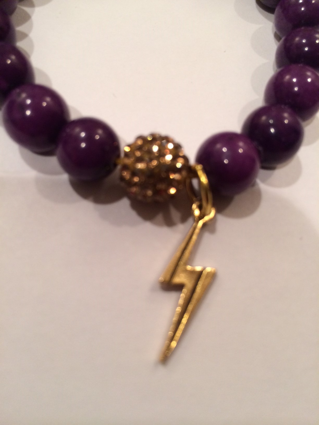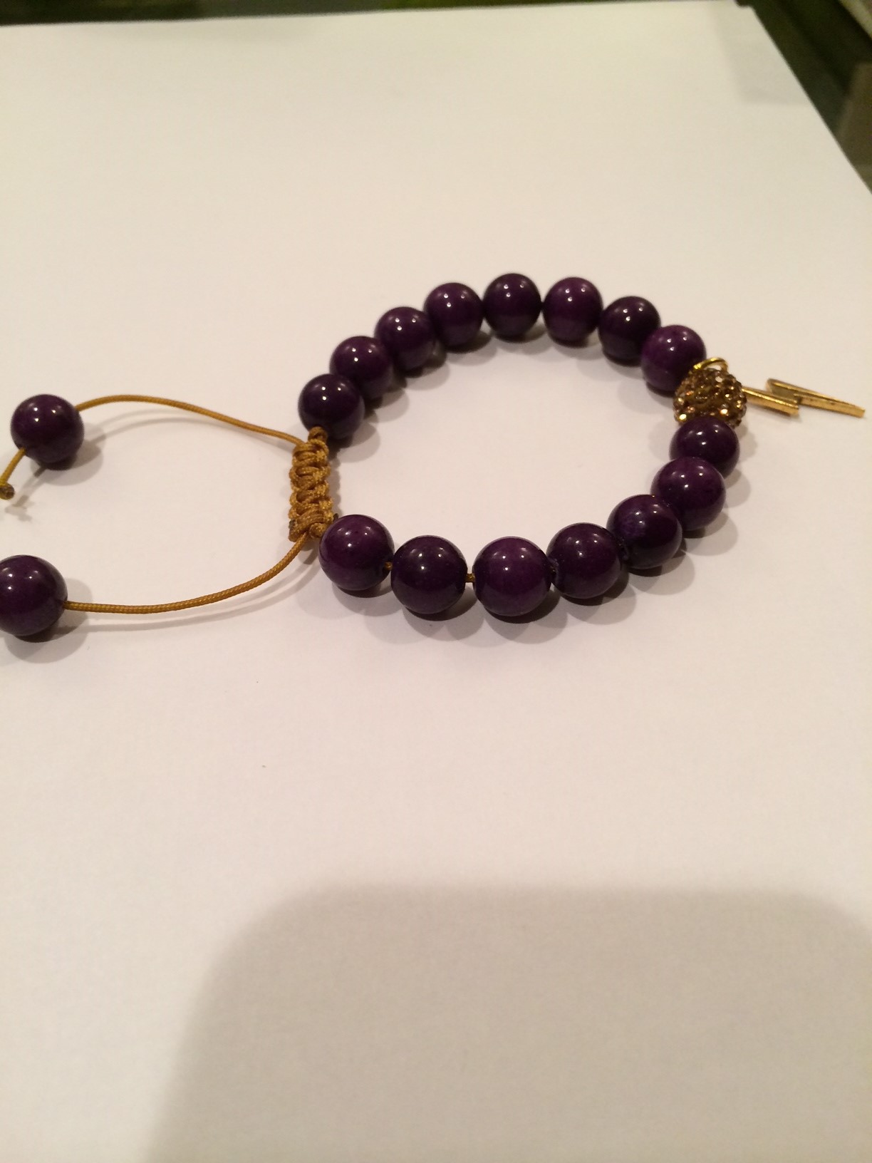 10mm purple gemstone beads, gold alloy beads, old gold nylon cord, and lightning bolt charm.