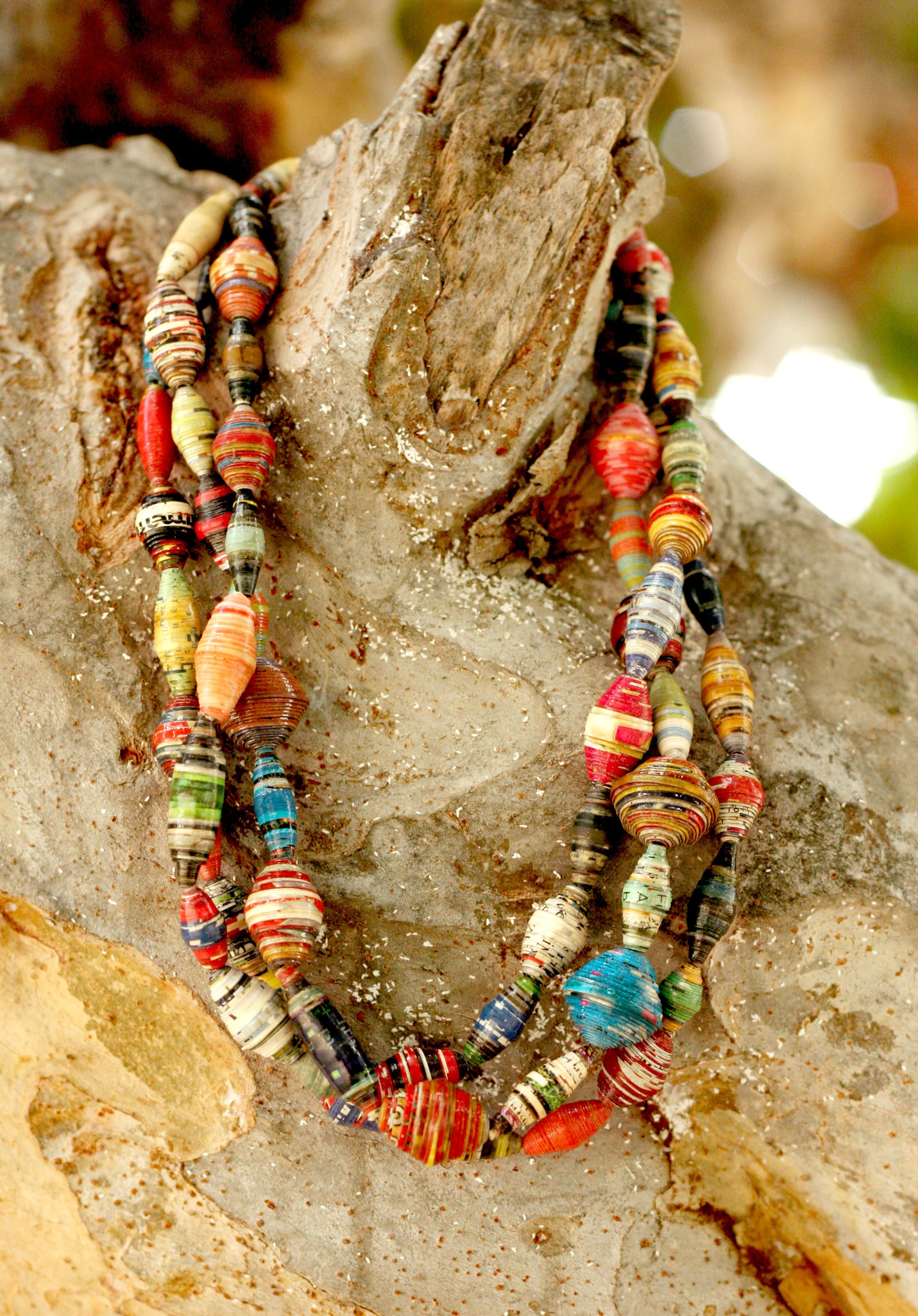 This necklace is made of paper beads in a variety of shapes and colors. Three individual wire strands are connected and joined with a silver colored clasp. Approximately 21"