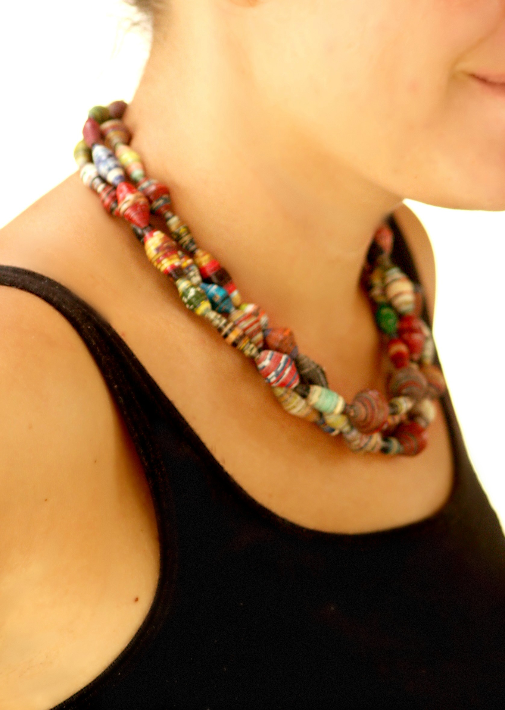 The beads are made from recycled paper, glue and finished with clear varnish. Some paper is provided and everyone buys their glue and varnish at a subsidized rate. Bead makers are now supplementing the provided paper with their own recycled paper and thin cardboard. Beads are made by cutting long, thin triangles from the paper, rolling it over a toothpick and finishing with three layers of varnish to seal it.