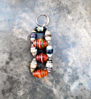 Key chains are made of paper beads, strung in a square pattern on fishing line and connected to a key chain.