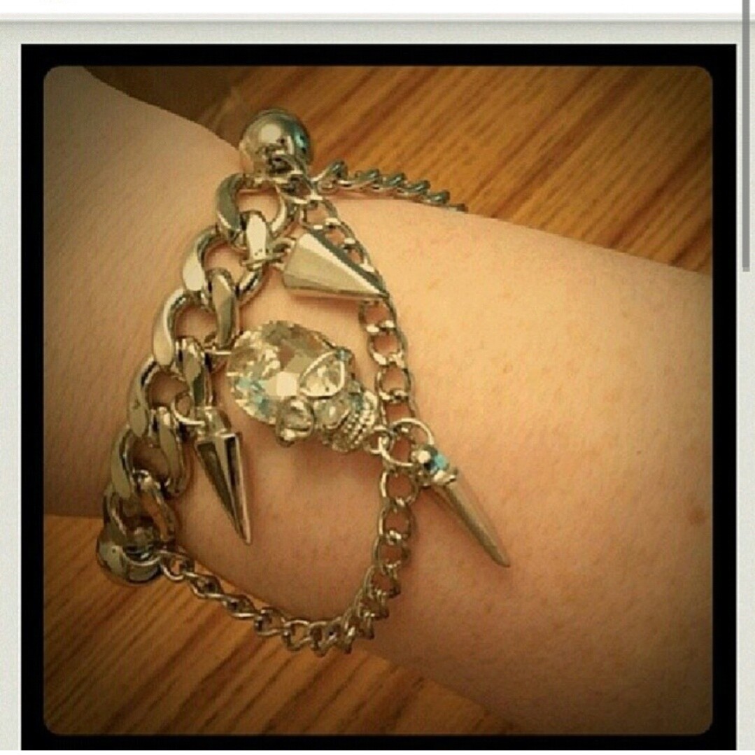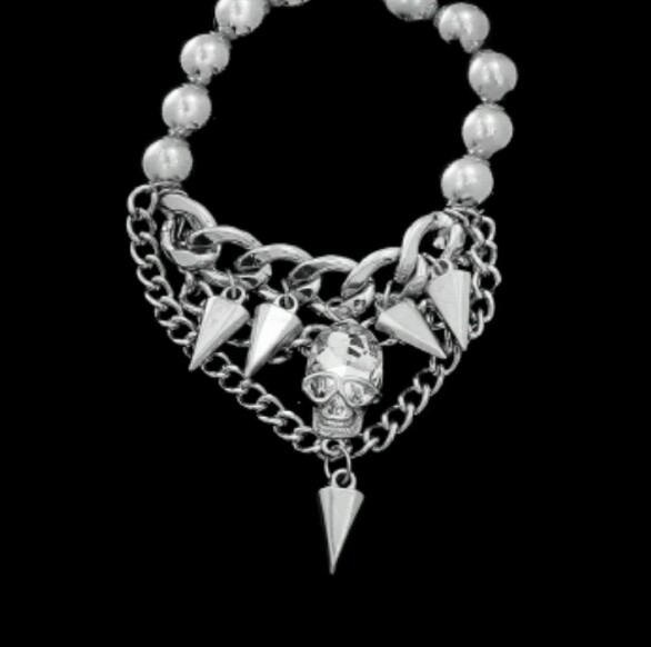 Color : Clear Material: Rhodium ~ Features a layered of chains with hanging spikes and skull pendant.