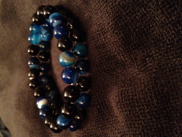 Double Row Bracelet, Featuring Black Jade and Multi Tone Blue Beads. Stretchable