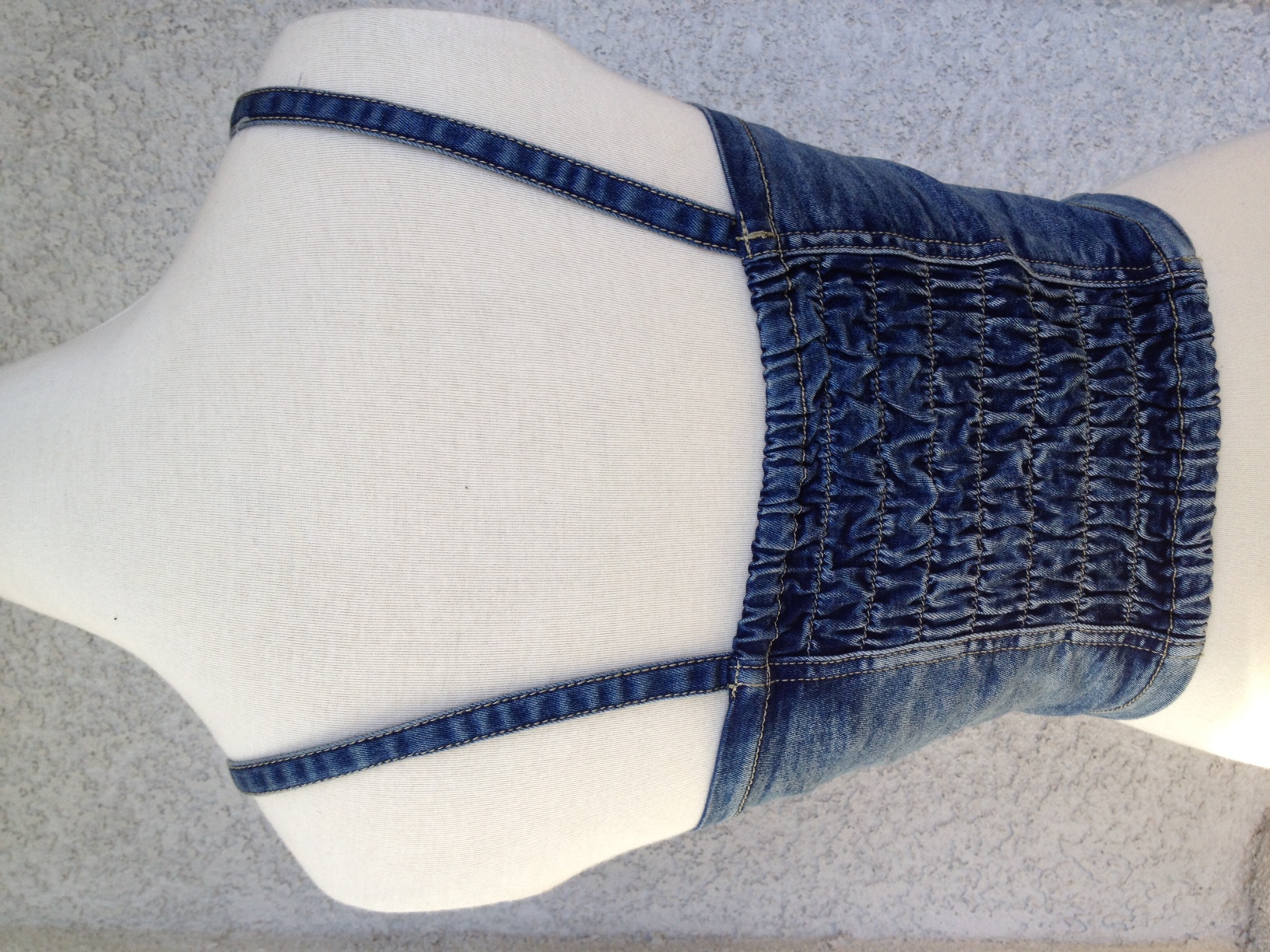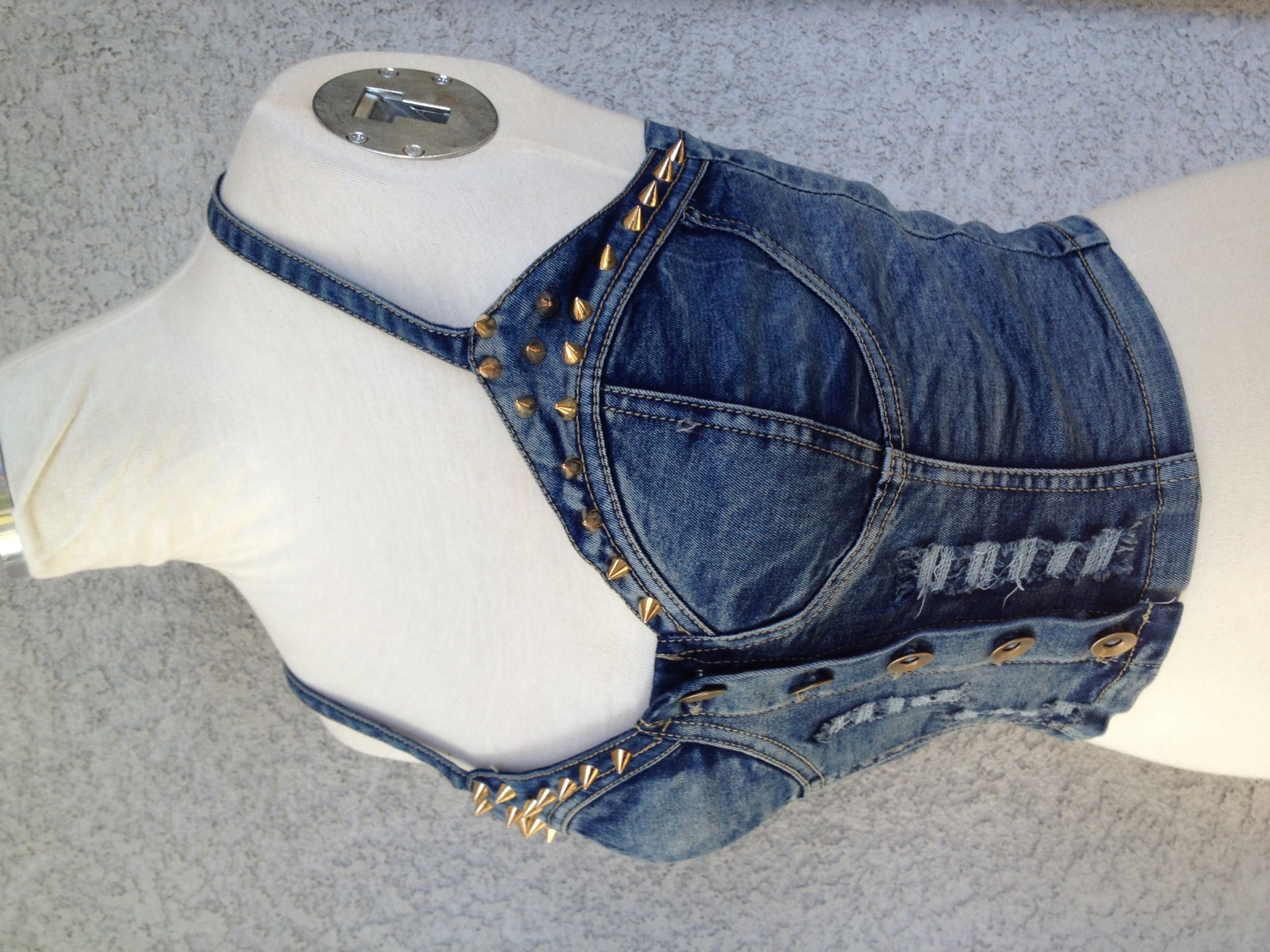 Studded wash denim bustier. Gold studs, buttons and stretchy back. Straps are not adjustable. 45% poly, 55% cotton
