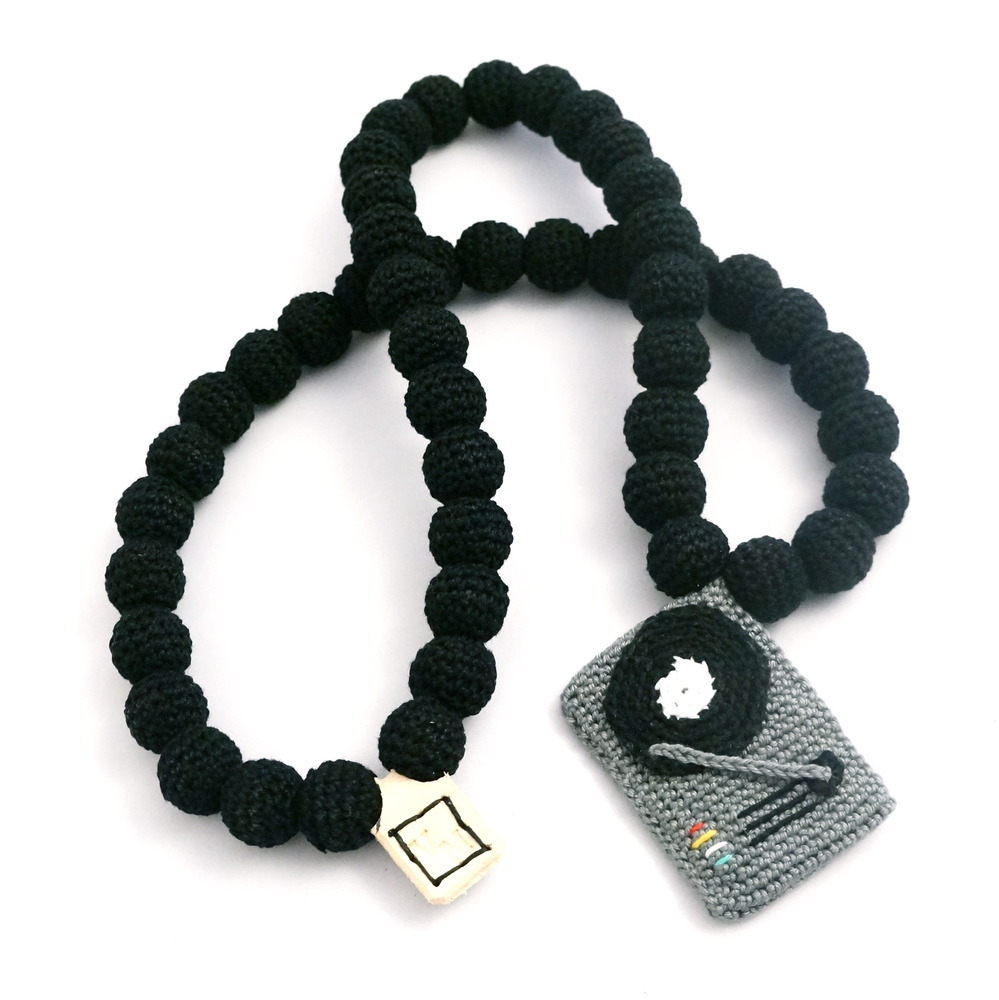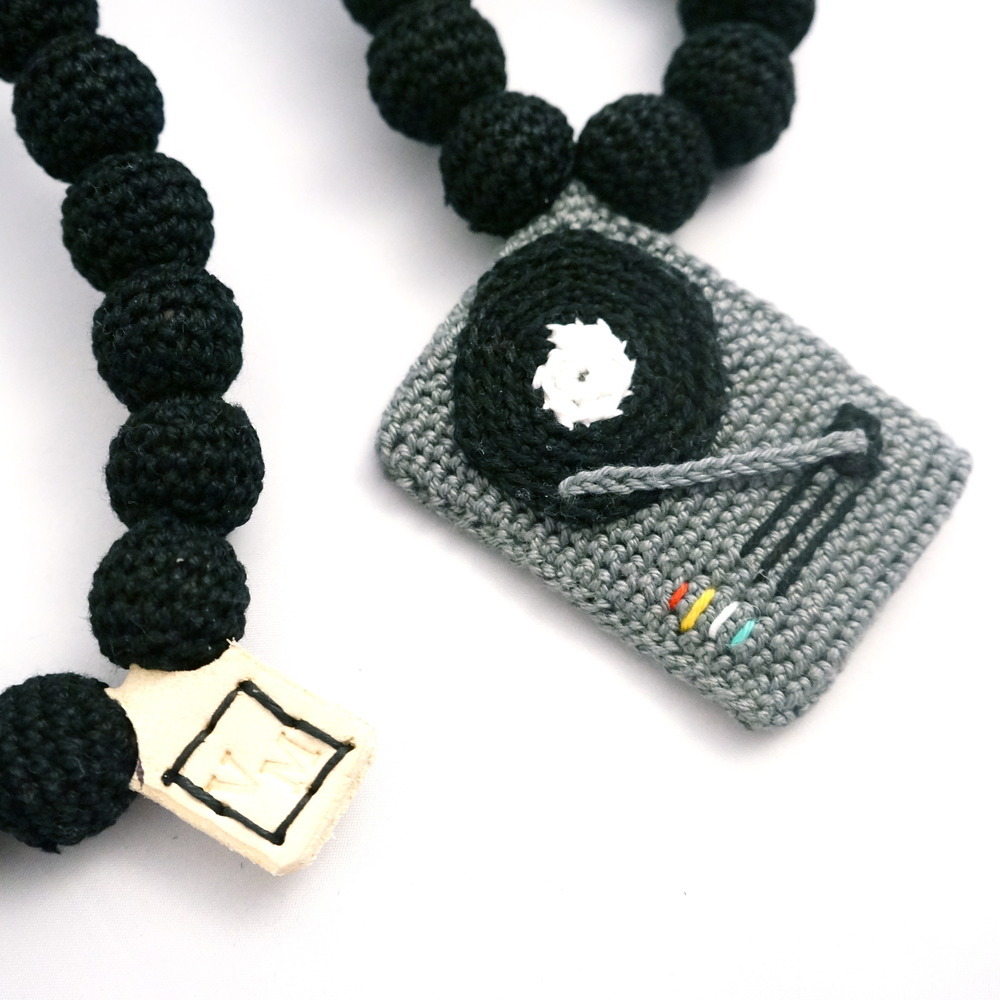 Handmade beaded Necklace with crocheted Pendant and Leather Label. Pendant: 3.5" x 4.4" Necklace: 16.5" Beads: 18mm Materials: yarn (100% cotton), filling material (100% polyester), leather label (real leather), wooden beads, acrylic ball