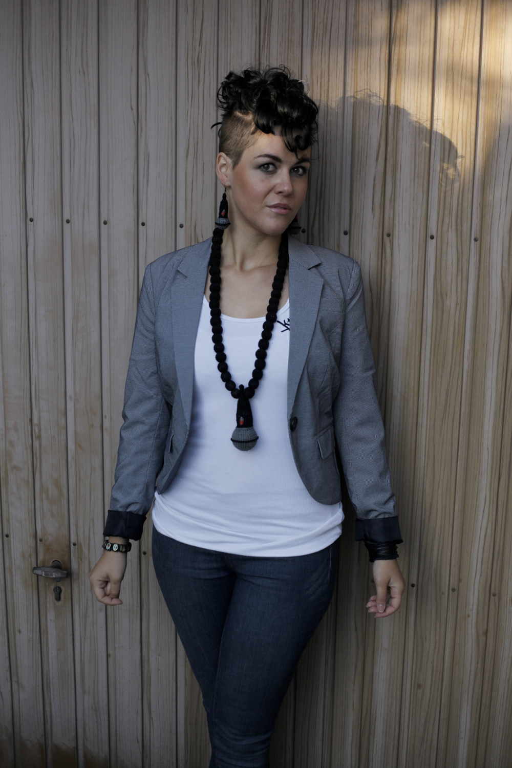 Handmade beaded Necklace with crocheted Pendant and Leather Label. Pendant: 3.5" x 2" Necklace: 16.5" Beads: 18mm Materials: yarn (100% cotton), filling material (100% polyester), leather label (real leather), wooden beads, acrylic ball