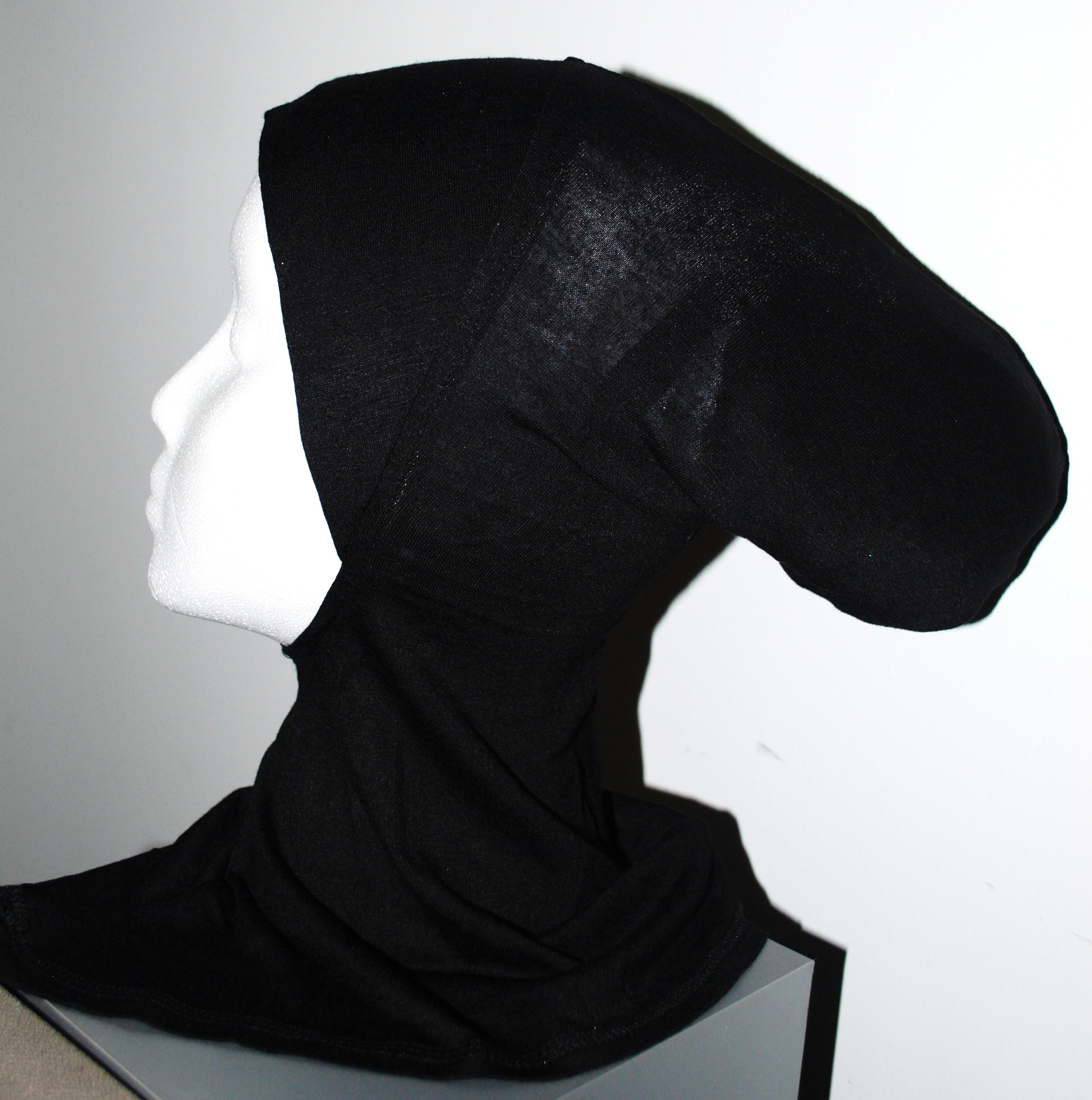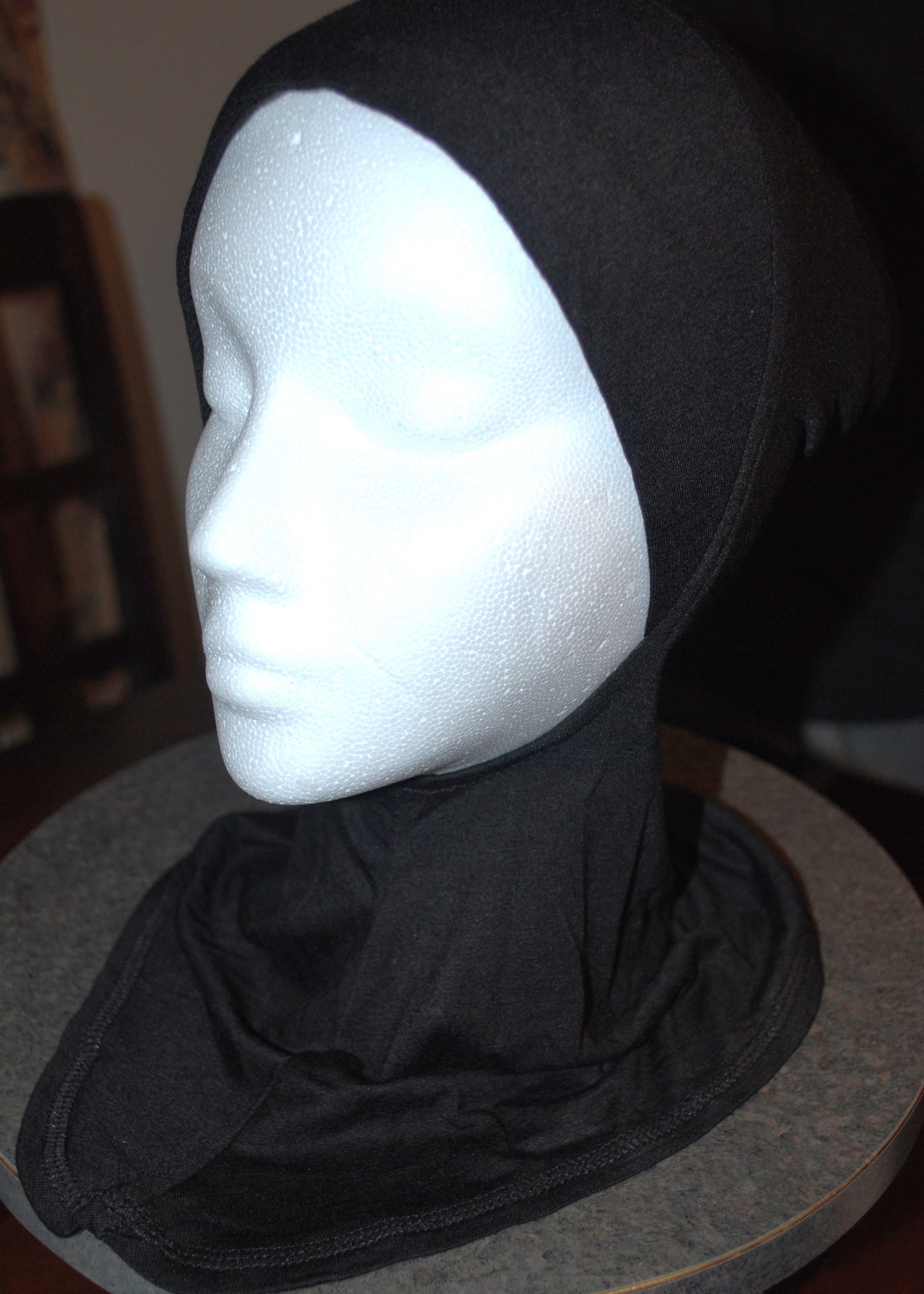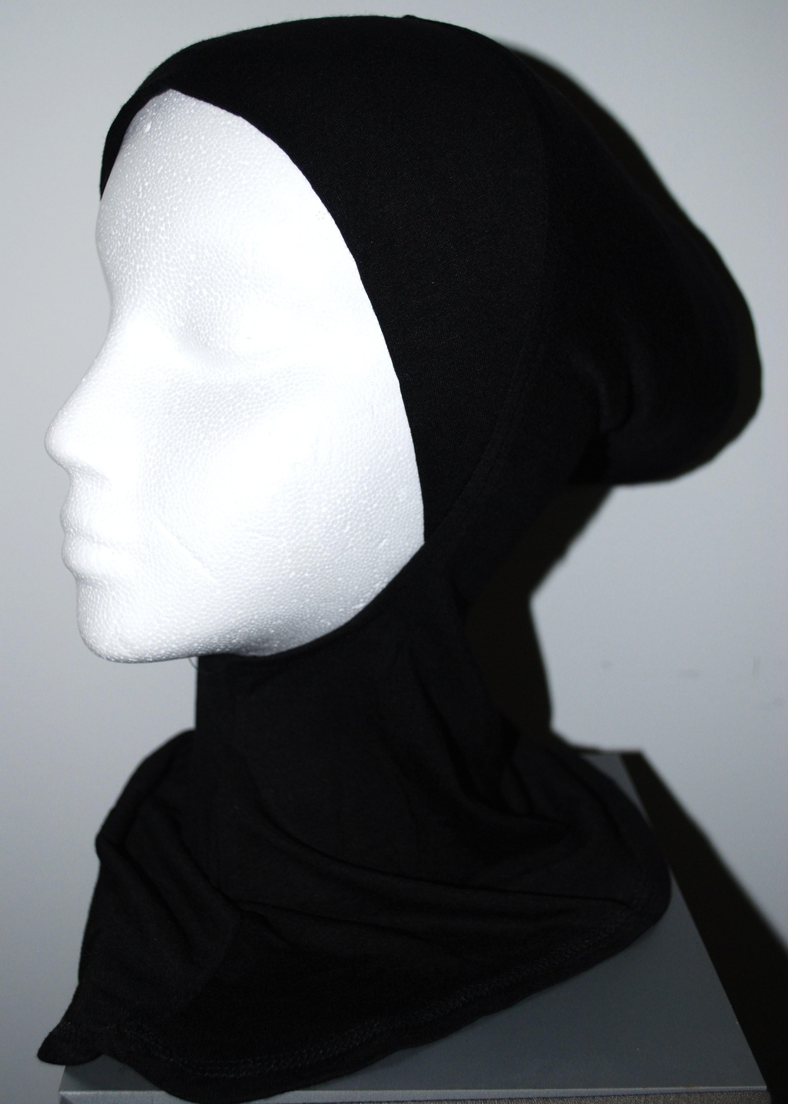 This ninja underscarf is becoming widely popular due to it's versatility & durability. It is made of 100% soft cotton. It is an excellent choice to wear under see through hijabs/duppattas since it covers your neck too. It has plenty of room in the back of the head to cover any length of hair & for a volumizer too. One piece, can easily be pulled over your head & neck. Great for the sisters, who like to wear earrings with their hijabs...with this ninja underscarf, you can effortlessly wear them out. *** Hand wash only. Color - Black