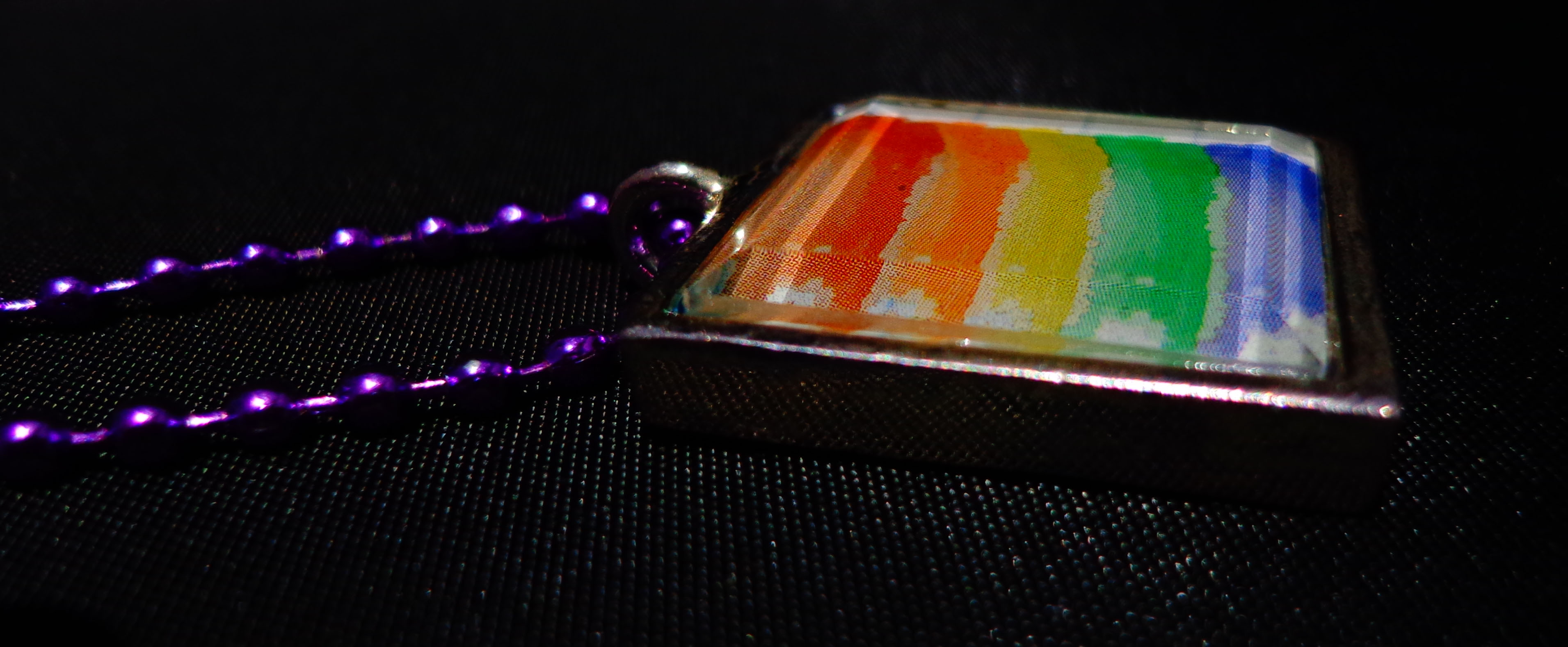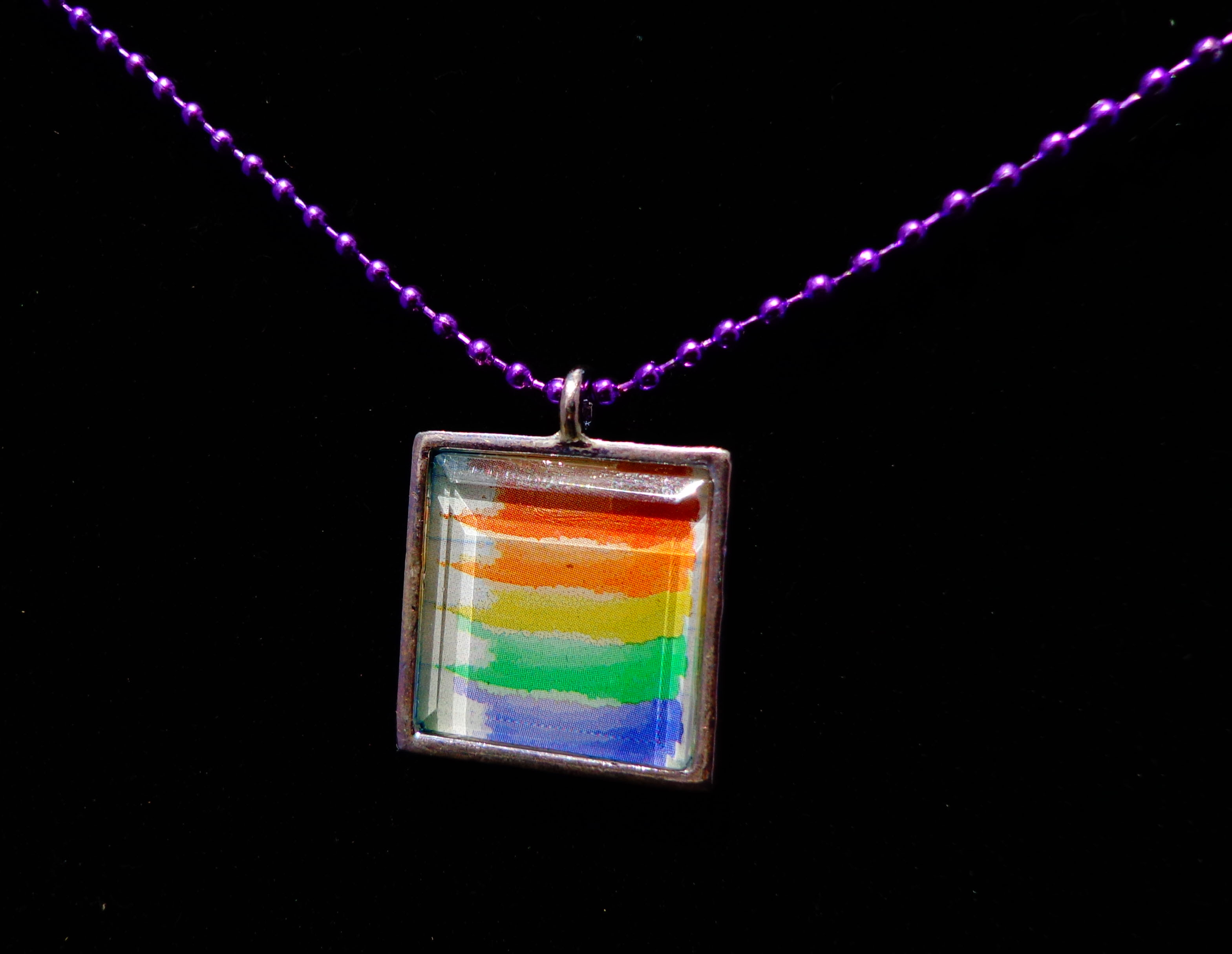 - Painte Rainbow Stripes - About 1 inch square - Silver Tile - Purple Ball chain, 19".
