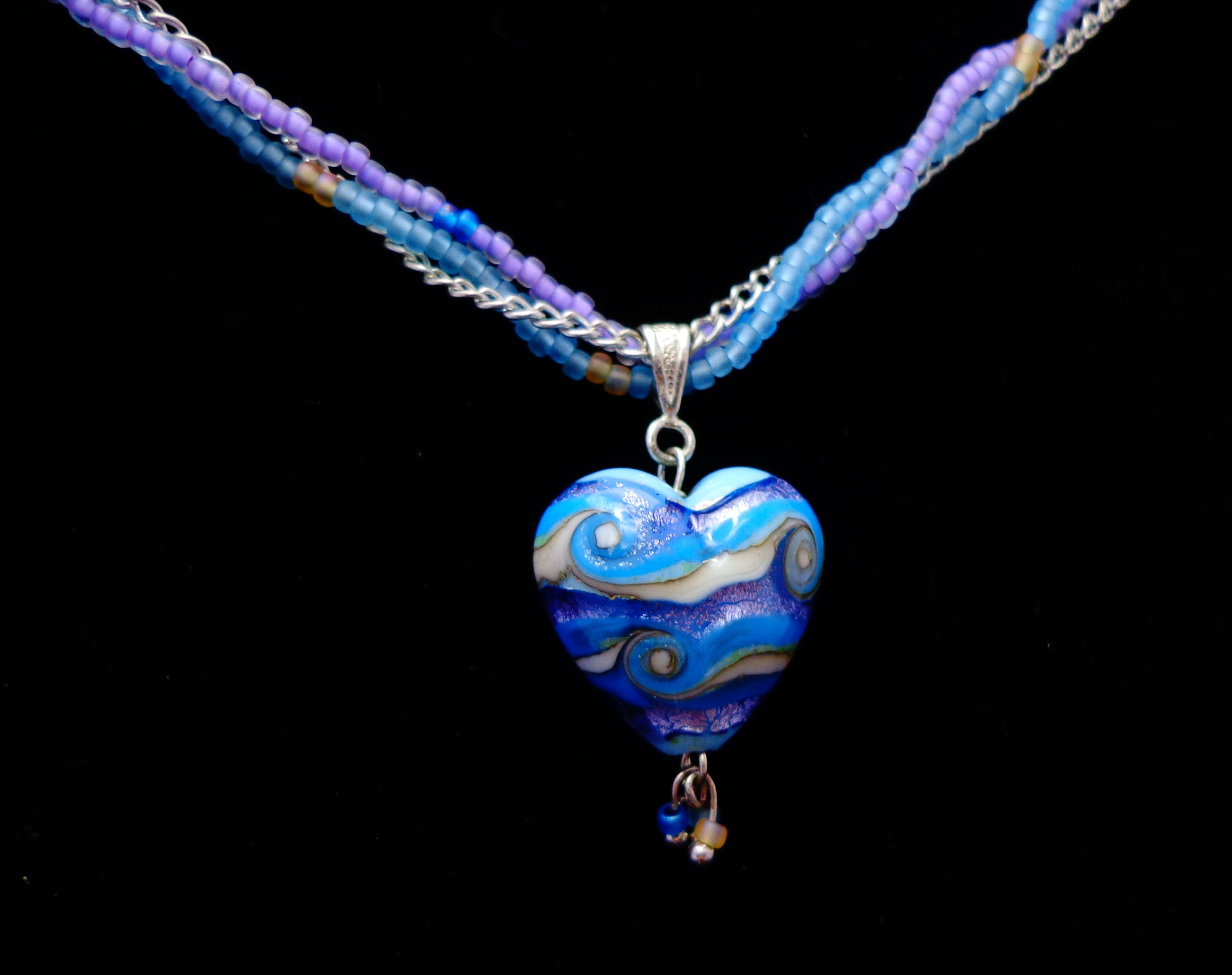 Beautiful blue, purple and gold swirled heart with a coordinated braided beaded chain.