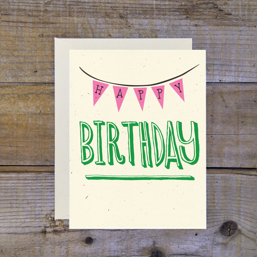 Tell someone "Happy Birthday" with this decorated card. Our cards are small batch printed with eco-friendly ink on 100% recycled paper by French Paper Co. Cards are 5.5-in x 4.25-in, blank inside and come with an envelope in a protective sleeve.