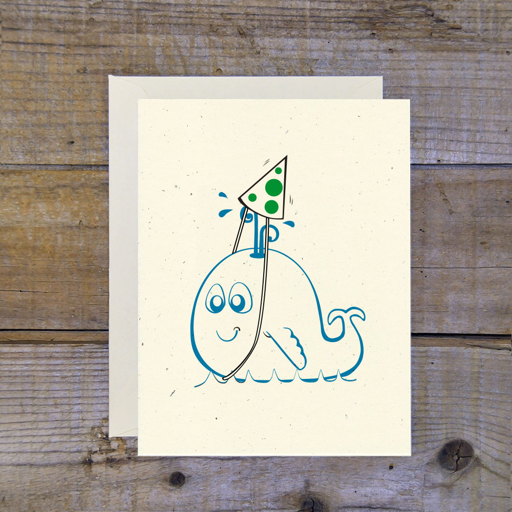 This lets that birthday someone know you're ready to have a whale of a time! Our cards are small batch printed with eco-friendly ink on 100% recycled paper by French Paper Co. Cards are 5.5-in x 4.25-in, blank inside and come with an envelope in a protective sleeve.