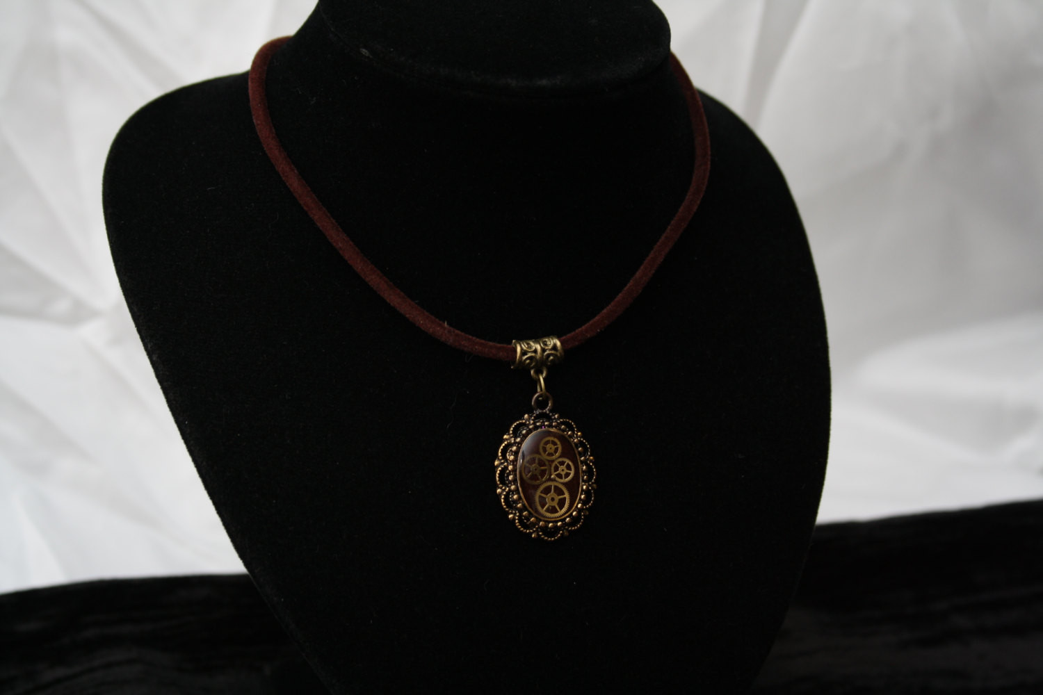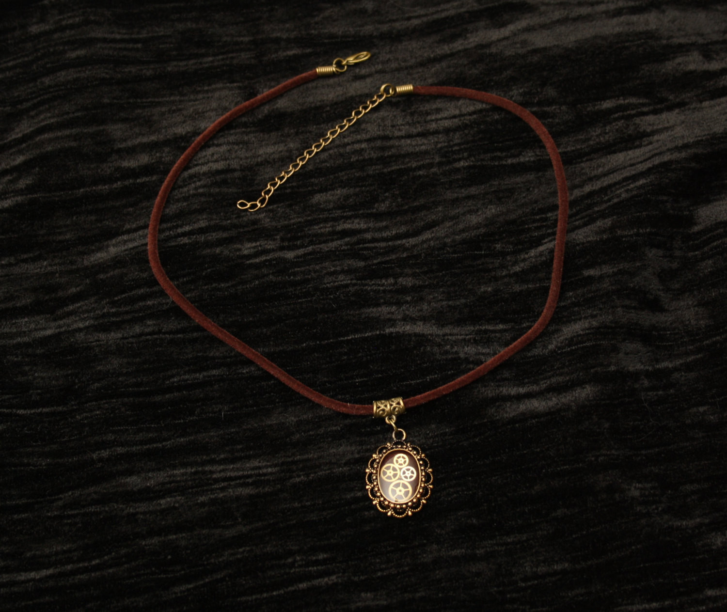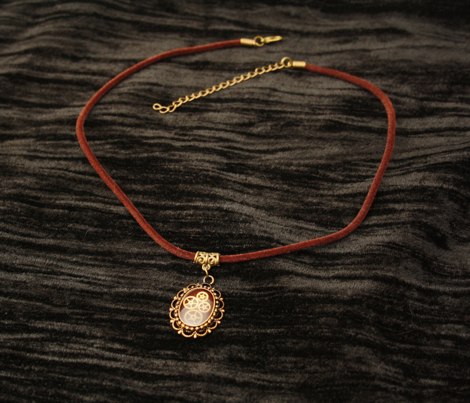 Steampunk pendant containing tiny watch gears on a brown background, encased in resin, strung on brown velvet cord.