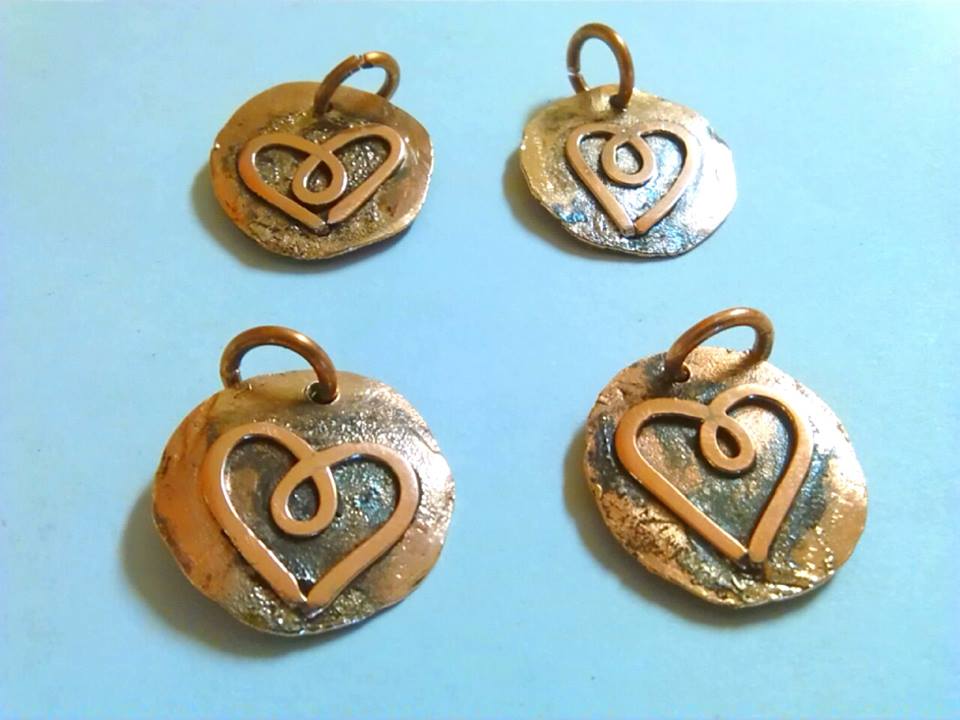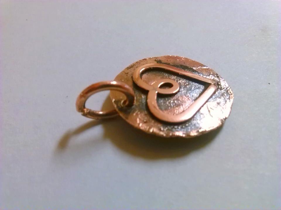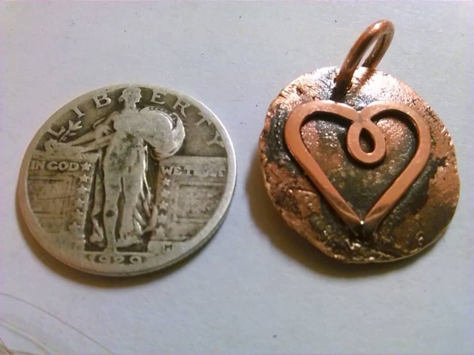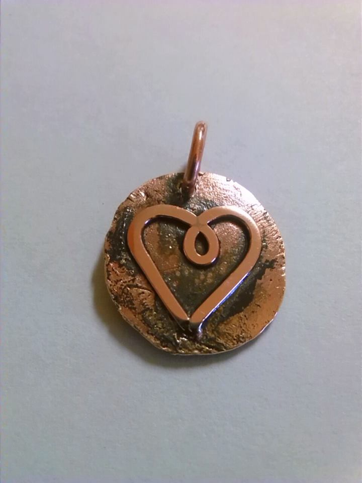 I hand hammered and formed this copper heart penny pendant from repurposed copper wire and an old copper penny. After I hammered out and formed the separate pieces with a hammer and anvil I silver soldered them using a torch to secure them together. I then buffed out the raised heart to a beautiful and shiny finish. Finally I added a hand made copper jump ring to attach it to a necklace.