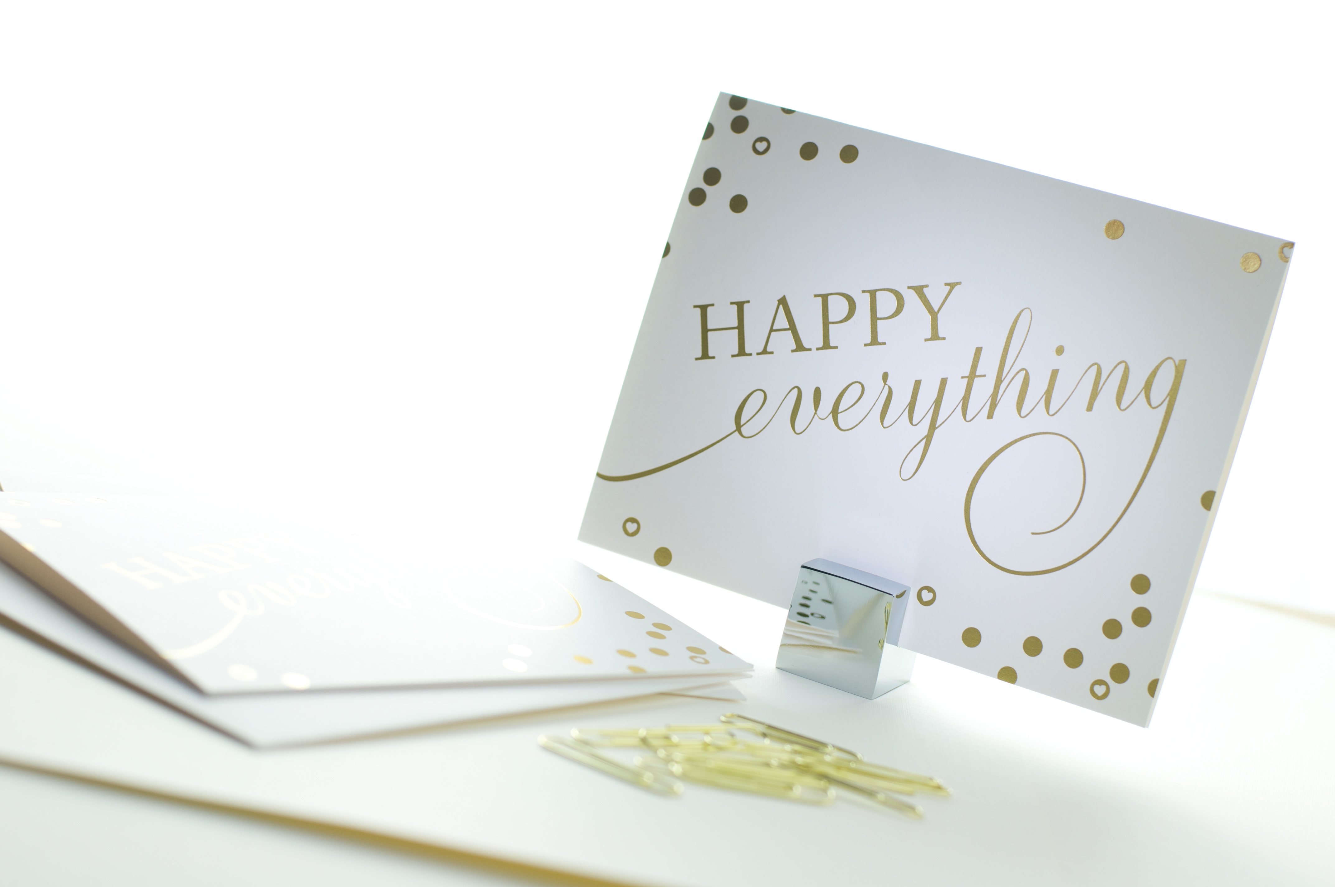 Are you looking for a card to wish a special someone a happy birthday? Happy anniversary? Why not just wish them Happy Everything!!! This lovely card will capture their hearts. - A2 size (5.5"x4.5" when folded) - Blank interior - Gold foiled on bright white cover paper - Matching white envelope - Printed locally in the US - Set of 5 cards