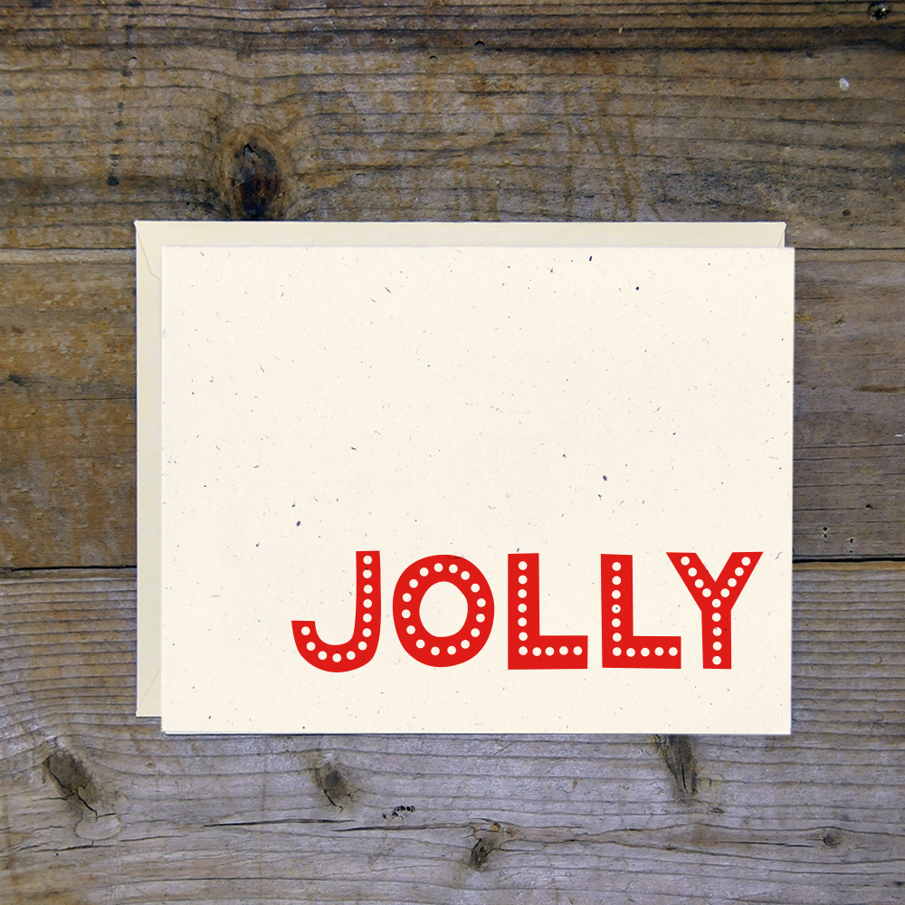 Spread the jolliness! Our cards are small batch printed with eco-friendly ink on 100% recycled paper by French Paper Co. Cards are 5.5-in x 4.25-in, blank inside and come with an envelope in a protective sleeve.