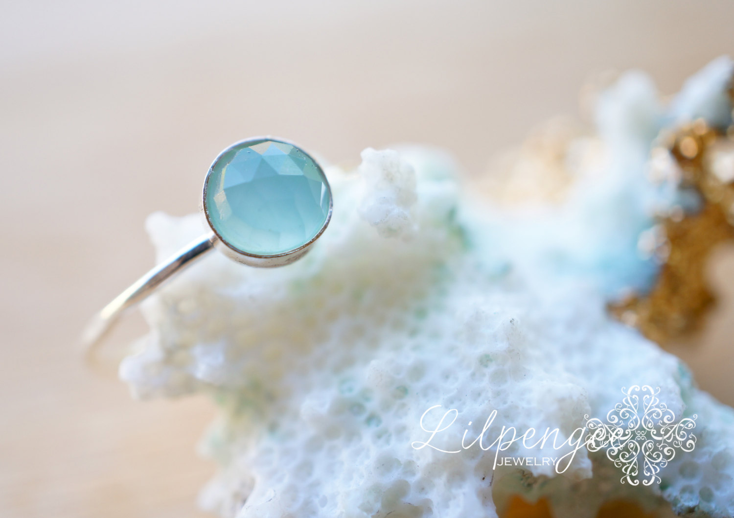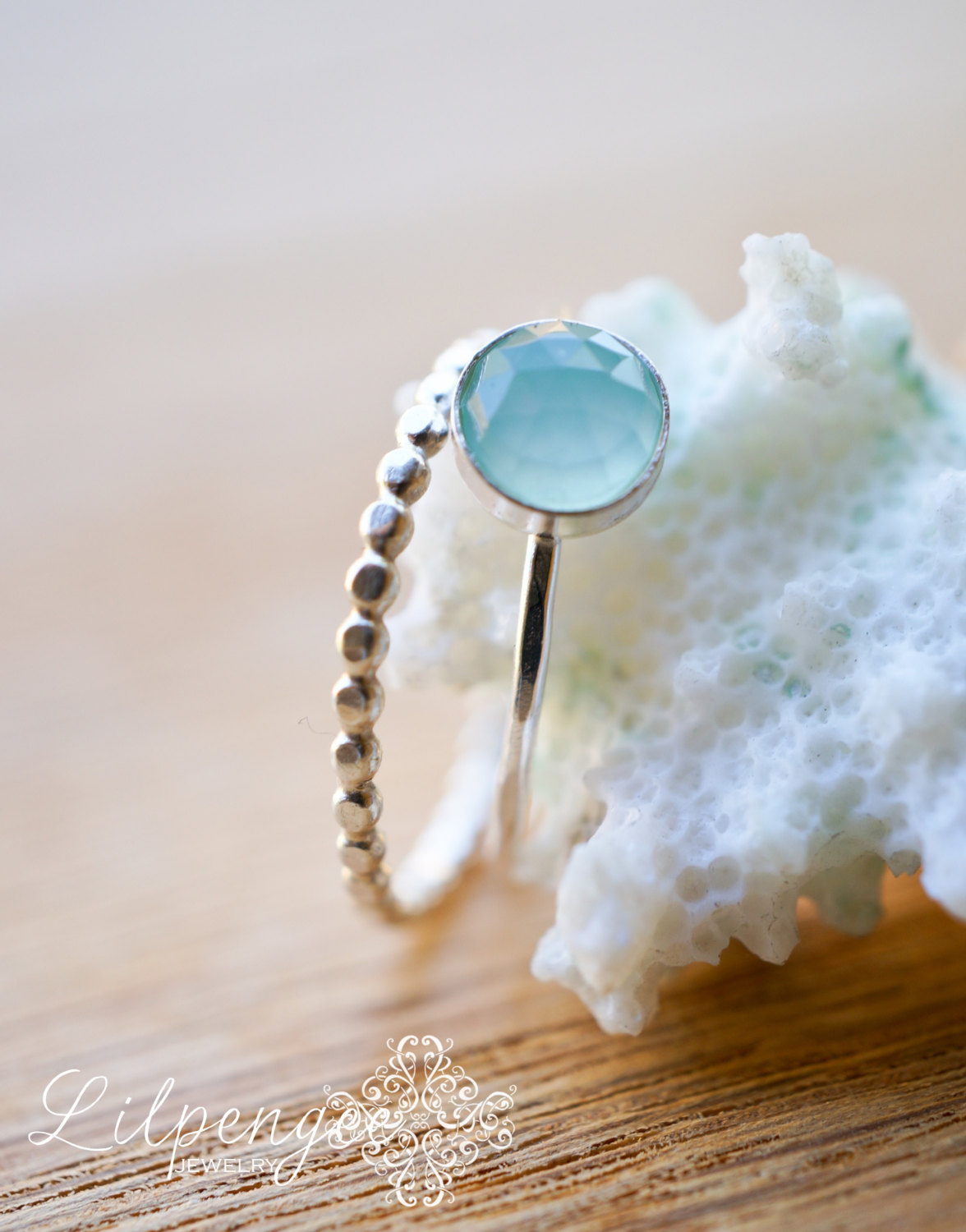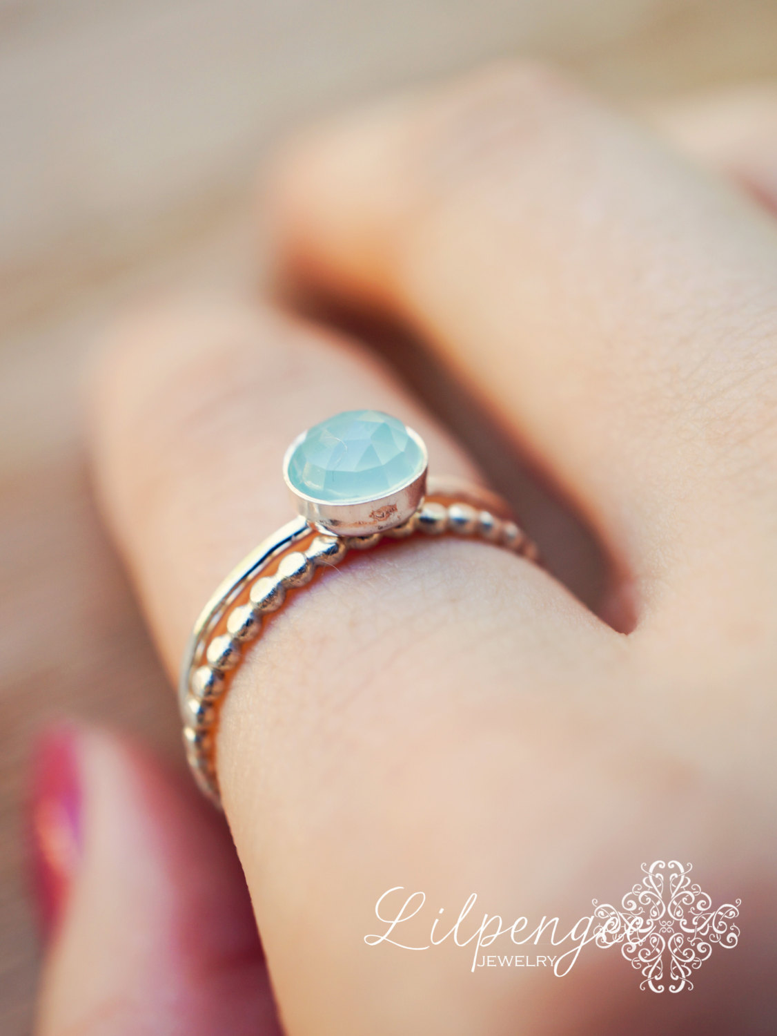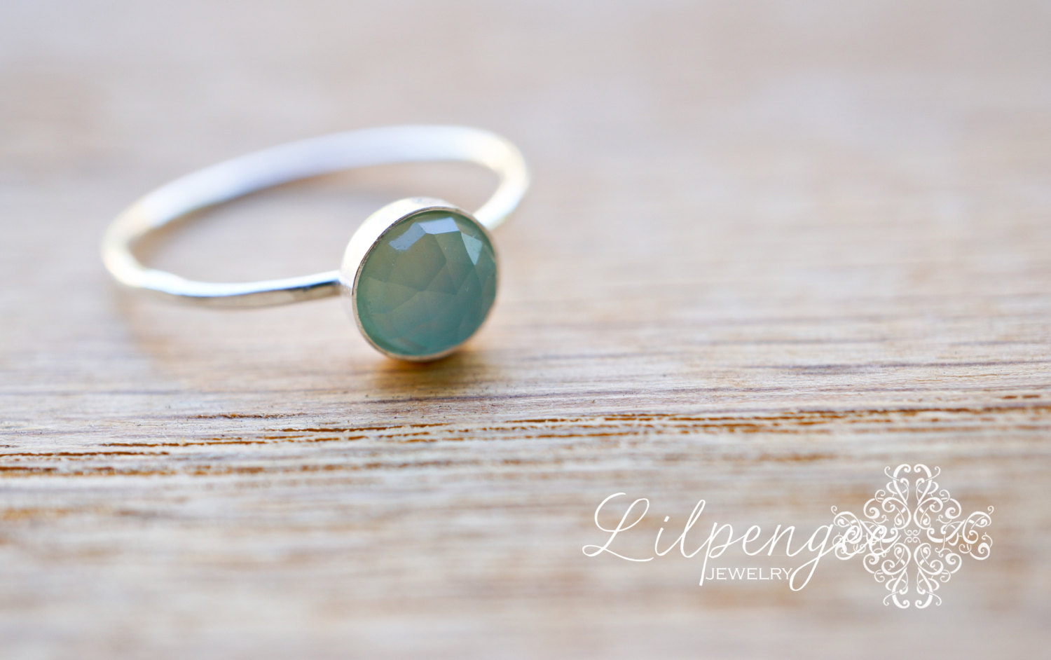 A beautiful, 6mm aqua chalcedony gemstone is set atop a lightly hammered slim sterling silver band. Simple & elegant. Great for stacking.