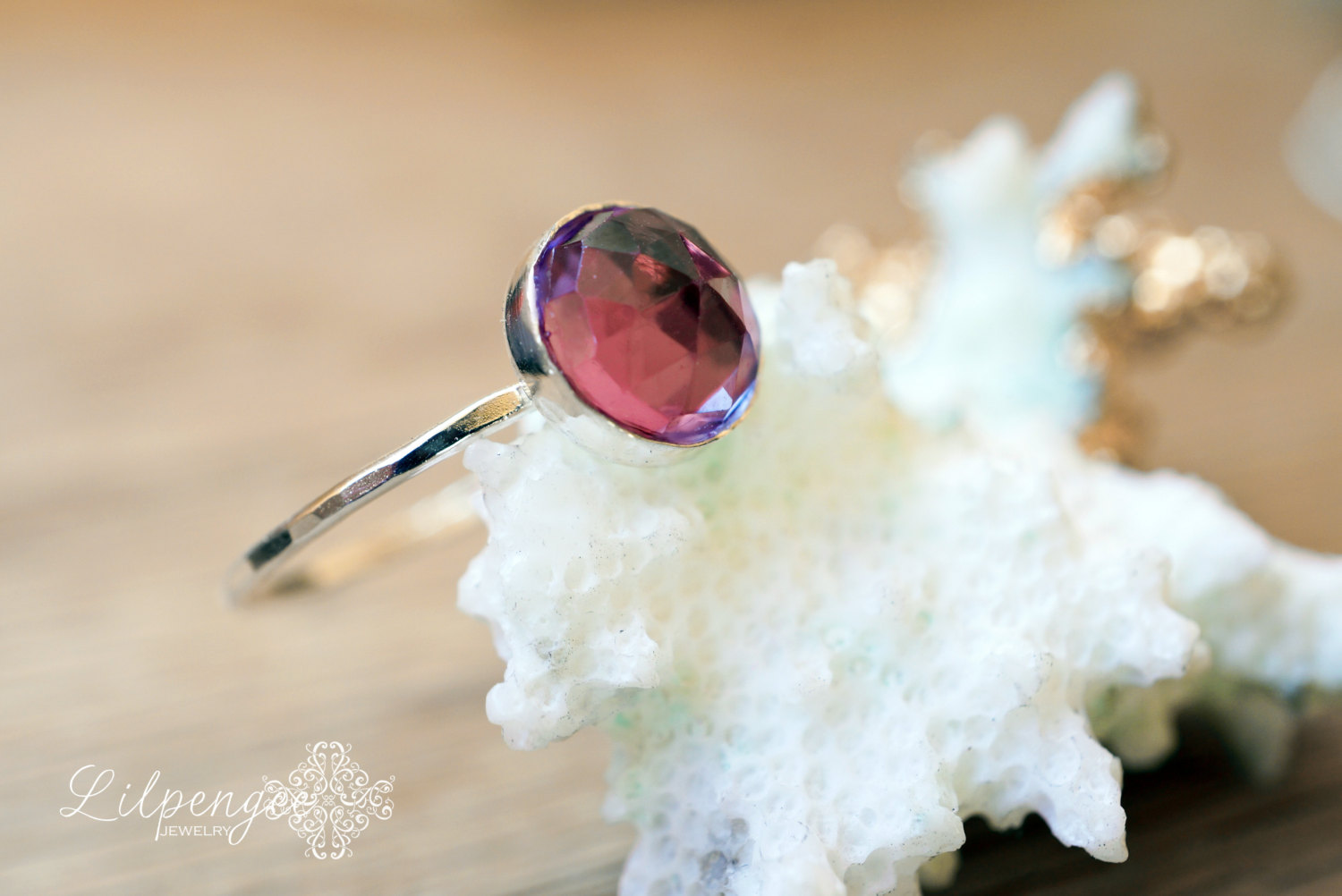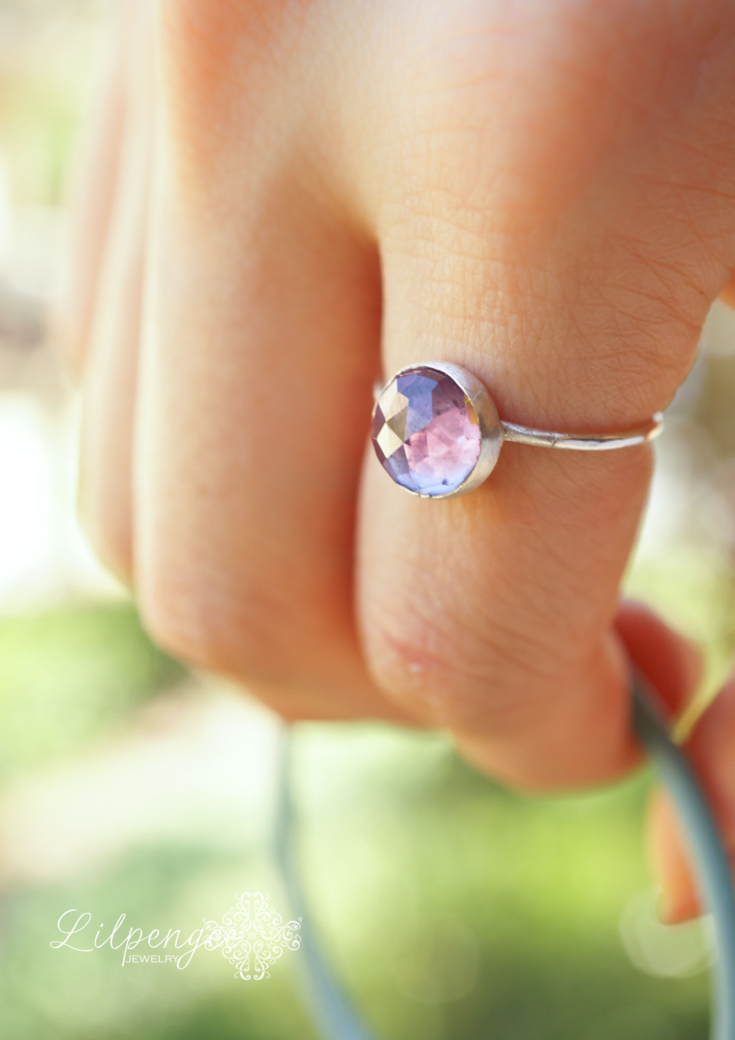 A sparkling 8mm lab alexandrite is set on a thin sterling silver band.