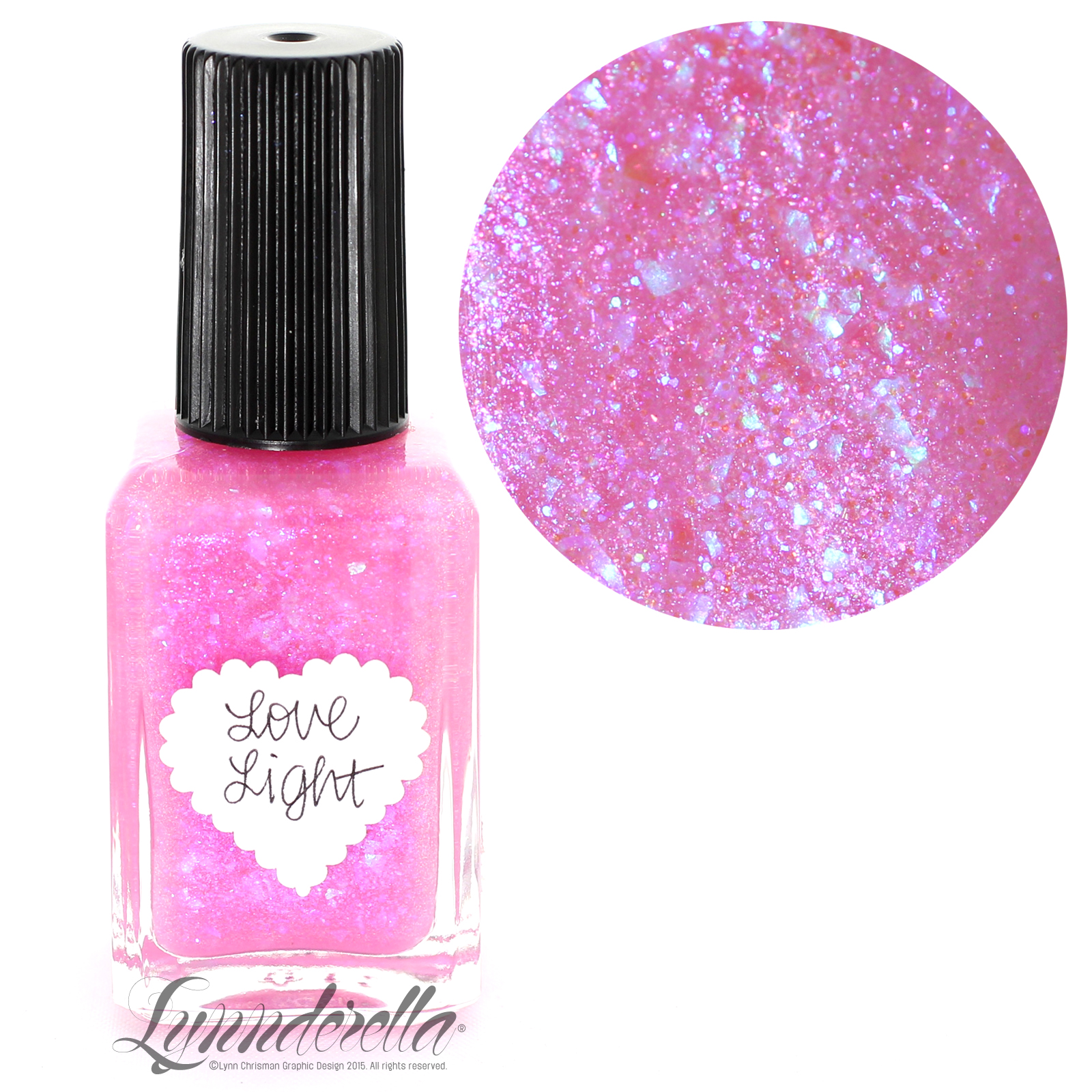 LoveLight is a translucent pastel fuchsia with strong hot pink shimmer and blue flecks. Soft and delicate as a topping. Subtle prettiness on a French Manicure. (It does not darken the Tranzitional China Glaze like topcoat, but brings out a vivid periwinkle.)