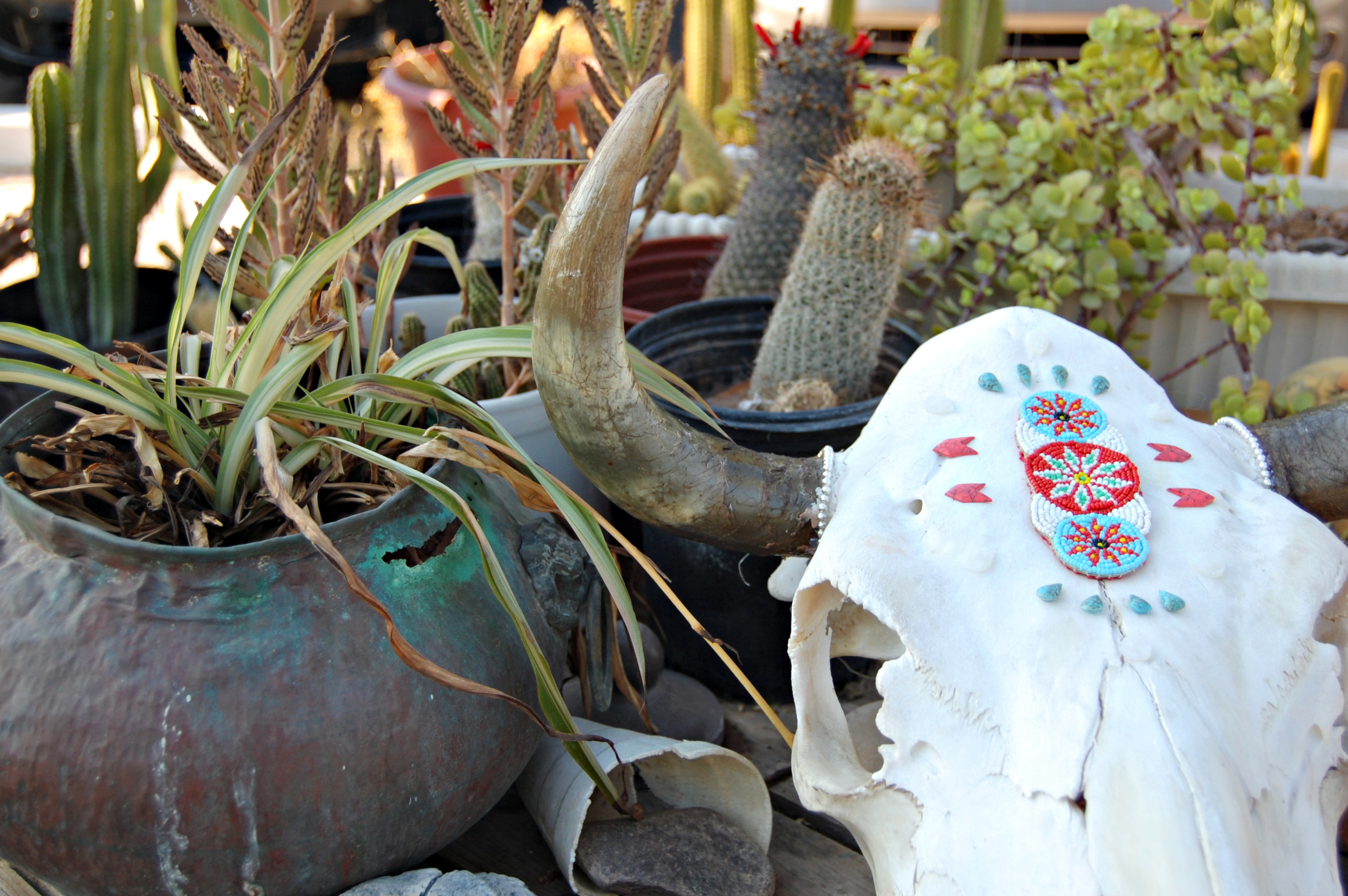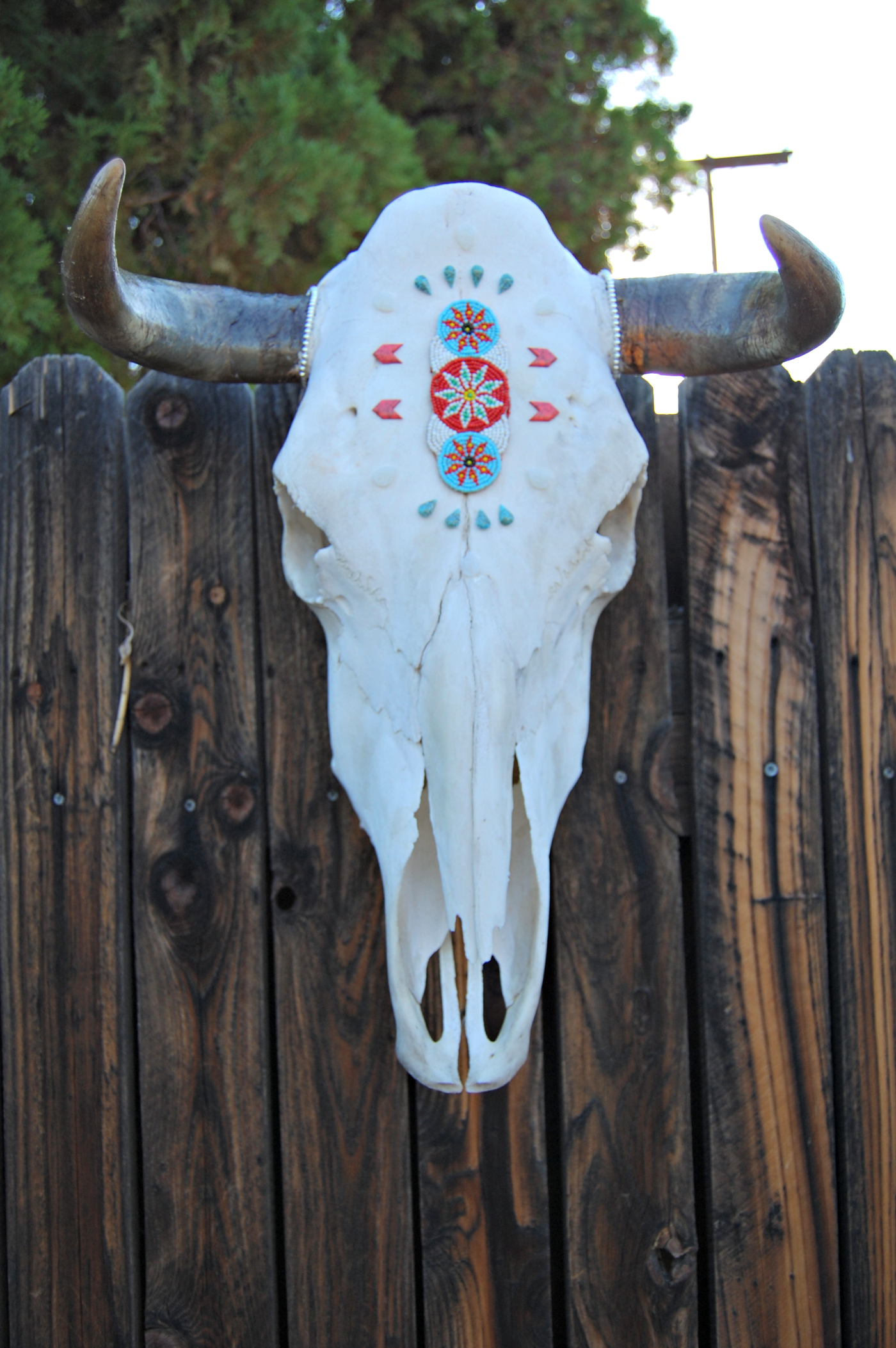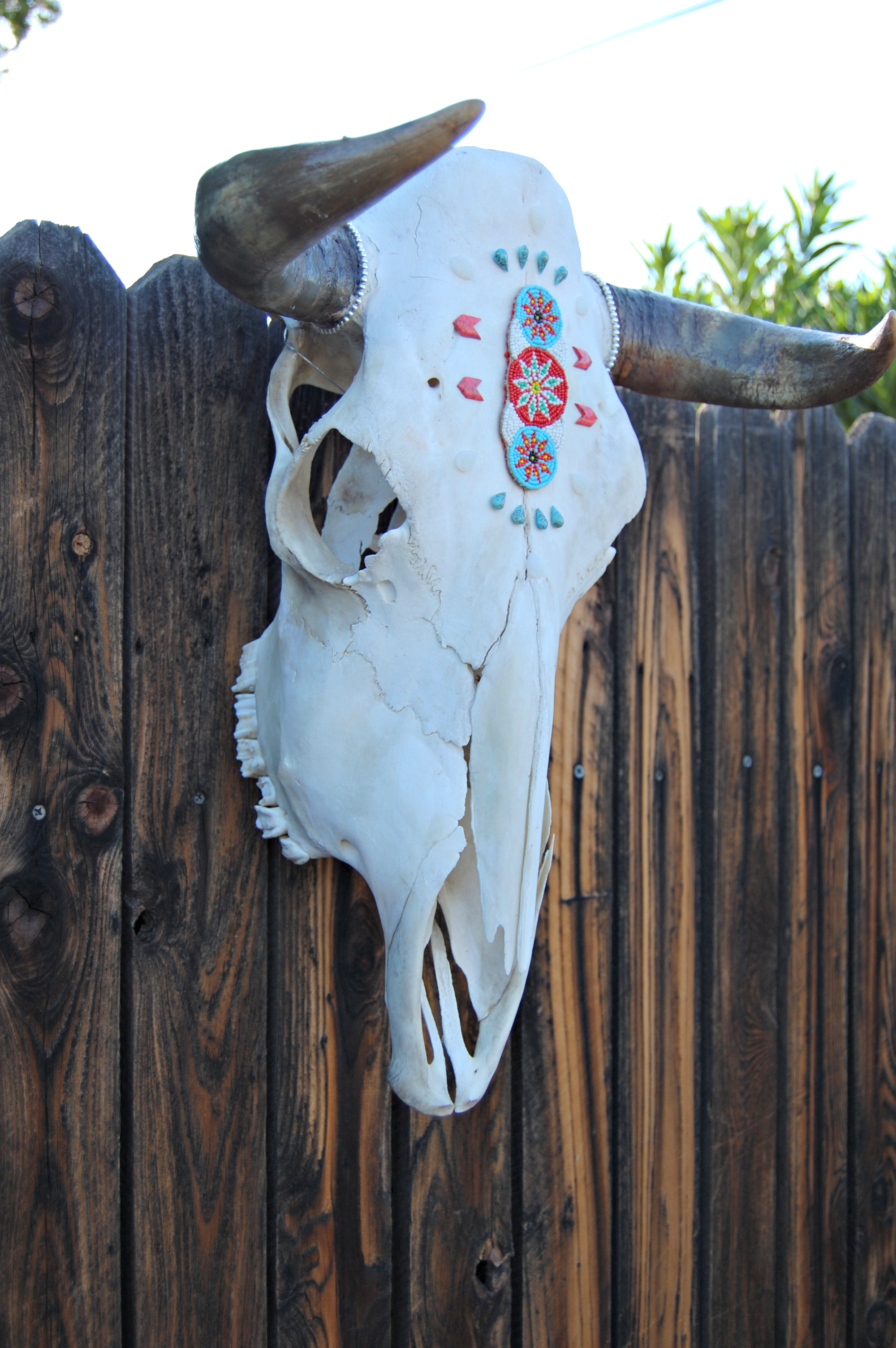 All of our cow skulls are authentic and each is unique in its own way. Once the skull is cleaned and bleached, it is then adorned with hand-picked embellishments and sometimes coated with clear varnish or paints. The items used to decorate the skulls are often one-of-a-kind, vintage or just freakin' cool. It may take us months to acquire all of the adornments just for one skull, because, well, a vision is a vision. Hours upon hours go into making each piece, for we fully embrace our Type-A personalities when it comes to bringing a specific vision to life.