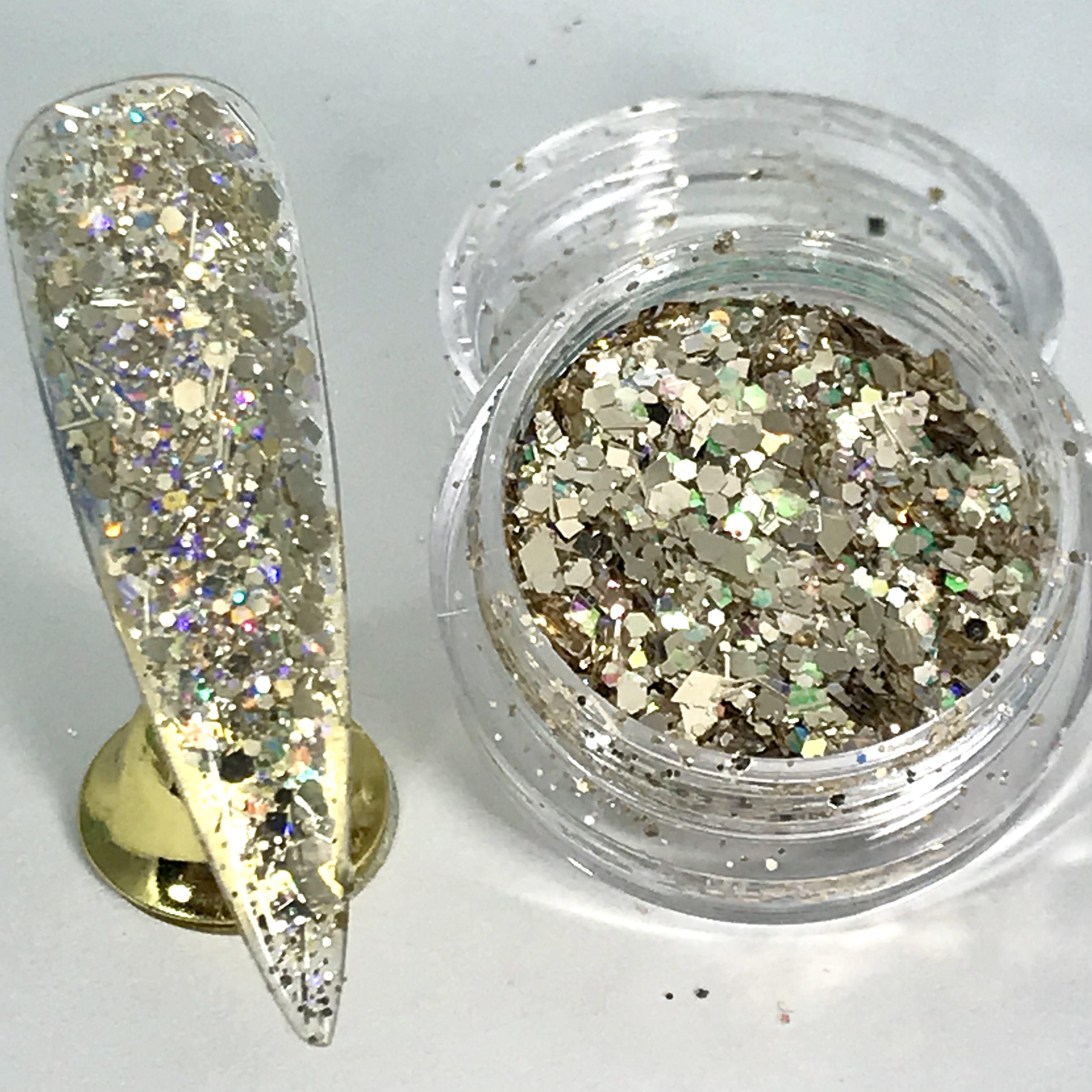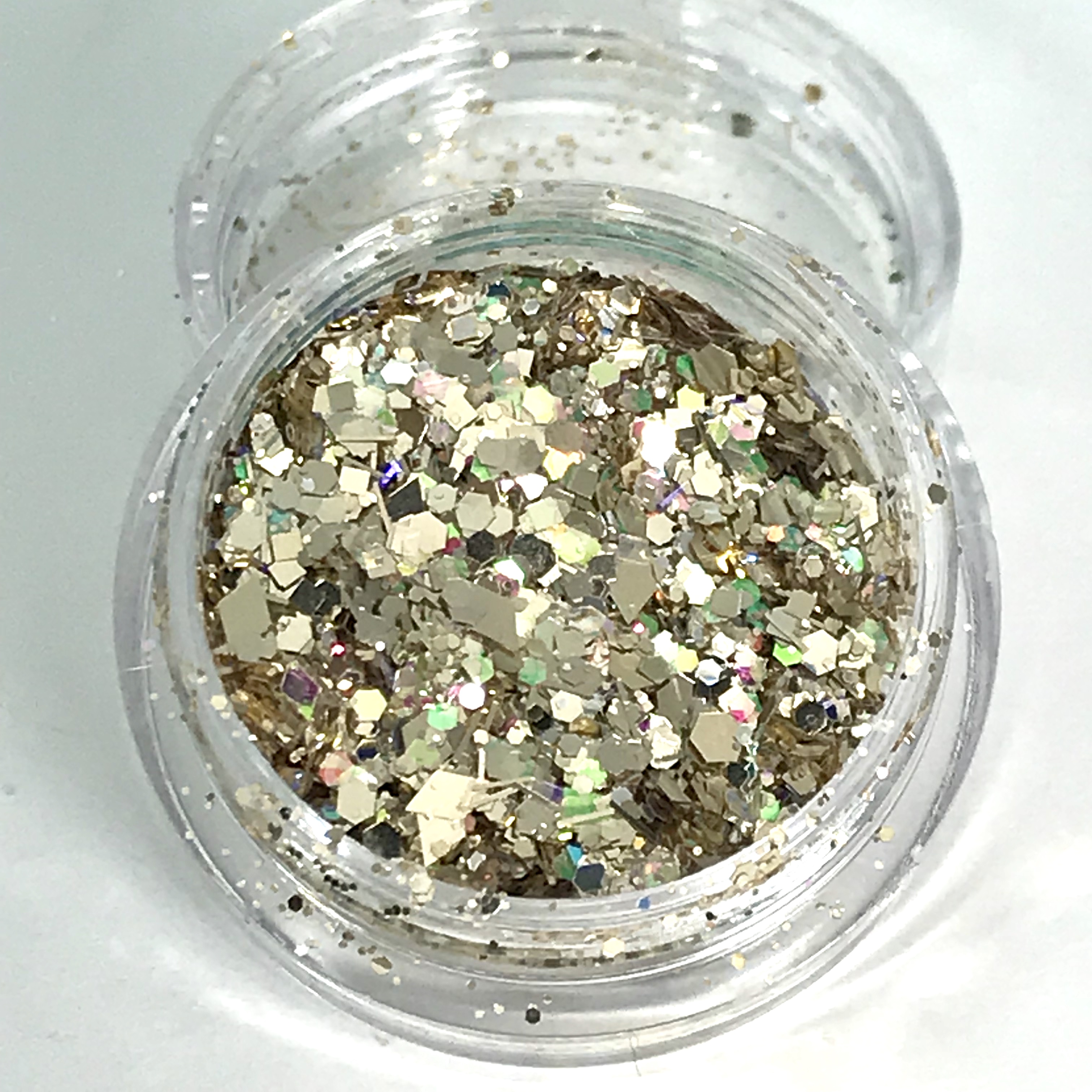 This is a beautiful unique Gold custom glitter mix that has been created using diamonds, hexagons, iridescent and holographic glitters. There are some matte glitters that give it a unique touch. You will receive 1 Teaspoon(Raw) in baggies.