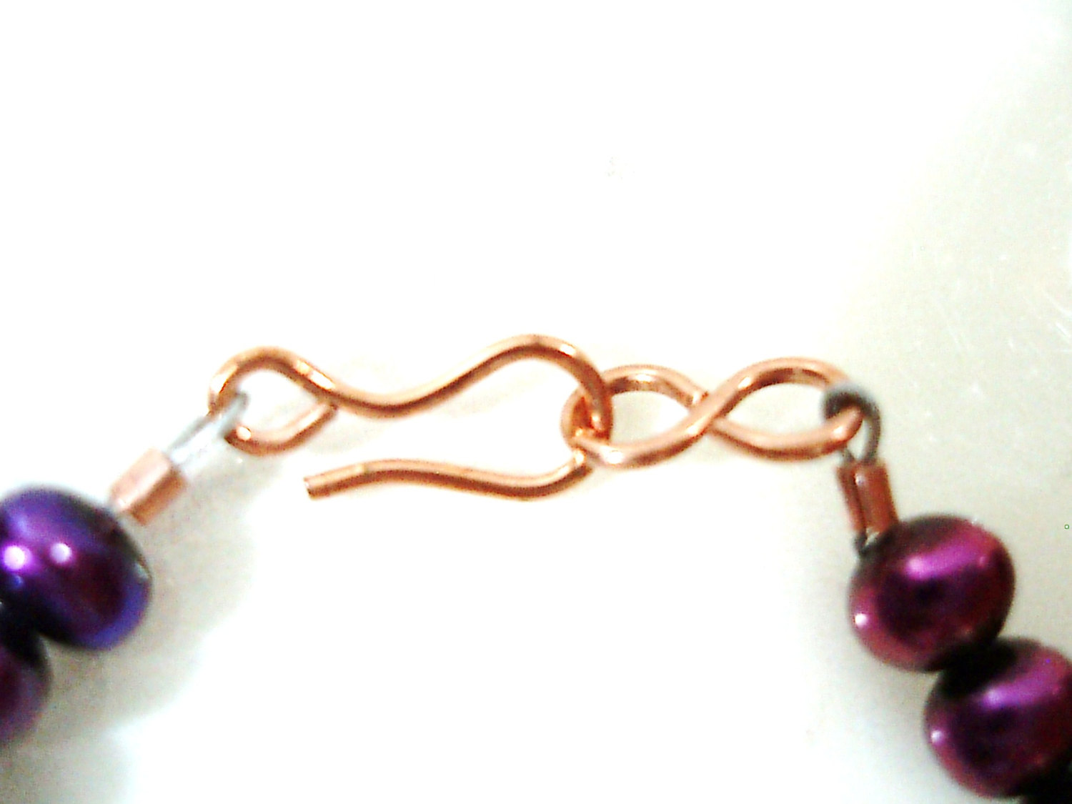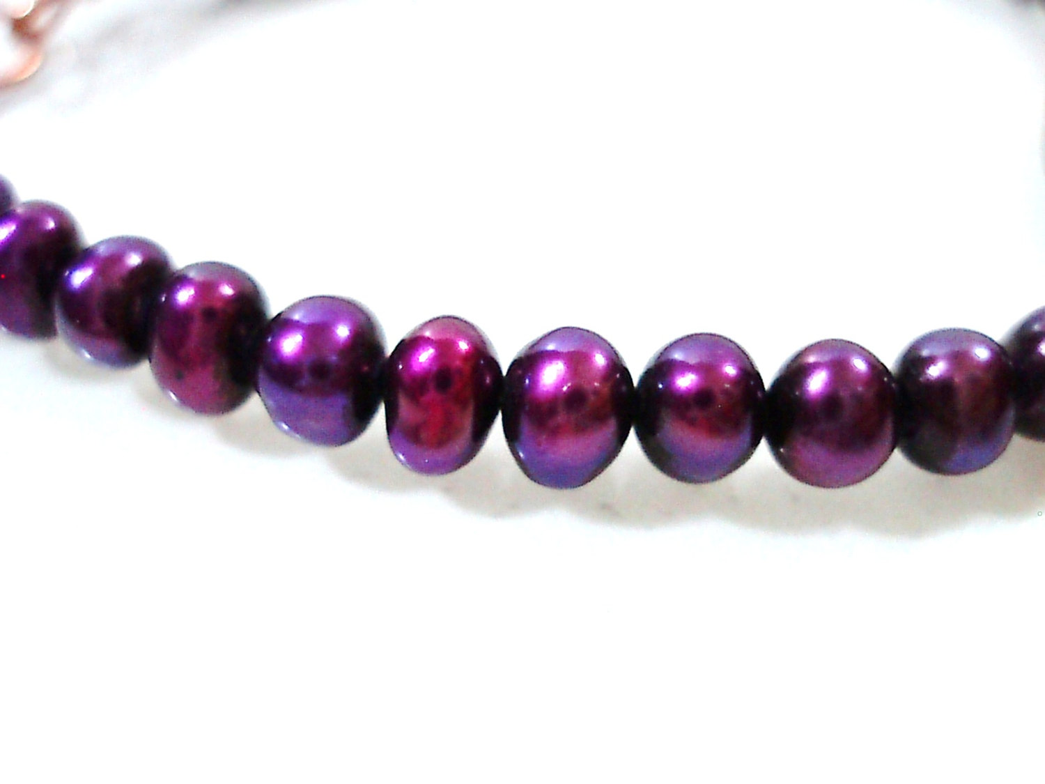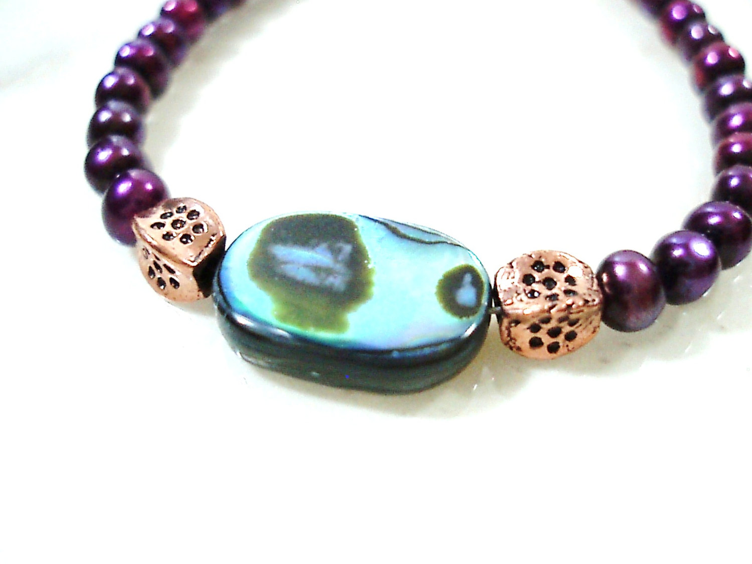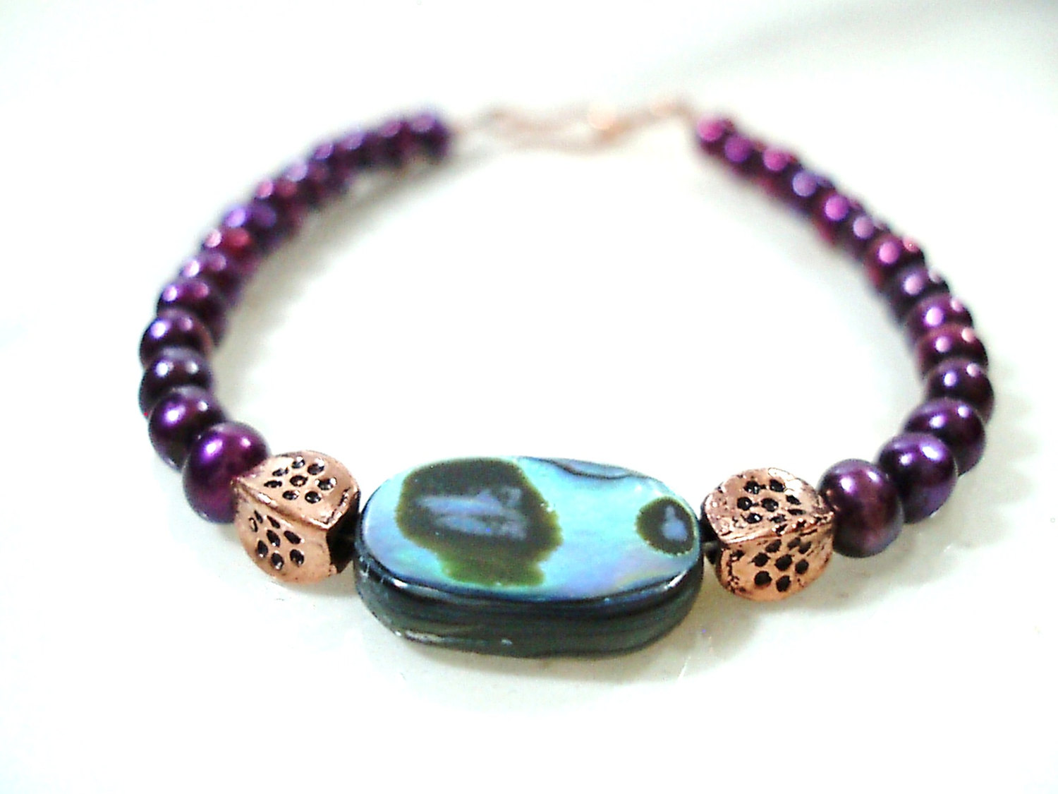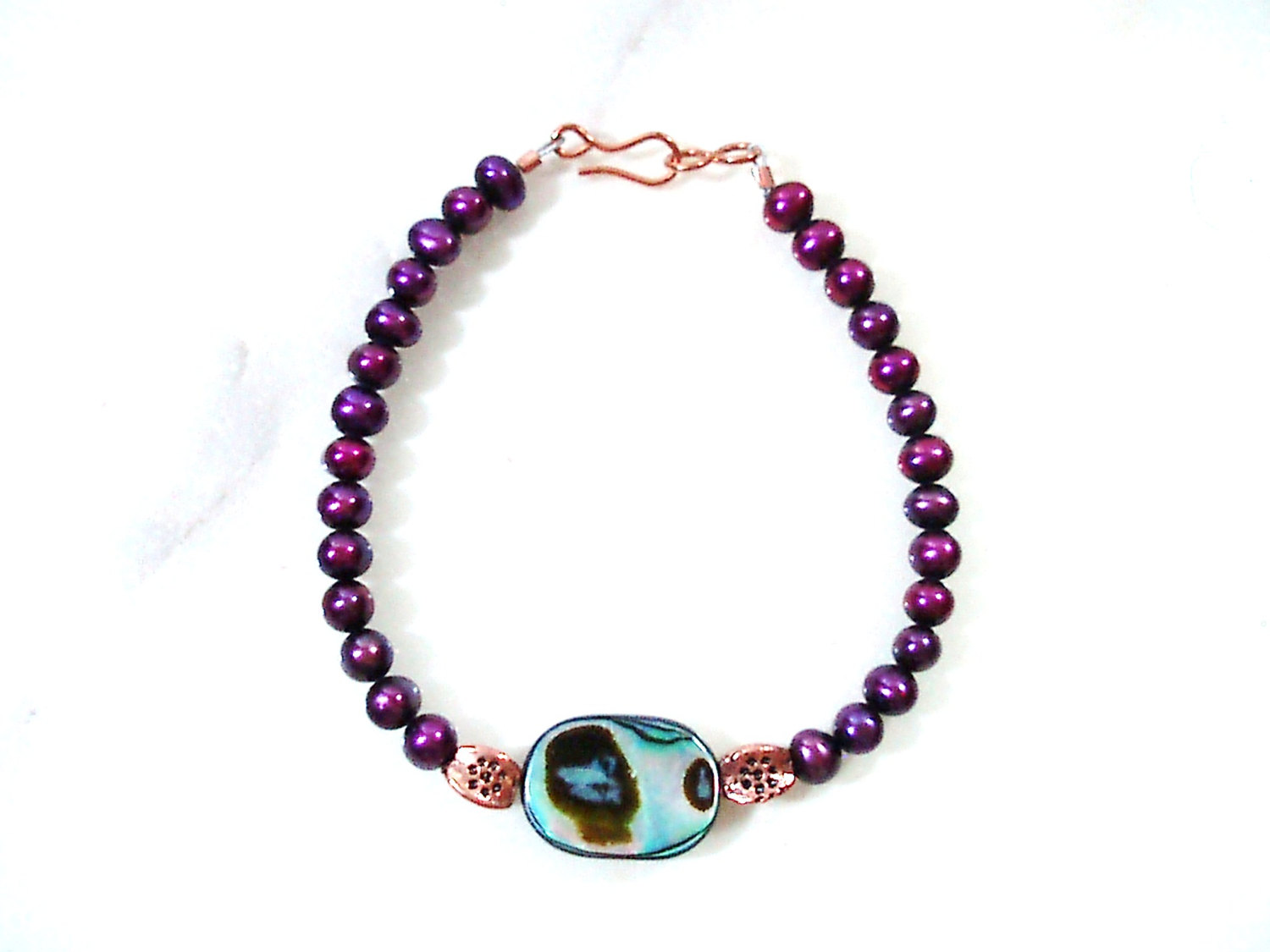A ring of purple pearls surround a large central abalone shell bead in this bracelet that is fit for a sea nymph. * Made with abalone, freshwater pearl, and copper beads; hook and eye clasp; 7-1/8" length.