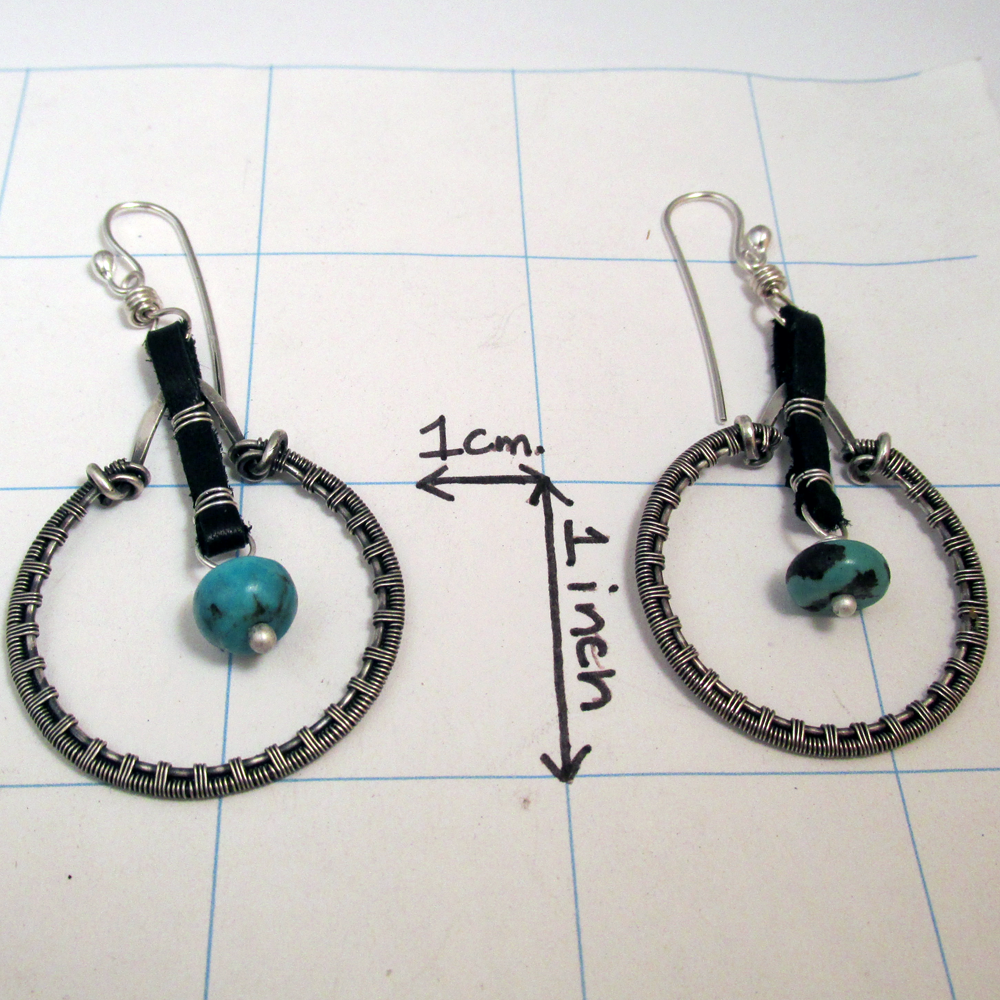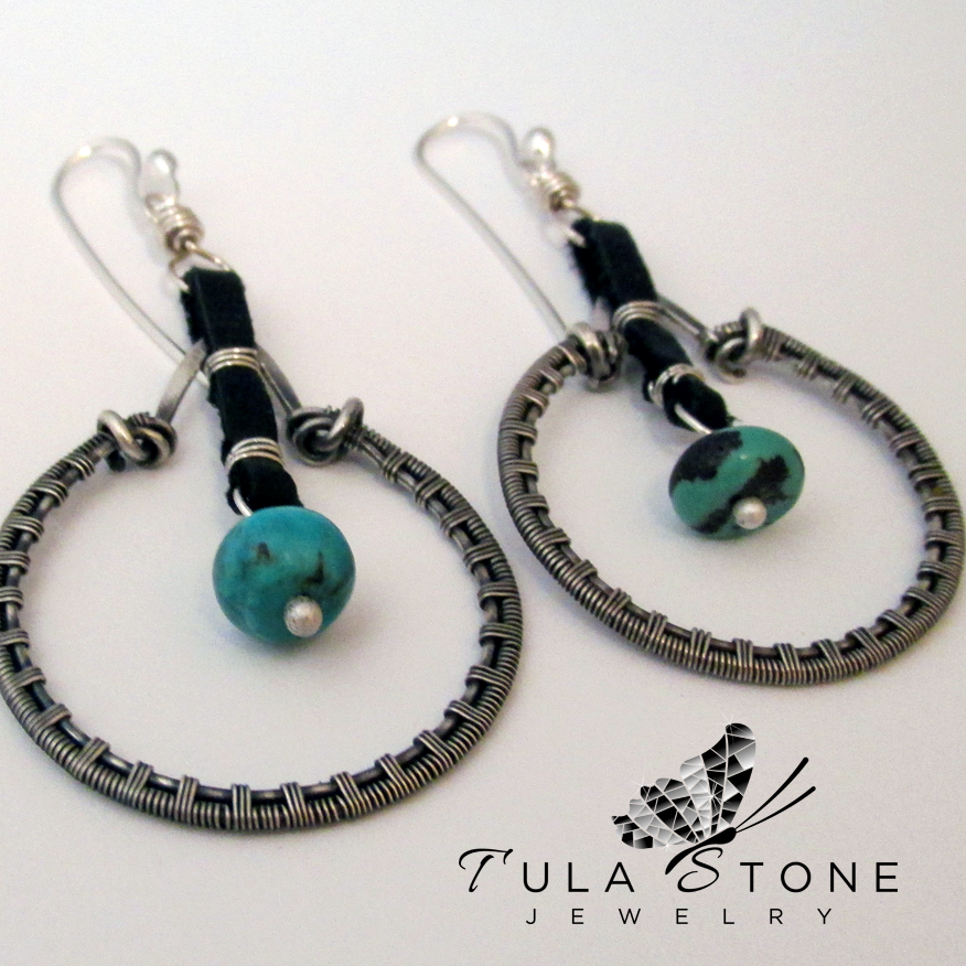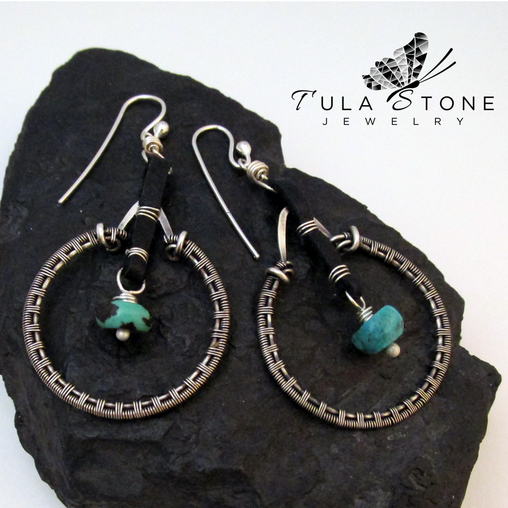 Indulge your inner cowgirl with these rustic dangles! Made with hand-woven Sterling, soft black leather, and New Mexico Turquoise beads.