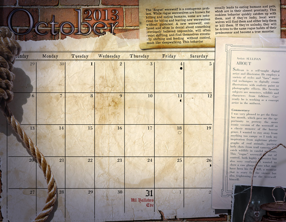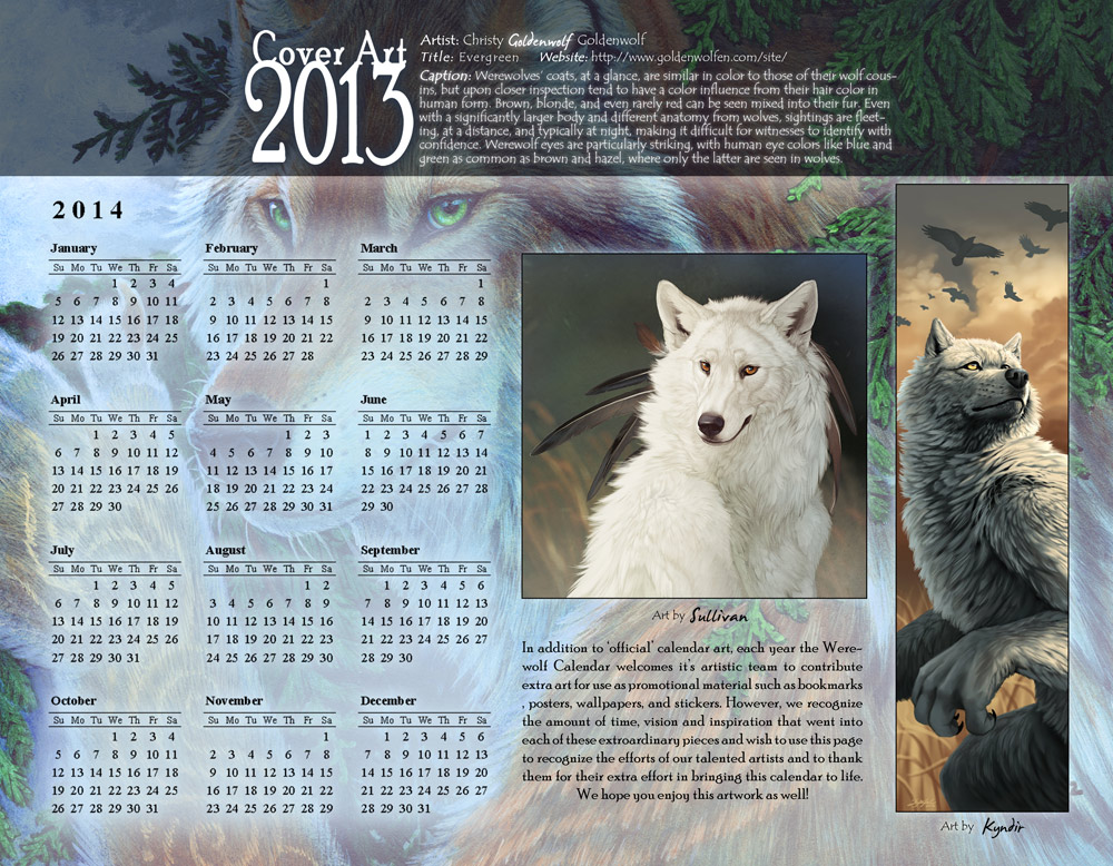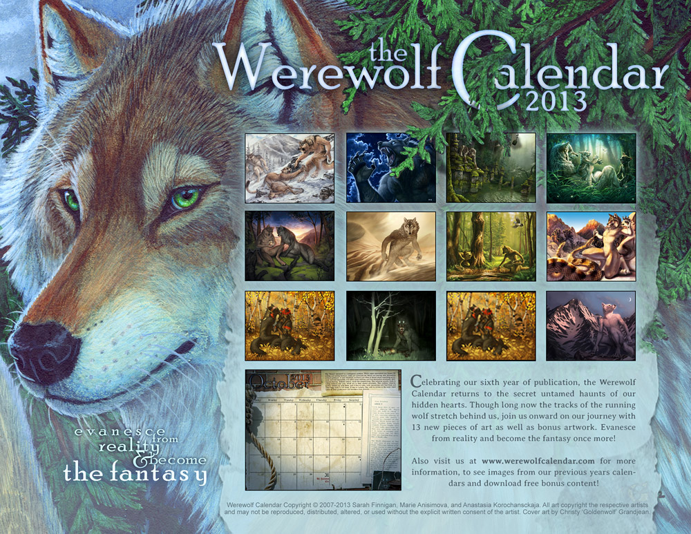 This is not a listing for the 2015 Werewolf Calendar. Click here for the latest edition! This listing is for the calendar from the: 2013 calendar year Take a journey into the fantastic realm of wilderness that resides within us all. This fantasy twist on the traditional werewolf lore takes on a whole new life in this vivid re-imagining of the werewolf. Featuring 13 original illustrations from a diverse body of talented artists that can only all be seen together in this publication. This limited edition run of 1000 calendars will never be reprinted again making this a wonderful piece of collectible art memorabilia for any werewolf enthusiast.