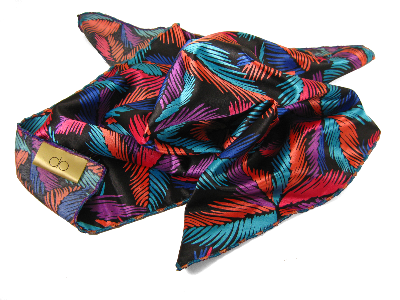 This LIMITED American-made bro's scarf was composed from a darling silkesque 100% polyester featuring a new wave palm leaf print that exudes Miami of the 80's. Trimmed with our custom tri-color rolled hem, this piece will compliment any arrangement from the 80's to now. 20" Scarf